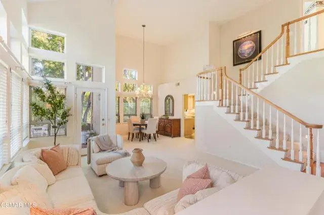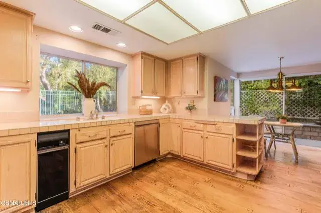 Located at the end of a quiet cul-de-sac in the sought-after High Meadows neighborhood of Wood Ranch, this spacious 5-bedroom, 3-bathroom home offers 3,153 sq ft of living space on an 8,200 sq ft lot with lush landscaping and mountain views. All major systems replaced within the last 5 years! The well-designed floor-plan includes a downstairs bedroom and full bath, ideal for guests or multi-generational living. Upon entry, you’re welcomed by soaring ceilings and an abundance of natural light from numerous windows. The neutral interior features a formal living and dining room, and a separate family room with a fireplace. The kitchen is equipped with a newer stove, refrigerator, and dishwasher, tile countertops, light wood cabinetry, and a breakfast nook that opens to the family room. A separate laundry room is located on the first floor. Upstairs includes three generously sized guest bedrooms and a full guest bath with dual sinks and a shower/tub combo. The large primary suite features vaulted ceilings, a sitting area with a fireplace, and expansive views of the surrounding trees and mountains. The en-suite bath includes a walk-in shower, sunken tub, dual vanities, ample storage, and a walk-in closet. The private backyard offers a patio area, built-in BBQ, and storage shed–ideal for outdoor entertaining. The oversized 3-car garage includes built-in storage, with a portion converted into a functional office space. Additional features include plantation shutters throughout most of the home, a newer AC system, water heater, and updated downstairs bath with porcelain tile flooring. Enjoy access to nearby hiking and biking trails, parks, and the Wood Ranch Country Club. Conveniently located near shops, dining, the 23 freeway, and the Ronald Reagan Library. Homes on this street rarely come to market–don’t miss this opportunity.