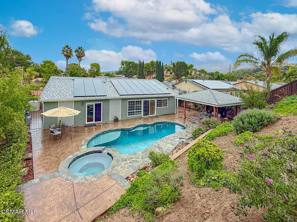 Absolutely Immaculate Single-Story Home!Welcome to this stunning 4-bedroom, 2-bath Hollow Hills home featuring a 3-car garage, sparkling pool and spa, and an unbeatable hilltop location. Just moments from Hollow Hills Fundamental School, this home offers beautiful views, exceptional privacy, and true pride of ownership.Inside, you’ll find a move-in ready home with dual-pane windows and sliders, wood-like tile flooring throughout, smooth ceilings, recessed lighting, and multiple ceiling fans. The remodeled guest bathroom features granite countertops. The generous sized kitchen offers plenty of storage and stainless steel appliances. Additional upgrades include a tankless water heater, a new water purification system, as well as a newer roof and rain gutters.The spacious living room showcases vaulted ceilings and a charming brick fireplace, while the large formal dining room fills with natural light, creating the perfect atmosphere for gatherings.The low-maintenance yard is ideal for relaxing and entertaining. The private backyard backs to open space and features a covered patio, an additional private covered area on the south side of the home, and a beautiful pool and spa with custom stonework and a stamped concrete patio. The front yard includes a lovely fountain and brick entryway.The primary suite offers its own slider leading directly to the backyard, providing easy access to the pool and patio areas. With no HOA, paid solar, thoughtful upgrades, and a location that truly stands out, this home shows like new. Come experience this exceptional property and fall in love!