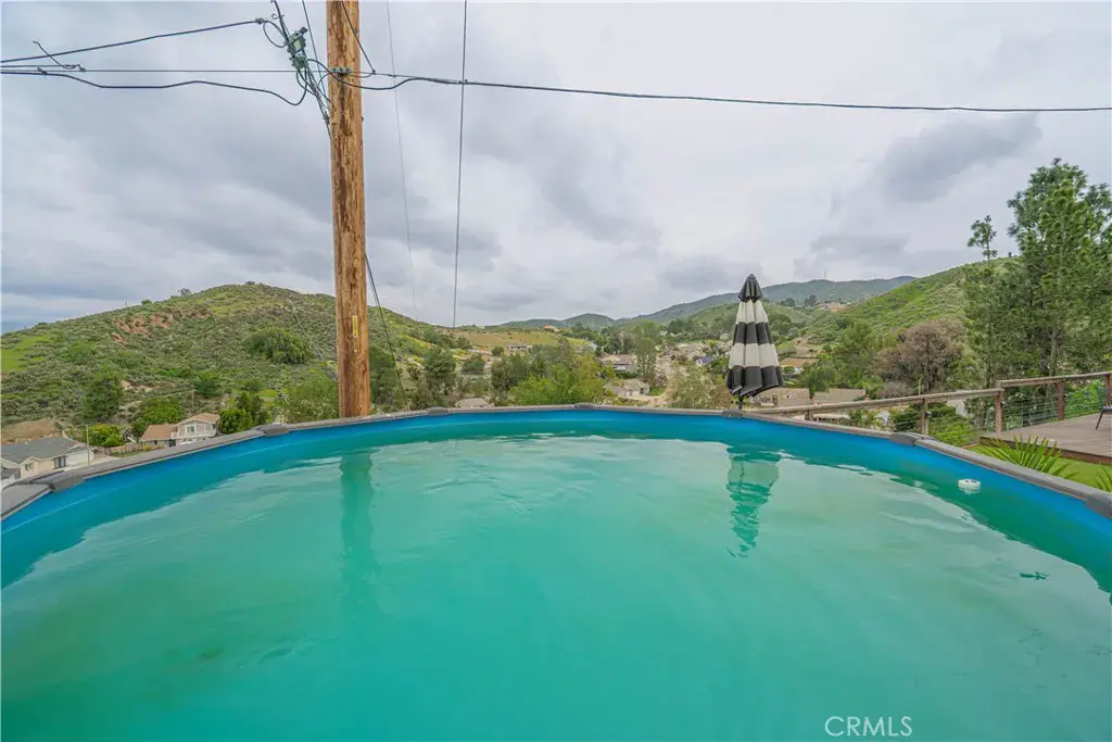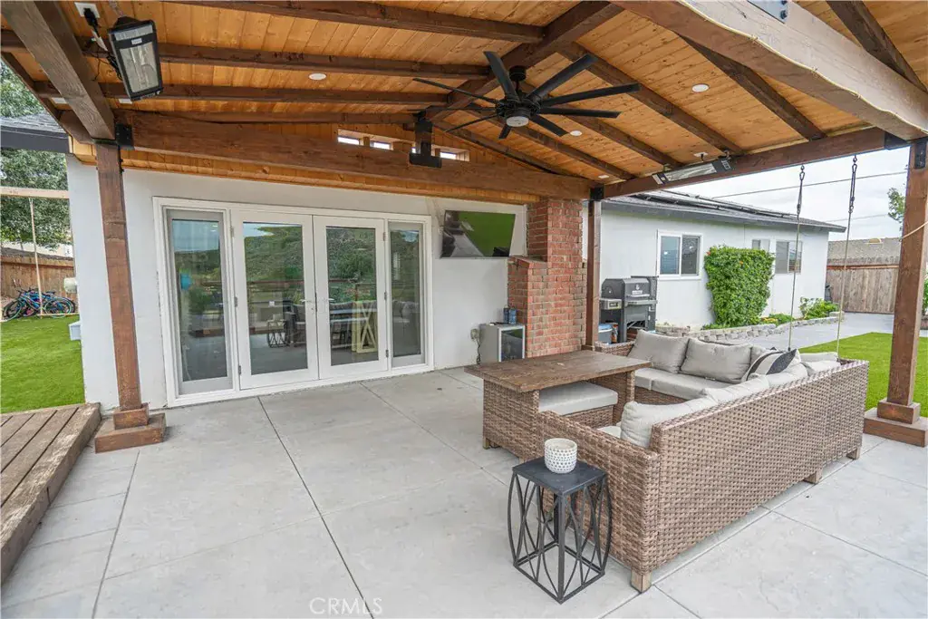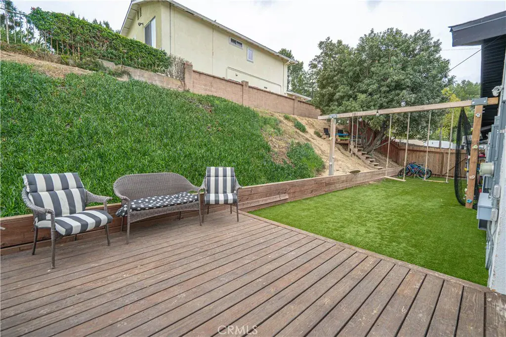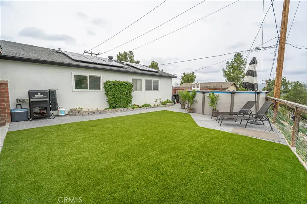 The 2024 backyard renovation includes turf with cooling sprinklers, 20’ x 20’ stamped concrete patio, vaulted covered patio with tongue-and-groove ceiling, dimmable lighting, heaters, oversized fan, multi-level deck, paver walkways, 14-foot above-ground pool, swing set with sports net, and a spacious treehouse.