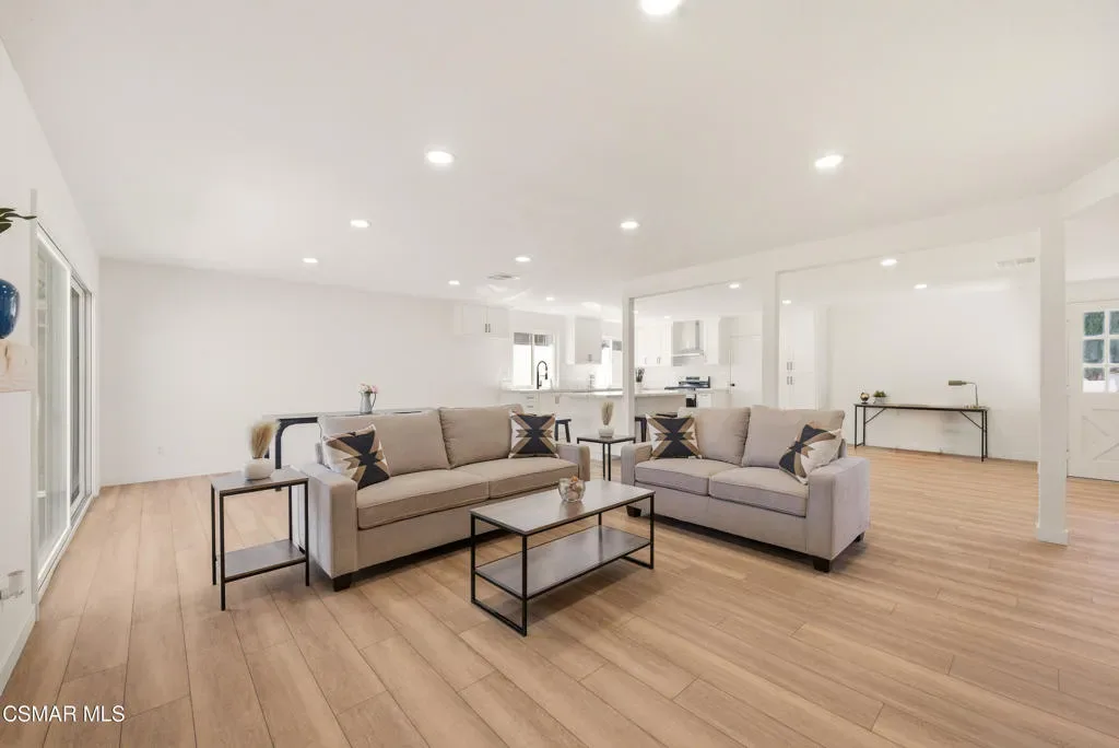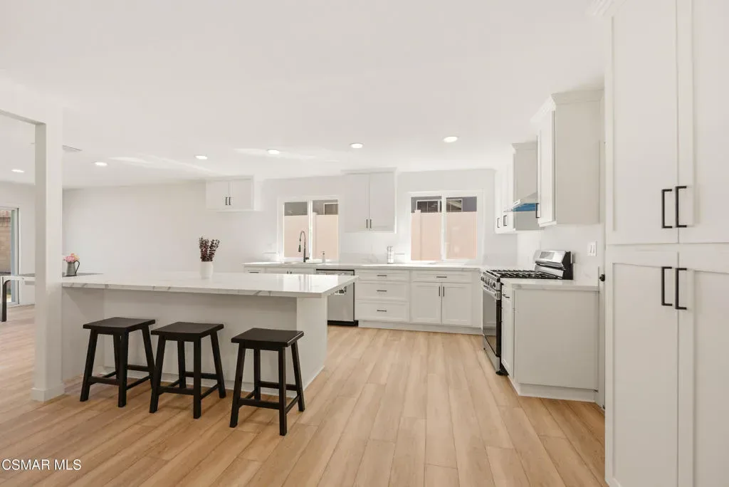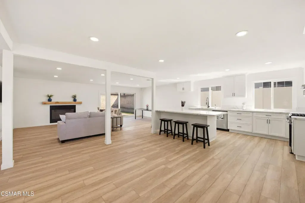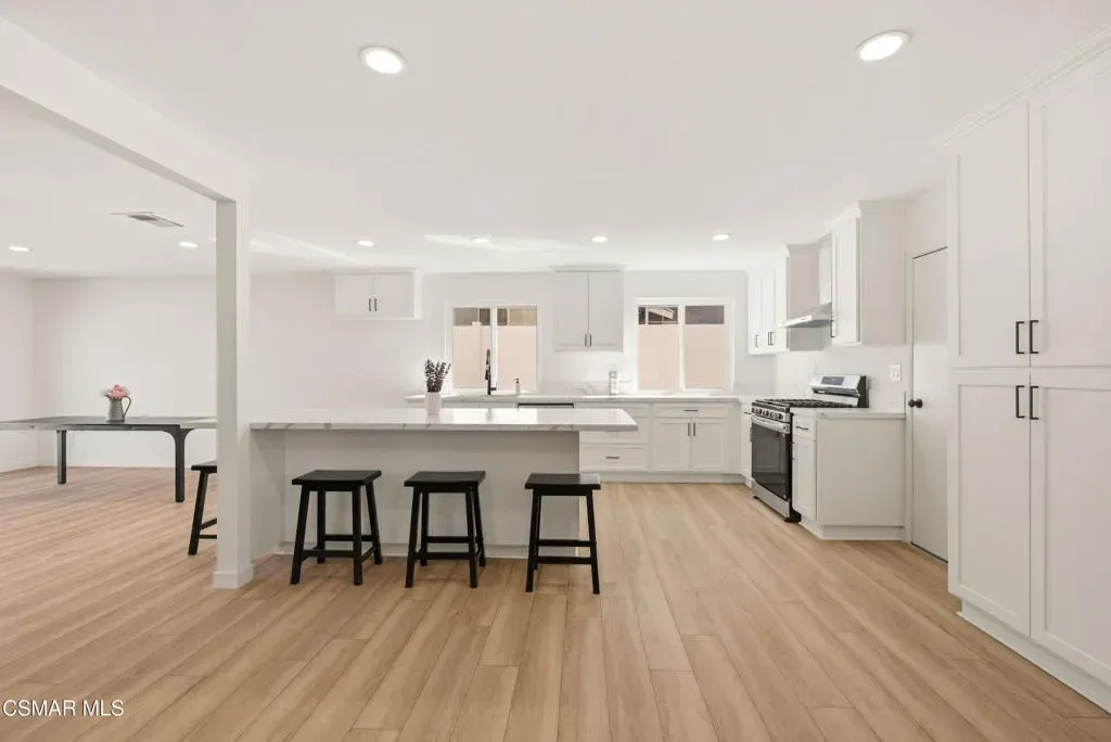 Situated on a corner lot in a little hidden pocket of Simi Valley, this fully remodeled, move-in ready 4-bedroom home has been thoughtfully redesigned with today’s Buyer in mind. Step inside and immediately notice the bright, open feel, enhanced by an open floor plan and an abundance of natural light throughout. The kitchen has been completely transformed into the centerpiece of the home, featuring a large island ideal for gathering and everyday living. It is complemented by quartz countertops, brand-new soft-closing cabinetry, stainless steel appliances, and recessed lighting. Both bathrooms have been upgraded with large-format tile showers and new vanities, creating a clean, modern look. Additional upgrades include wood-style flooring throughout, recessed lighting, a wood-burning fireplace, new dual-pane windows, and a new sliding glass door. Major system improvements include the addition of central air conditioning, a newly replaced furnace, and an upgraded 200-amp electrical panel. Fresh landscaping in both the front and backyard enhances the home’s curb appeal while creating a great space for outdoor enjoyment and entertaining. With all the work already completed, this is a rare opportunity to own a fully updated home without the wait or hassle.