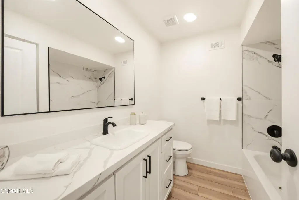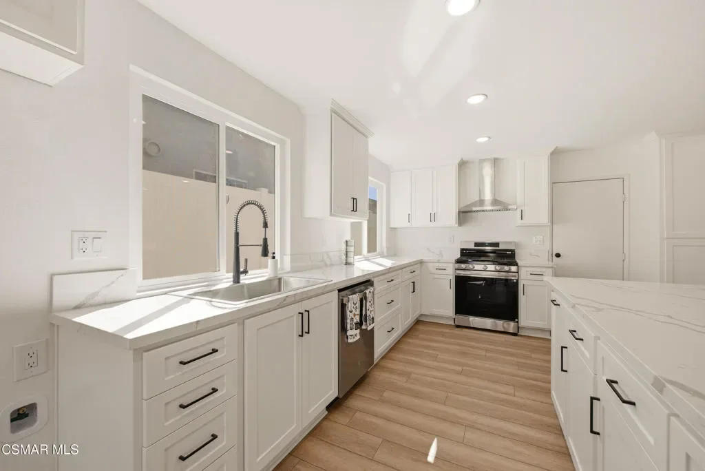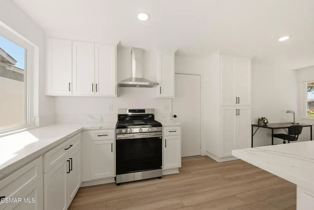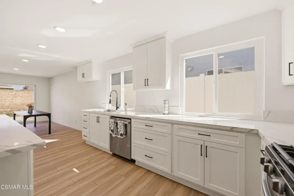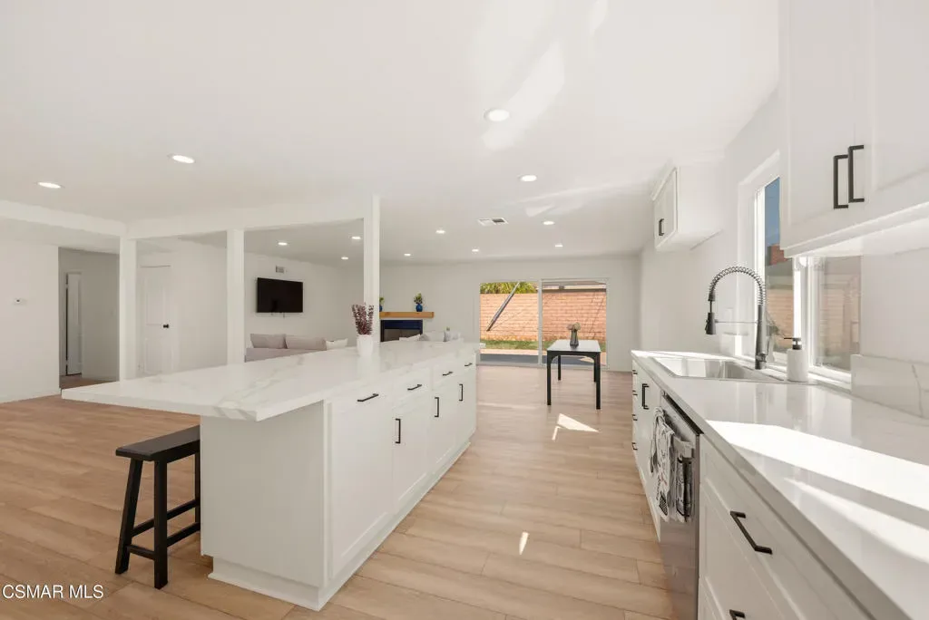 Situated on a corner lot in a little hidden pocket of Simi Valley, this fully remodeled, move-in ready 4-bedroom home has been thoughtfully redesigned with today’s Buyer in mind. Step inside and immediately notice the bright, open feel, enhanced by an open floor plan and an abundance of natural light throughout. The kitchen has been completely transformed into the centerpiece of the home, featuring a large island ideal for gathering and everyday living. It is complemented by quartz countertops, brand-new soft-closing cabinetry, stainless steel appliances, and recessed lighting. Both bathrooms have been upgraded with large-format tile showers and new vanities, creating a clean, modern look. Additional upgrades include wood-style flooring throughout, recessed lighting, a wood-burning fireplace, new dual-pane windows, and a new sliding glass door. Major system improvements include the addition of central air conditioning, a newly replaced furnace, and an upgraded 200-amp electrical panel. Fresh landscaping in both the front and backyard enhances the home’s curb appeal while creating a great space for outdoor enjoyment and entertaining. With all the work already completed, this is a rare opportunity to own a fully updated home without the wait or hassle.