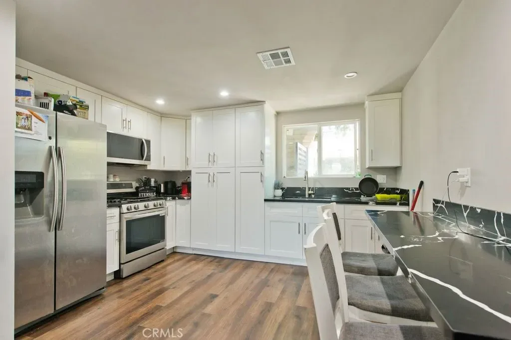Gorgeous Large Family House with a Pool and ADU!! The Main house is a five bedroom 3 bath home with four bedrooms upstairs and one downstairs. It features an open floor plan with recently remodeled kitchen and bathrooms. It also has Central heating and air conditioning, Dual pane windows, Owned Solar power production, High wood beam ceilings, Pool, Two fireplaces, Fruit trees and two covered patios. The ADU has its own entrance and is attached to the main house but doesn’t allow access. It is a Two bedroom and Two bath unit this is approximately 1000 sq. ft. . It is perfect for a rental income or keeping family close. This home is Located North of the 118 freeway close to many different shopping centers and parks.