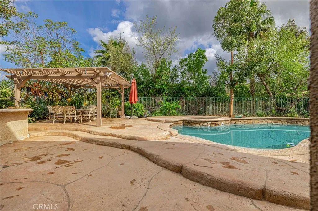 The resort-style backyard is designed for year-round enjoyment and entertaining. At its center is a PebbleTec pool and spa, surrounded by mature landscaping and low-maintenance turf. Outdoor living is enhanced by a pergola-covered dining area and built-in BBQ island, while a half basketball sport court adds a fun recreational feature. A convenient exterior-access bathroom serves the pool area.
