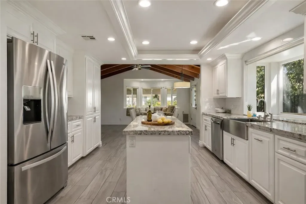 A great opportunity to purchase a property with a rare combination of space, versatility, and long-term value on an expansive 21,500+ sq. ft. lot. The main residence features 4 bedrooms and 3 bathrooms (2350 sqft), and is complemented by a fully separate 2-bedroom, 2-bath ADU (approx. 1000 sqft) with its own private entrance—perfect for extended family, rental income, or a private workspace. Step into a welcoming foyer with custom tile flooring and recessed lighting, leading into a home rich in character. The living and dining areas showcase vaulted ceilings with striking exposed wood beams, creating warmth and architectural appeal, while large windows fill the home with natural light and scenic views of the surrounding grounds. The gourmet kitchen is both functional and inviting, featuring upgraded cabinetry, granite countertops, a center island, and a bay window over the sink that provides a wide, picturesque outdoor view. A highly desirable downstairs bedroom and full bathroom offers flexibility for guests, multi-generational living, or a private office space. Relax in the inviting family room with a charming brick fireplace, or gather in the dining area with a built-in window seat—perfect for everyday living and entertaining. Recent upgrades include new air conditioning and heating systems for year-round comfort. The spacious primary suite includes a walk-in closet, along with a convenient upstairs laundry chute leading to the separate downstairs laundry room. Step outside to a private, park-like setting featuring 18 mature avocado trees, along with persimmon, Minneola orange, and Meyer lemon trees—creating a serene and productive outdoor retreat. Additional highlights include ample storage and an attached 3-car garage. Properties with this combination of land, flexibility, and income potential rarely come to market. Select interior photos of the main residence have been virtually staged to help illustrate the home’s potential and possible furniture layout. A truly special property— this is a must-see!