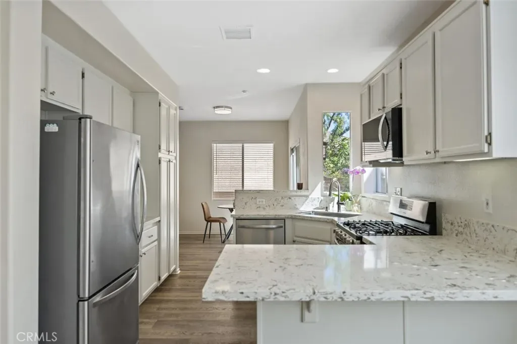 Located in a beautiful gated community, this turnkey residence offers 3 bedrooms, 2.5 bathrooms, and a prime setting on a quiet street. Designed for both comfort and style, the home is filled with natural light, with the living area, kitchen, and breakfast nook seamlessly flowing together to create an inviting, open-concept space. The kitchen is thoughtfully updated with elegant quartz countertops and opens effortlessly to the living and dining areas perfect for everyday living and entertaining. A convenient powder room is located downstairs, while upstairs features three spacious bedrooms and well-appointed bathrooms, including a primary suite with a recently completed custom closet by Closet World. Additional highlights include a Nest thermostat, new dishwasher, new kitchen faucet, updated microwave, and mature fruit trees. Every inch of this home has been carefully reimagined to reflect refined design and effortless livability. The attached 2-car garage offers direct access for added convenience. Step outside to your private backyard retreat, complete with charming lemon trees and ample space to relax or entertain. Residents of this sought-after Simi Valley gated community enjoy resort-style amenities, including a sparkling pool and spa, beautifully maintained parks, and basketball courts enhancing both lifestyle and leisure.