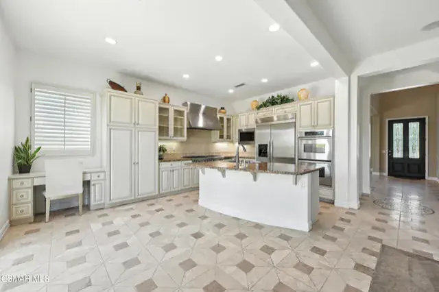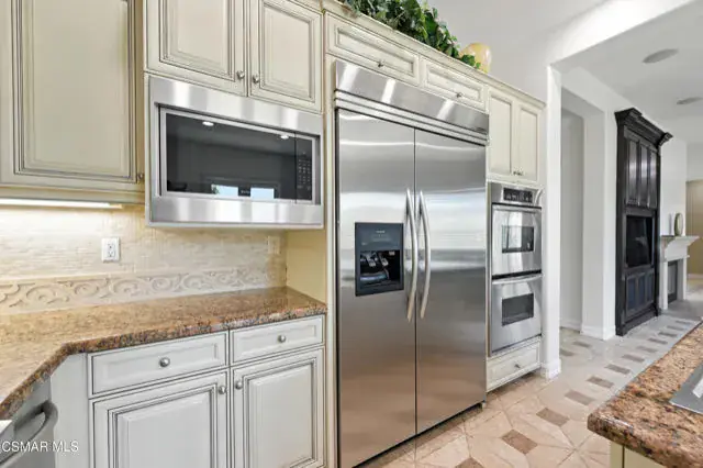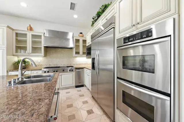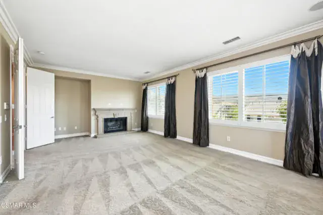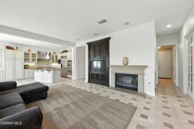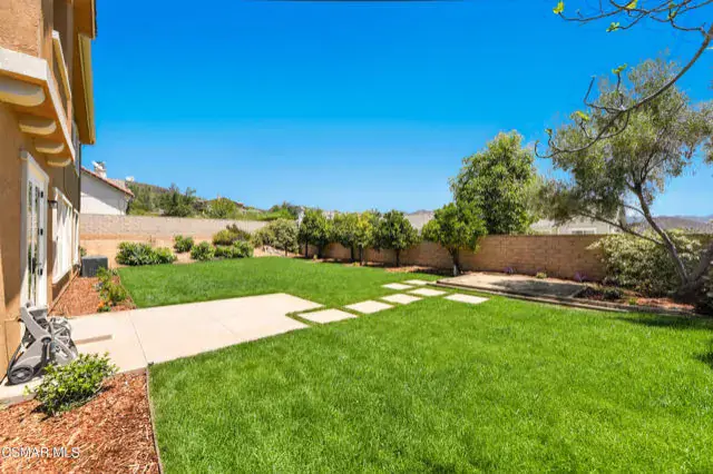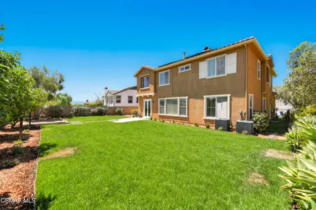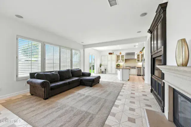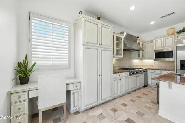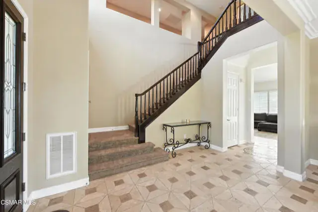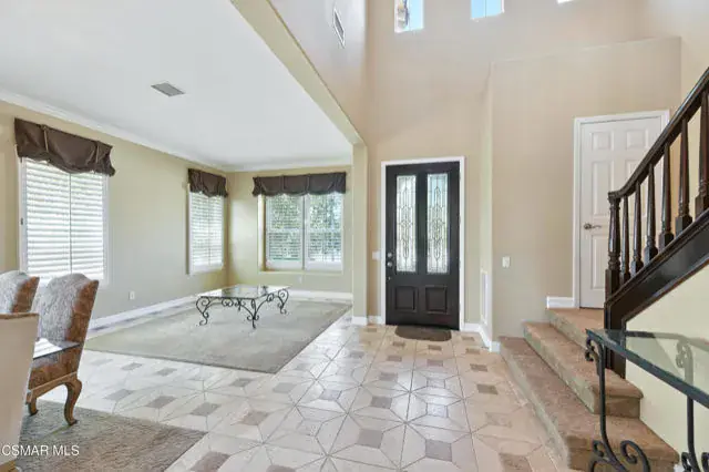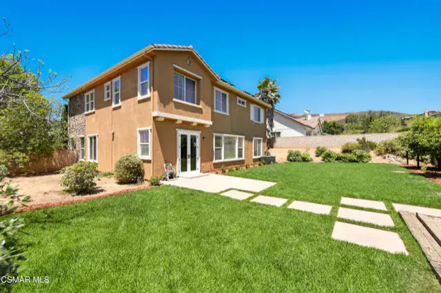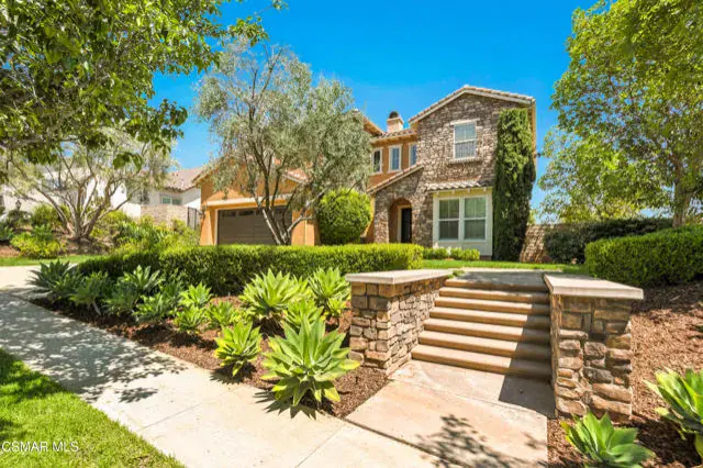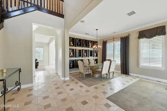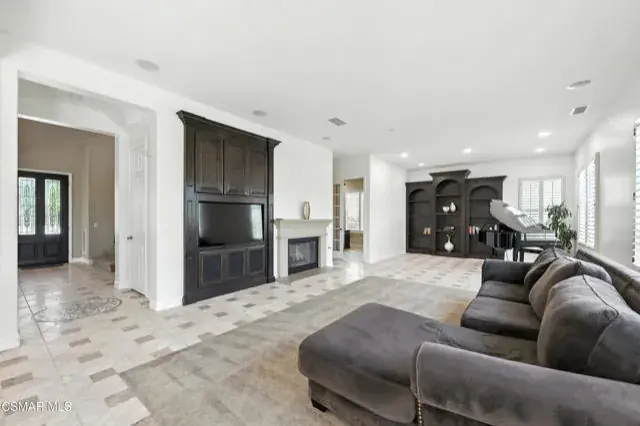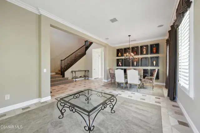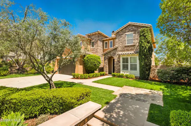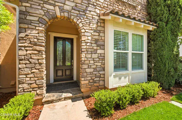 HOME HAS VA ASSUMABLE LOAN AT LESS THAN 3%! Step into this extensively upgraded former model home, offering over 3,200 square feet of thoughtfully designed living space and located on a spacious 10,454 square foot lot in one of Simi Valley’s most desirable neighborhoods.As you enter, soaring ceilings, crisp crown molding, and plantation shutters set an elegant tone. Travertine and marble flooring guide you through the main level, where you’ll find a formal living space that transitions seamlessly into a refined dining area with inset display shelving and downlighting–perfect for entertaining.The heart of the home is the chef’s kitchen, featuring granite countertops, custom cabinetry, a large center island with a sink, and high-end KitchenAid stainless steel appliances, including a 6-burner gas range and a new microwave. There’s both a breakfast bar and a cozy nook for casual dining. The kitchen flows into the spacious family room, where recessed lighting, built-in bookcases, a custom entertainment center, surround sound, and a warm fireplace create a welcoming atmosphere.Tucked just off the main living area is a sophisticated home office that can double as a downstairs bedroom, with French glass doors, built-in cabinetry, and a custom wine rack. Nearby, a full bathroom features marble counters and flooring, offering both style and function for guests. Also on the main level, the well-appointed laundry room includes travertine counters, built-in cabinetry, and a sink, combining convenience with elegant finishes.Upstairs, the luxurious primary suite offers double door entry, sweeping views, and a tranquil retreat complete with custom draperies, plantation shutters, and an electric fireplace. The primary bath includes a stall shower, oversized garden tub, and an expansive double-sided walk-in closet with natural light. Three additional bedrooms complete the upper level, each designed with comfort, style, and generous closet space.This home also boasts exceptional accessory features designed for comfort and efficiency. A fully owned 12,210-watt solar system significantly reduces energy costs. Dual-zone A/C units were replaced in 2021 for optimal climate control. The beautifully manicured front and rear yards feature fresh sod and brand-new drip and sprinkler lines, and the oversized two-car garage is fully finished for additional functionality.With timeless finishes, thoughtful upgrades, and energy-saving amenities throughout, this residence offers the perfect blend of elegance, practicality, and California living.