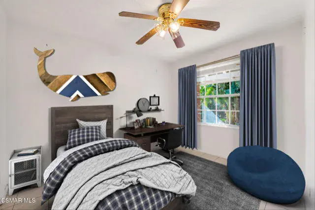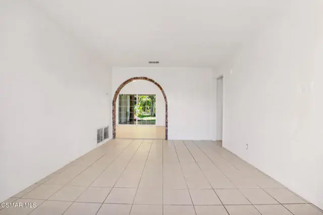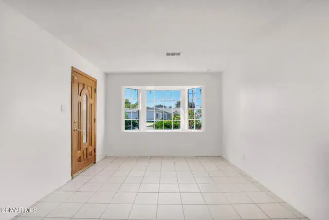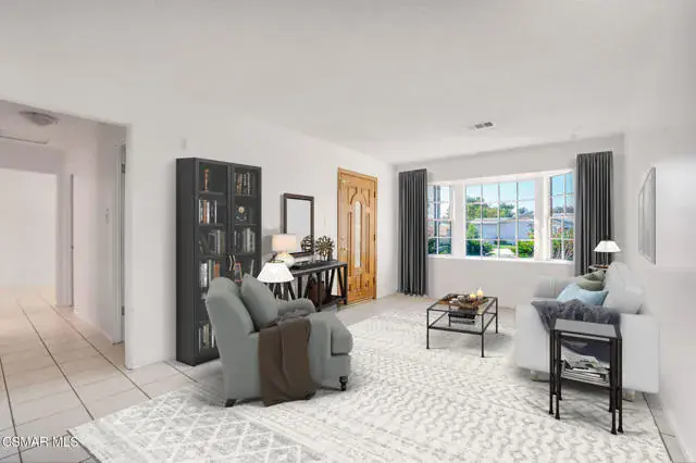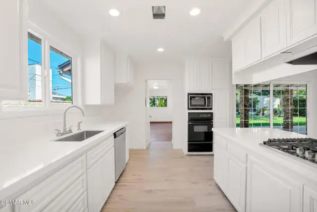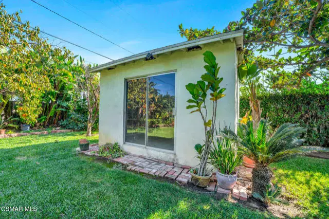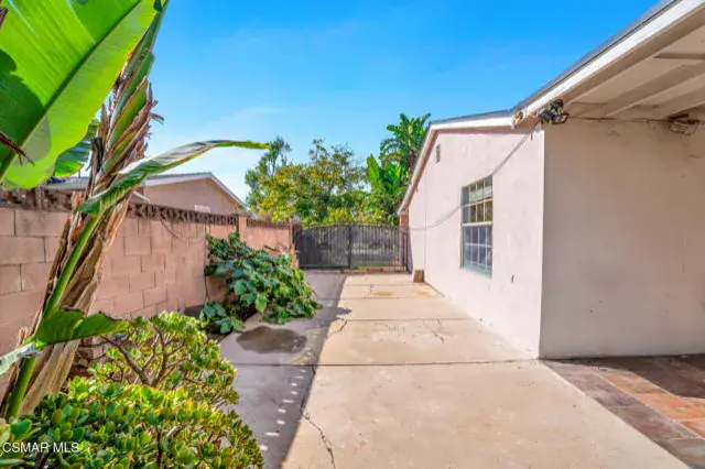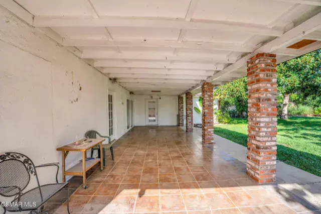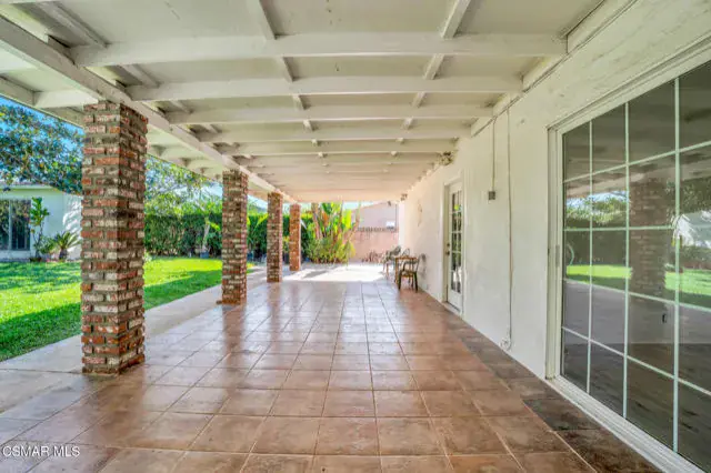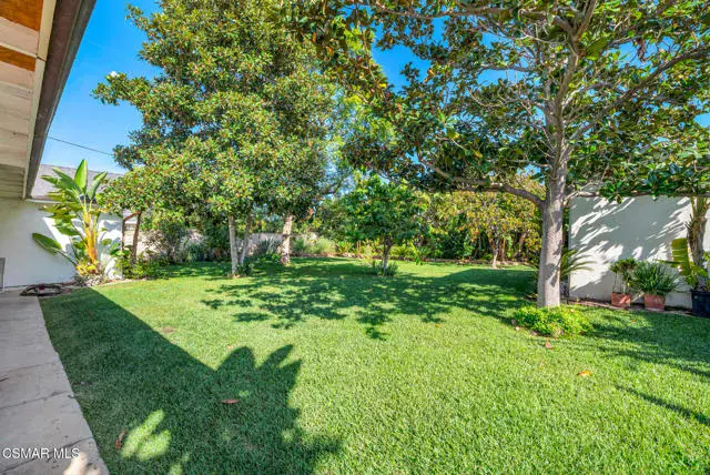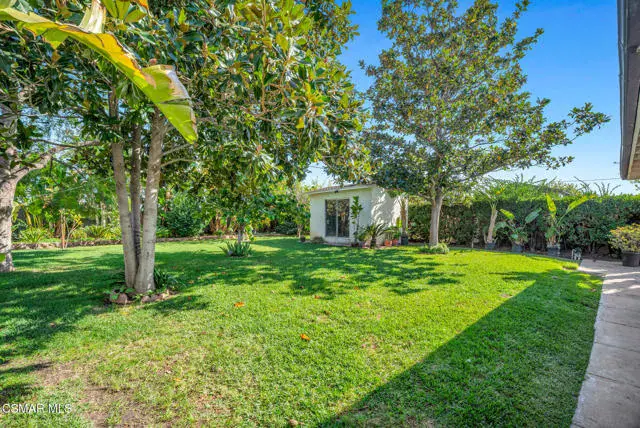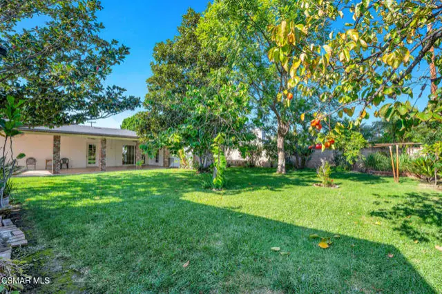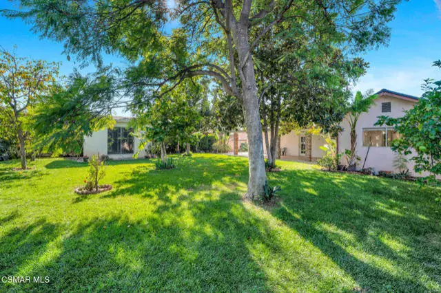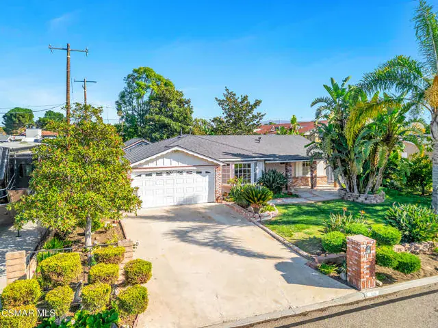 Welcome to this charming single-story home located in an established Western Simi Valley neighborhood. Offering 3 or 4 bedrooms and 2 bathrooms across 1,399 sq. ft. of living space on a large 10,018 sq. ft. lot with gated RV parking, this home is clean, fresh, and move-in ready. A lushly landscaped front yard with brick accents and a large covered porch creates a welcoming first impression. Inside, the light-filled living room features tile flooring, a bay window overlooking the front yard, and a radius brick-accented throughway leading to the living room. The light and bright kitchen is open to the dining room and features white cabinets, quartz countertops, recessed lighting, a farmhouse-style sink, a breakfast bar, and direct access to the garage. Kitchen appliances include a newly installed Frigidaire dishwasher, a 5-burner gas range, and a built-in microwave and wall oven. The dining room opens to a full-width covered patio with brick pillars, an ideal spot for outdoor dining or relaxation overlooking the private backyard with fruit trees including persimmon, orange, lemon and avocado, a large grassy area, and a detached workshop–perfect for hobbies or extra storage (no electricity). All bedrooms include ceiling fans for added comfort, with the fourth family room/bedroom addition offering dual closets and a glass-paned French door providing direct access to the backyard. Both bathrooms feature a shower-over-tub and updated fixtures. Additional highlights include dual-paned windows and slider throughout, updated HVAC, copper plumbing, and a 2-car garage with storage cabinets and laundry hookups. Thoughtfully maintained and move-in ready, this home offers a comfortable blend of charm, function, and outdoor enjoyment–a wonderful place to call home.