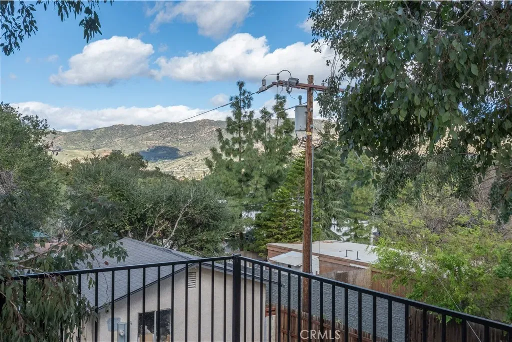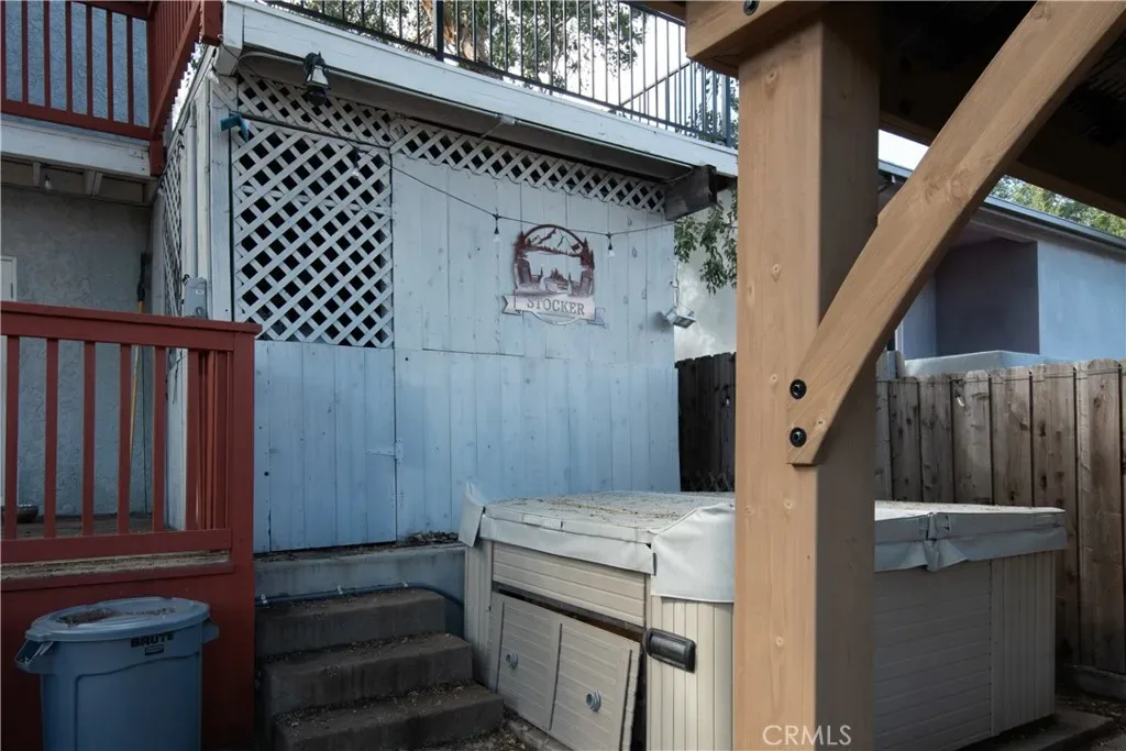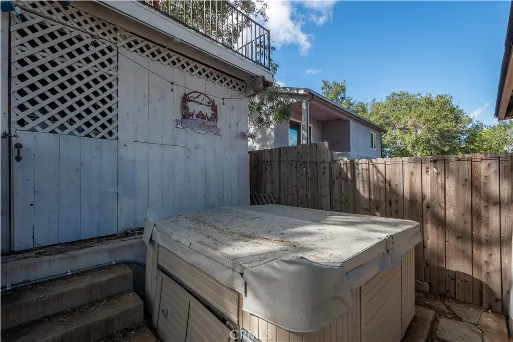 The exterior offers a private backyard with deck, spa and patio areas, wood fencing, and neighborhood and tree/wooded views. A storage shed/garage provides added utility.
