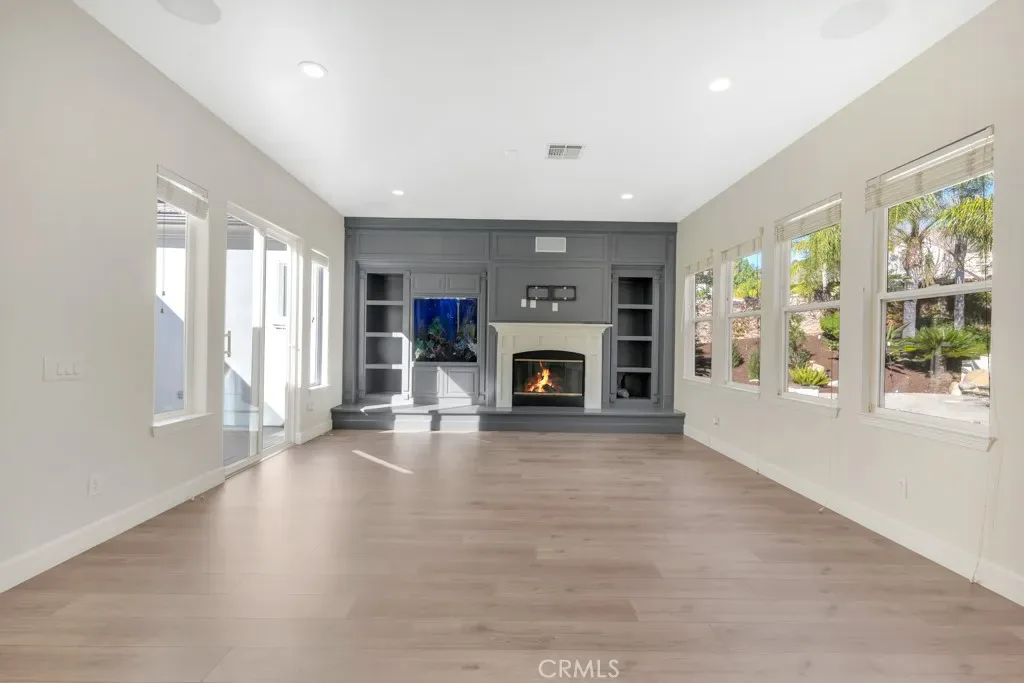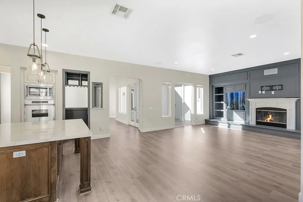 Located on a premium corner lot, the home welcomes you with a gated courtyard and a bright, open interior featuring soaring ceilings, new flooring, and abundant natural light. The fully reimagined gourmet kitchen stuns with quartz counters, custom cabinetry, SubZero & Viking appliances, and a spacious butler’s pantry, all opening to an inviting family room with built-ins and a fireplace.