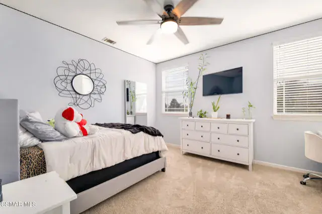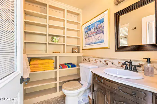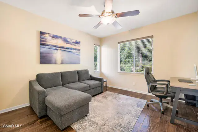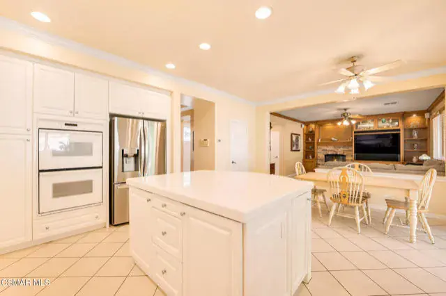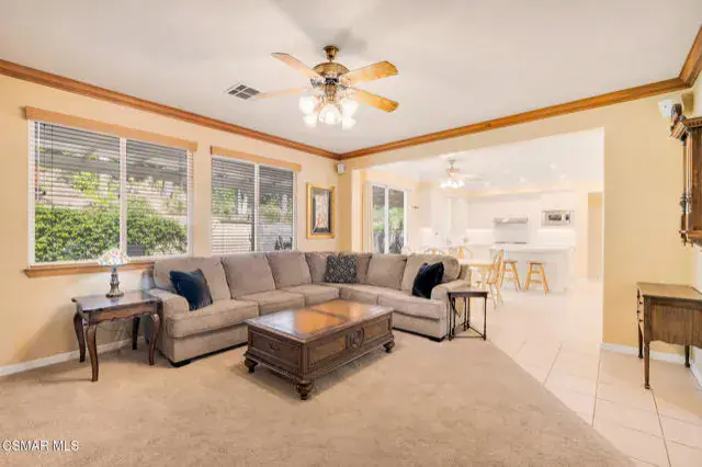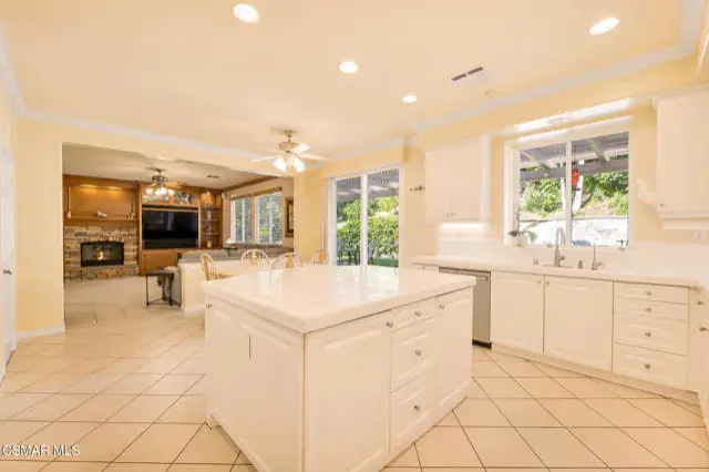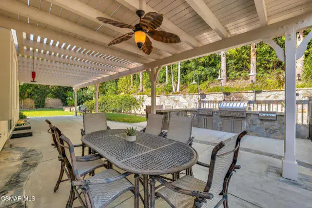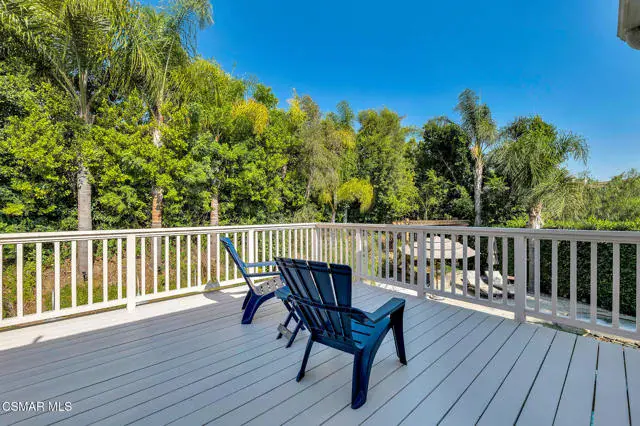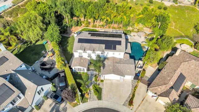 A Private Cul-de-Sac Retreat in Prestigious Silverthorne. Set on a prime cul-de-sac lot in one of northeast Simi Valley’s most desirable hillside communities, this beautifully appointed Silverthorne Plan 2 combines luxury living, everyday comfort, and a lifestyle surrounded by scenic trails, neighborhood parks, and the Simi Hills Golf Course just moments away. Featuring 5 bedrooms, 3.5 baths (one bedroom and full bath down) and resting on a 19,166 sq. ft. lot, the property makes a lasting first impression with lush landscaping, palms, roses, and colorful flowers framed by tall hedges for privacy. A three-car driveway with river rock and brick accents leads to a white iron gate and serene courtyard patio with a bubbling fountain. Brick pillars, outdoor lighting, and a tall etched-glass entry door set the stage for soaring ceilings and light-filled interiors. The formal living and dining rooms are welcoming, with tall windows, crown molding, and a sense of openness ideal for entertaining. At the heart of the home, the kitchen combines style and function with crisp white cabinetry, tiled floors, a large center island with seating, a spacious walk-in pantry, and a sunny garden window overlooking the backyard. Top-of-the-line appliances include a 5-burner cooktop, built-in microwave, double ovens, and side-by-side refrigerator, making this kitchen as functional as it is inviting. The adjoining dining area opens to the patio, while the family room offers a custom wood entertainment niche, a raised hearth stacked stone fireplace, and wide windows that frame the outdoor retreat. The floorplan includes a convenient downstairs bedroom and full bath, plus a laundry room with sink, cabinets, and direct access to the three-car garage. Upstairs, the primary suite is a private sanctuary with a large balcony overlooking the backyard. The en-suite bath offers dual vanities, a soaking tub, a glass-enclosed shower, a makeup station, and a walk-in closet. Three additional bedrooms upstairs are generously sized and served by a hall bath with dual sinks and a separate tub and shower. The backyard is a true showpiece with a Pebble Sheen saltwater pool and raised spa accented by stone and river rock finishes, cascading waterfalls, and lush privacy landscaping. An outdoor kitchen with granite island seating, refrigerator, sink, BBQ, and searing unit makes entertaining effortless, while the covered patio, grassy side yard, and hillside orchard filled with avocado, peach, lime, tangerine, and kumquat trees add to the sense of California living. An outdoor bathroom serves the pool area, and a shaded hammock nook invites relaxation. Every detail, from the river rock hardscape to the thoughtfully placed landscape lighting, creates a private resort setting perfect for day or night enjoyment. Additional highlights include a 34-panel solar system – owned (not leased), dual-pane windows, recessed lighting, intercom, alarm system, generator transfer switch, under stairs storage, mountain views, newly glazed tile and showers in all bathrooms, and newer water heater. Included in the sale are the kitchen refrigerator, washer and dryer, garage refrigerator and freezer, and family room TV with surround sound. Combining elegant interiors, exceptional curb appeal, and a backyard designed for entertaining, this residence offers not only a home but a lifestyle in one of Simi Valley’s most sought-after communities.
