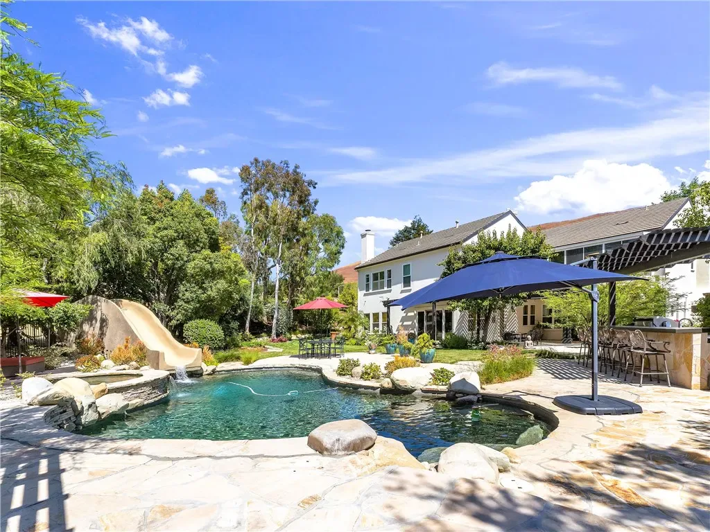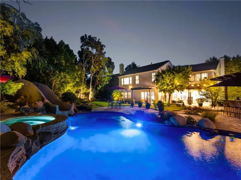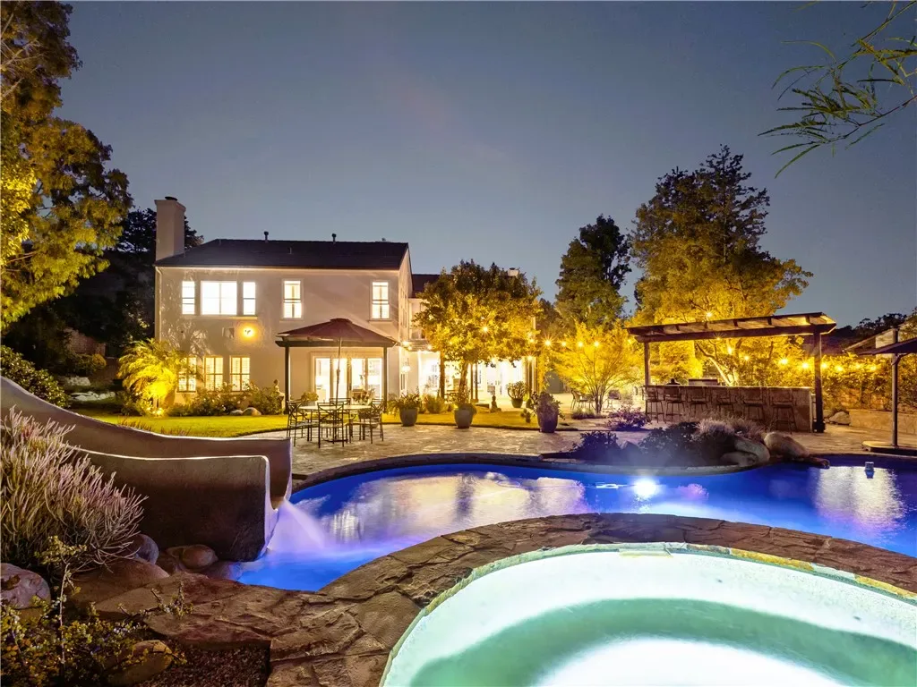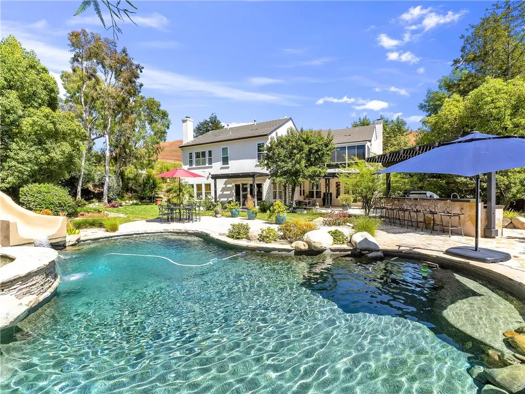 Welcome to your private paradise… Where luxury meets tranquility in this stunning 5-bedroom, 5-bathroom estate with an additional bonus space, spanning 3,725 square feet. Situated on an expansive 21,573 square foot exclusive lot, this property offers an unparalleled resort-like living experience. As you enter through the private gated compound, you’ll immediately appreciate the exclusivity and serenity this home provides. Enjoy ultimate privacy with no neighbors directly behind you and only one neighbor to a single side, ensuring a peaceful retreat. The incredible entertainer’s backyard is a true oasis, designed for unforgettable gatherings and relaxation. Dive into the sparkling pool, unwind in the soothing spa, or experience the thrill of your very own waterslide. The chef’s dream outdoor kitchen, complete with top-of-the-line appliances, makes al fresco dining a delight. Multiple sitting spaces invite you to lounge and enjoy the breathtaking views, all while seamlessly opening to protected open space, offering a sense of boundless freedom. Inside, discover a meticulously remodeled dream kitchen, a culinary masterpiece featuring high-end finishes and appliances that will inspire your inner chef. With over $375,000 invested in upgrades, this home truly shines. The home boasts amazing manicured landscaping, creating a picturesque setting that enhances its curb appeal. Step inside to find high ceilings that elevate the sense of space and light, complemented by a beautifully maintained interior with a neutral palette, ready for your personal finishes. This home is nestled in a quiet, sought-after neighborhood, offering a serene ambiance while being conveniently close to exceptional dining, diverse shopping options, highly-rated schools and just minutes from the San Fernando Valley. This isn’t just a home; it’s a lifestyle. Experience the feeling of living at a luxurious resort every single day.