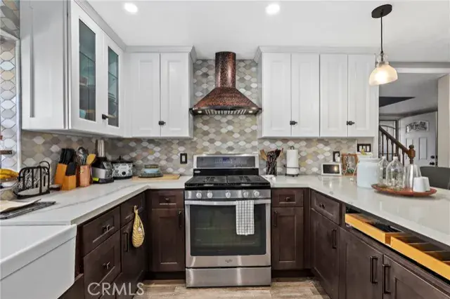 The main level features a fully remodeled 2021 kitchen, thoughtfully redesigned with a ceramic farmhouse sink and copper faucet, quartz countertops, designer stone backsplash, new cabinetry with a dedicated coffee bar, a custom vent hood, recessed lighting, an L-shaped island, and a newer LG dishwasher. The kitchen remodel also included repiping and electrical upgrades, along with new deluxe plank flooring through the entryway.