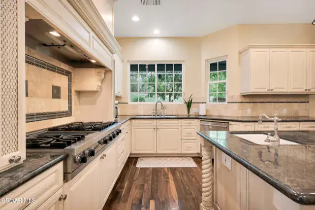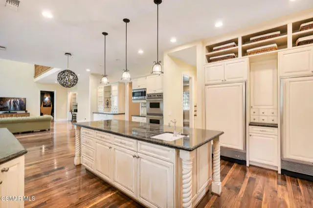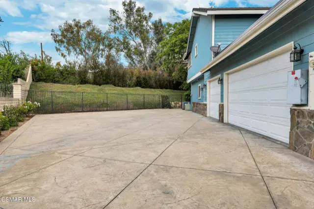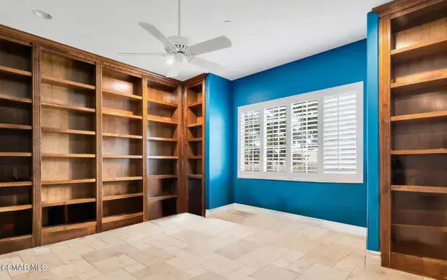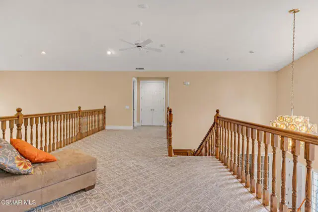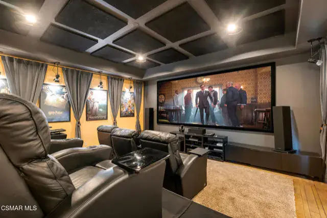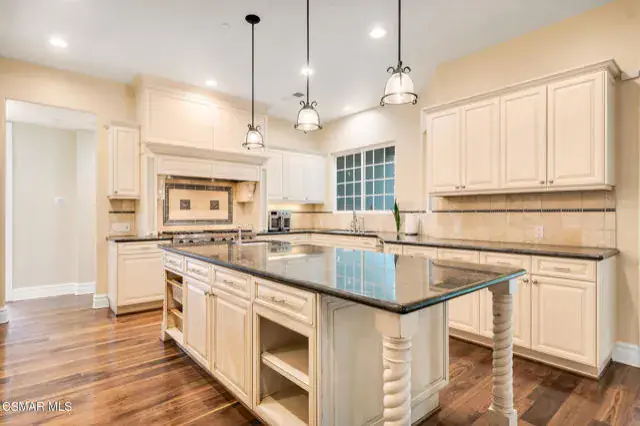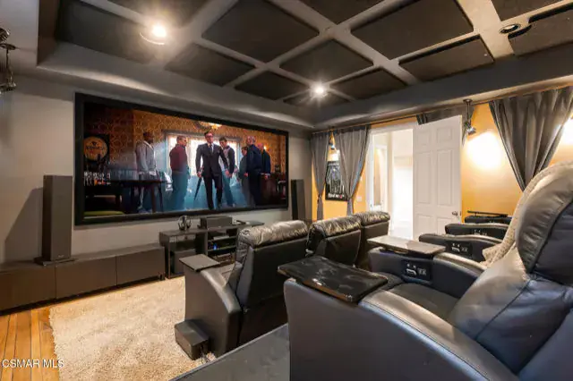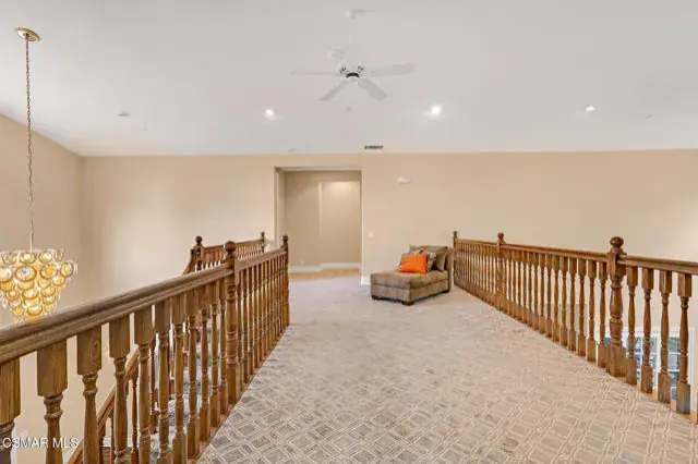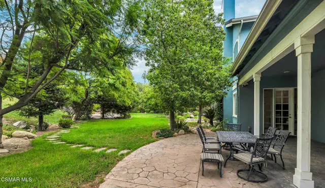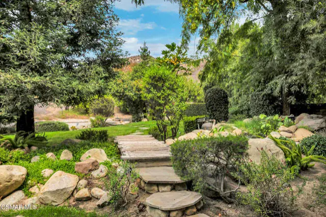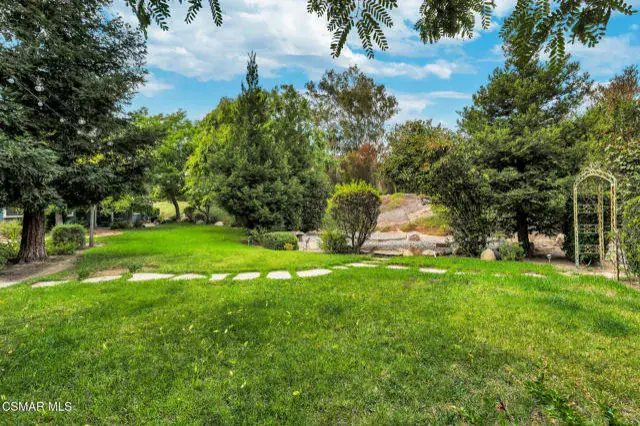 A rare offering in Simi Valley, this custom 6-bedroom, 6.5-bath estate crowns the end of a quiet cul-de-sac, presenting over 5,600 sq. ft. of refined living on a 25,000+ sq. ft. lot. Currently owned by a Hollywood producer who sought a private retreat outside the city, the estate has also hosted gatherings attended by movie stars, directors, and producers — a testament to its scale and entertaining appeal. The approach is framed by mature shade trees, lush landscaping, river rock accents, and a custom river rock mailbox. An extra-long and wide stamped concrete driveway with possible RV parking enhances curb appeal, while the custom double-door entry with leaded glass sidelights sets a welcoming tone. Inside, the foyer opens with real wood floors, soaring ceilings, and an artisan agate chandelier. To the left, a study/office with floor-to-ceiling custom built-ins provides the perfect setting for a home library or workspace, while still offering the versatility of a bedroom with ensuite bath. Nearby, French glass doors open to an additional room, previously used as a music room, ideal as a den, playroom, or creative space. The formal living room rises to 30 feet with abundant windows and a travertine raised-hearth fireplace, while French doors lead to the backyard. Off the living room, a dedicated theater room boasts a 210′ screen, Sony projector, blackout curtains, surround sound, and 7 reclining chairs — all included. The gourmet kitchen showcases two full-capacity Sub-Zero units–refrigerator and freezer, a Viking 6-burner cooktop with griddle and hood flanked by custom spice racks, a Viking microwave, Bosch dishwasher, abundant cabinetry with built-in storage nooks, and an extra-long granite island with travertine accents and pendant lighting. A butler’s pantry with sink, wine refrigeration, and walk-in pantry enhances functionality, while a built-in china cabinet and casual dining area add charm. A second bedroom with adjacent bath, laundry room, and guest powder room complete the lower level. Upstairs, an open loft-style landing creates a striking catwalk across the home, overlooking the living areas below and connecting the bedrooms. The primary suite offers a private retreat with a balcony overlooking the backyard, sitting area, fireplace, dual walk-in closets with organizers, and a marble bath with dual vanities, soaking tub, and steam shower with dual heads. Three additional ensuite bedrooms with closet organizers complete the upper floor. The backyard feels like a private park, with expansive lawns, stamped concrete patios, covered sitting areas, koi pond with waterfall and wood bridge, rose gardens, grapevines, and fruit trees — plus plenty of space to add a pool, greenhouse, or other features to fit your lifestyle. The spacious 3-car garage includes epoxy flooring, overhead storage, an updated electrical panel, two 220v outlets for EV charging, and a full-size safe. Energy efficiency is enhanced by a solar system paired with four Tesla wall batteries, designed to provide significant backup capability, including support for the home’s zoned A/C system. Additional features include three fireplaces, dual-paned windows with shutters, Nest temperature controls in every room, a recirculating water heater, a replaced sewer line, and fiber-optic connectivity for reliable high-speed internet access. Additional highlights include no HOA, a quiet neighborhood setting, and proximity to Lemon Park. Finishing touches include all artisan chandeliers and sconces handcrafted by Corbett. Blending custom design, thoughtful upgrades, and resort-style grounds, this estate is truly one of Simi Valley’s premier residences.