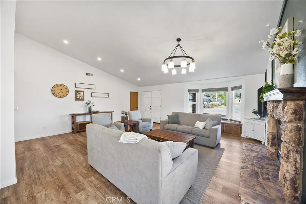 From the moment you enter, vaulted ceilings, wide-plank flooring, and a striking stone fireplace create a warm yet sophisticated atmosphere. The chef-inspired kitchen has been beautifully remodeled with timeless finishes, stainless steel appliances, and an oversized island designed for both entertaining and everyday living. The home offers three well-appointed bedrooms, including a serene primary suite with a recently remodeled bathroom, creating a peaceful retreat.