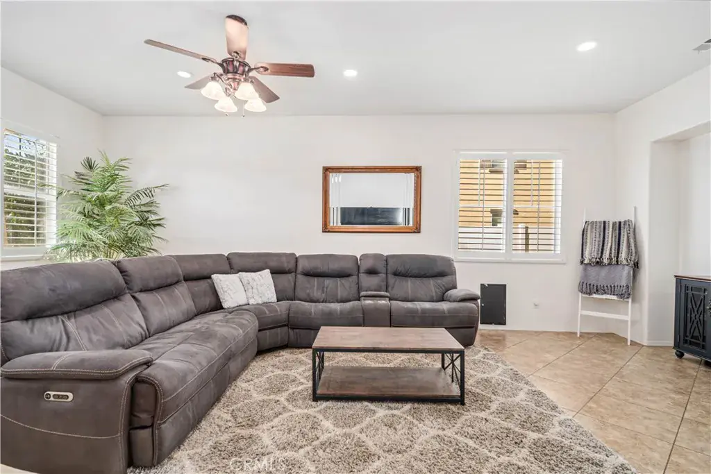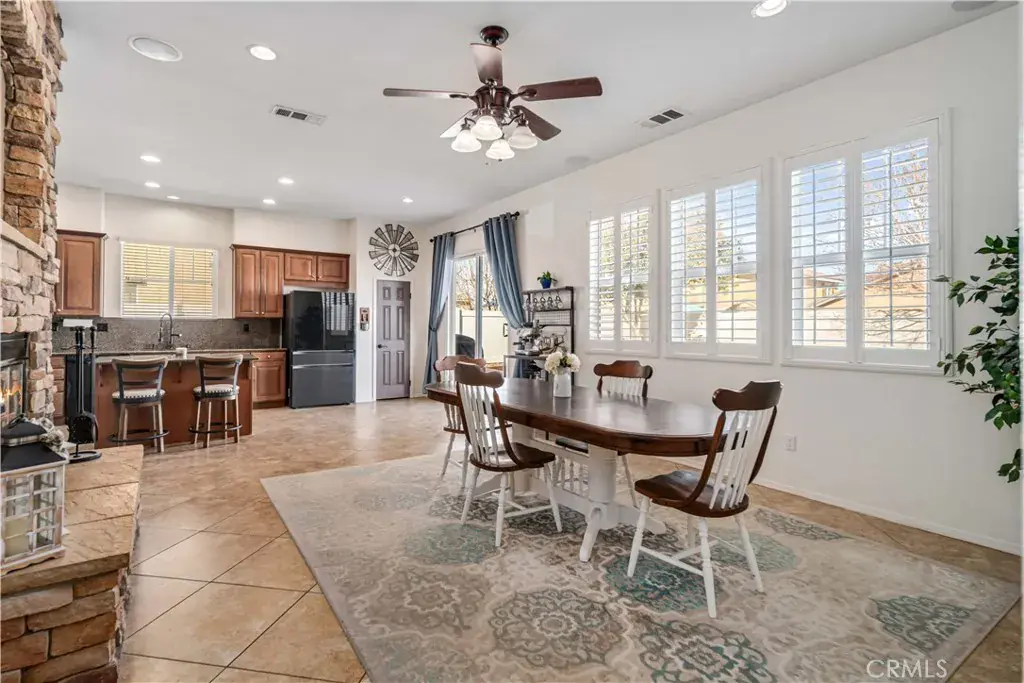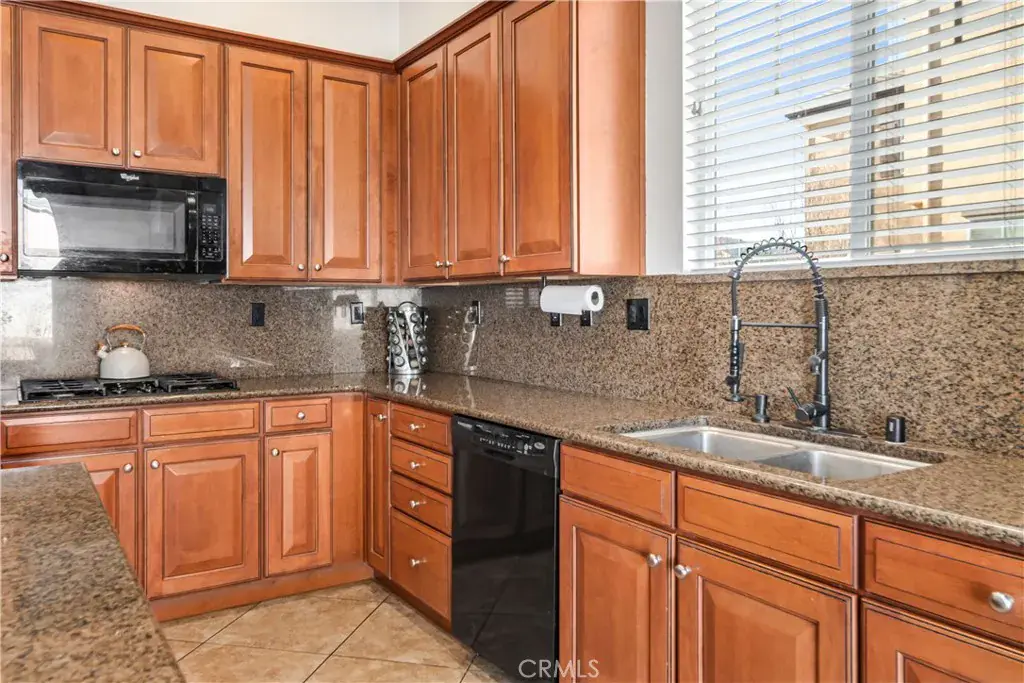 The thoughtfully designed kitchen features upgraded cabinetry, granite countertops with matching granite backsplash, double ovens, and a large center island with breakfast bar—perfectly positioned to overlook the warm and inviting family room. The family room offers a cozy stone fireplace and classic wood window shutters, ideal for everyday living and entertaining. One full bedroom and bathroom are conveniently located downstairs.