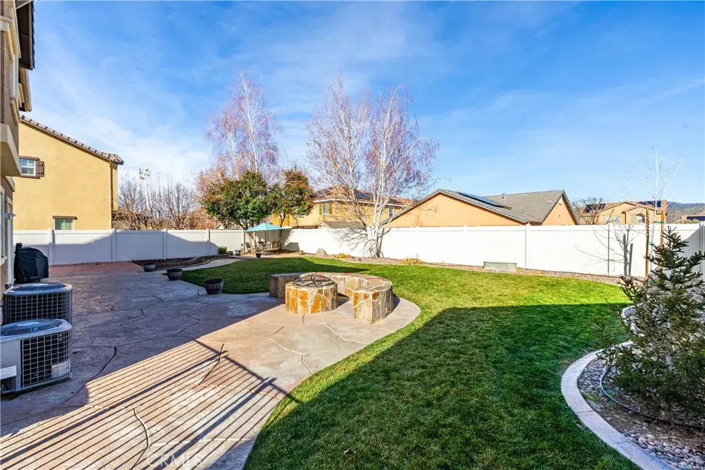 The backyard is an entertainer’s delight, boasting a custom stamped concrete patio, built-in gas fire pit, custom landscape curbing, spa pad, and lush lawn—perfect for gatherings or relaxing evenings. Additional highlights include paved RV access and close proximity to shopping, dining, and other local amenities.