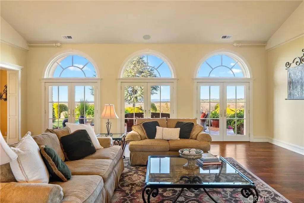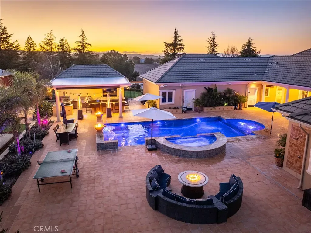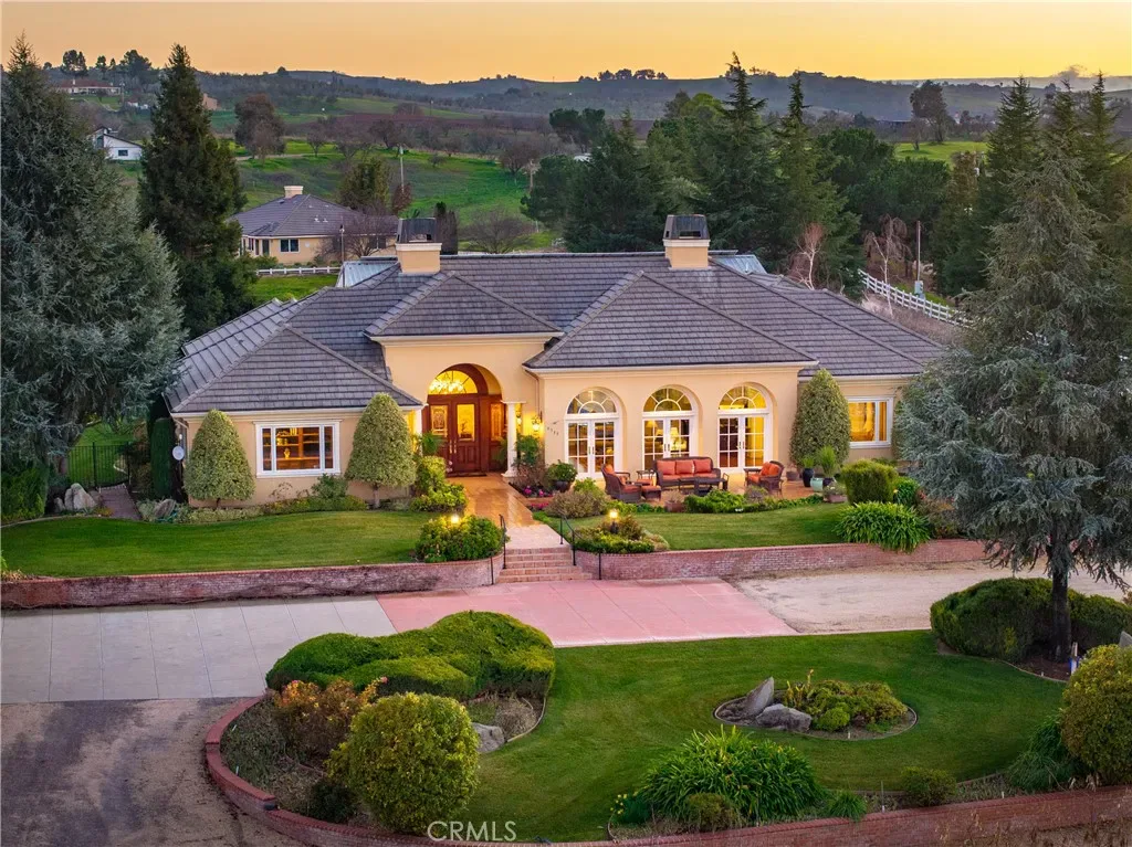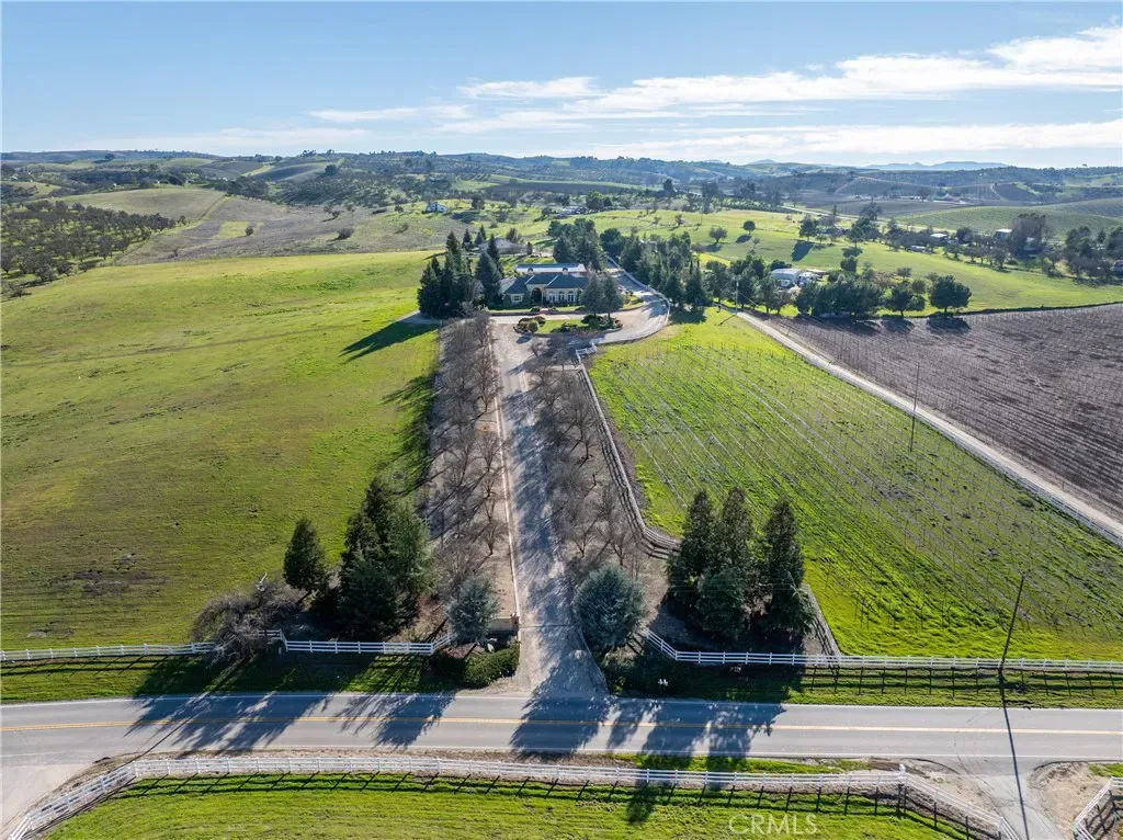 The main residence is a 3,842± square foot custom home, designed for everyday comfort and entertaining. The home offers two formal bedrooms plus a flexible room ideal for a home office, den, or optional third bedroom, along with 2.5 bathrooms. Architectural highlights include vaulted ceilings, curved archways, mahogany tray ceilings, marble flooring, copper chimney caps, and panoramic views. The chef’s kitchen features custom cabinetry with Raymond Enkeboll wood carvings, Sub-Zero refrigeration, a BlueStar 8-burner range with double ovens, Fisher-Paykel double dishwashers, wine bar, walk-in pantry, and oversized center island. The primary suite offers direct pool and spa access, a walk-in closet, dual vanities, and a jetted soaking tub. The attached three-car garage is fully finished with epoxy floors, storage, and a Tesla charger. The second residence, is a 1,588± square foot 3 bedroom, 2 bath home with wood floors, vaulted ceilings, custom cabinetry, gas fireplace, tankless water heater, attached two-car garage, and private outdoor space. A 2,100± square foot barn provides workshop and storage space, high bay roll-up door, solar array, split HVAC, and access to a private apartment. The barndominium includes approximately 750± square feet with bedroom, bunk room, bathroom, covered patio, plus an additional 495± square foot bonus or hobby room. Outdoor living includes a 20×40 pool and spa, water features, fire bowls, outdoor shower, and an outdoor kitchen with gas grill, Fontana Forno Italian wood burning pizza oven, Santa Maria grill, smoker, kegerator, and pergola. Amenities include a putting green, bocce court, chicken coop, landscaping, and an east-facing view deck. The property features two wells, two septic systems, 40,900± gallons of water storage, fire sprinklers, smart irrigation, automatic gate, chip seal driveway, and fencing. Approximately two acres are planted to Aglianico and Cabernet Franc vines. A turnkey estate offering privacy, infrastructure, lifestyle amenities, and income potential, just minutes from Paso Robles, Templeton, and Atascadero.