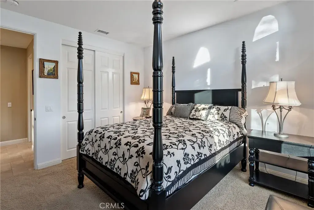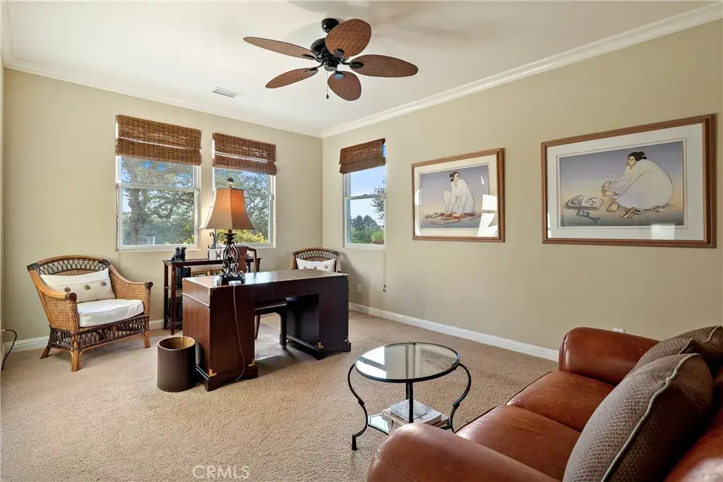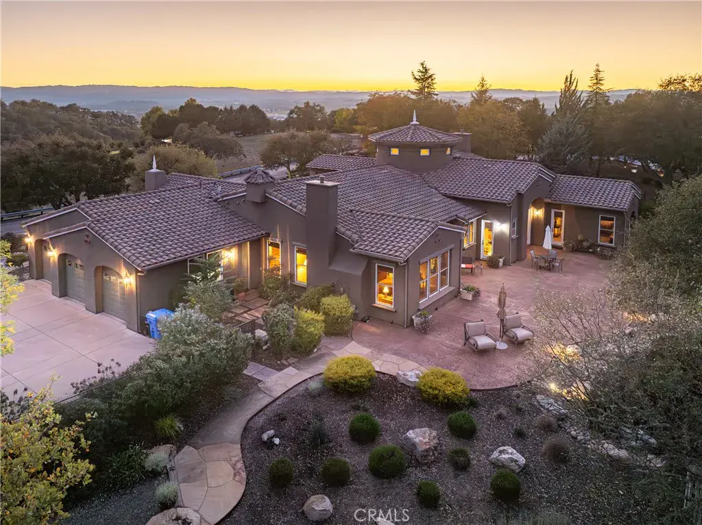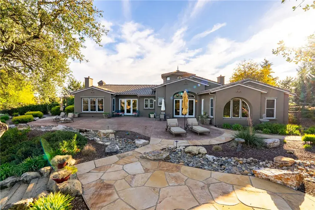 The spacious primary suite offers privacy, dual walk-in closets, and a luxurious bath with soaking tub and large shower. Additional bedrooms and a flexible office space capture beautiful hillside and sunset views. Outdoor living shines with expansive flagstone patios, multiple sitting areas, and lush landscaping surrounded by heritage oaks – perfect for dining, relaxing, or entertaining under the stars.