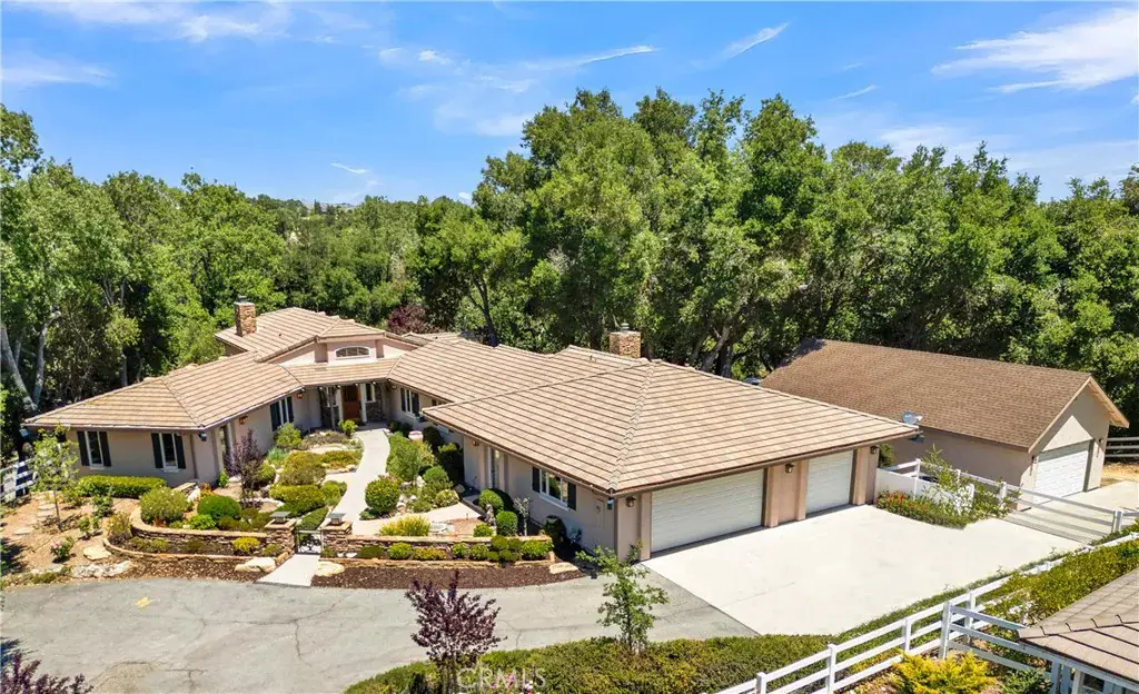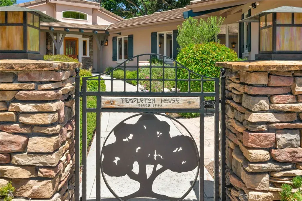 Privacy. Prestige. Timeless Elegance. Welcome to Templeton House—a distinguished estate with separate workshop gracefully set within the rolling hills of exclusive Petersen Ranch. Crafted with remarkable attention by its original owners, this residence offers an uncommon blend of sophistication, serenity, and enduring architectural beauty, all just moments from renowned wineries and premier Central Coast destinations. A gated entrance announces your arrival to a property of rare refinement. The winding drive reveals immaculately maintained grounds, generous guest parking, a bocce court with an elevated viewing deck perfect for sunrise contemplation or sunset gatherings, a fragrant rose garden, and a tranquil courtyard oasis that hints at the elegance within. Step through the private entry gate and be welcomed into a world of understated luxury. The grand living room showcases soaring ceilings, exquisite flooring, and abundant natural light, framed by custom glass doors that open to the landscape. A warm fireplace and custom built-ins create a setting of comfort, grace, and timeless appeal. At the heart of the home lies the chef’s kitchen—an inspired culinary haven equipped with premier stainless appliances including a Viking range, double ovens, warming drawer, and professional-grade ice maker. A generous island serves as both workspace and gathering point, enhanced by a skylight that bathes the room in soft illumination. Adjoining spaces include a charming dinette with custom shelving and built-in desk, as well as a formal dining room ideal for intimate dinners and celebratory occasions. The primary suite is a private sanctuary featuring a dramatic ceiling, personal wood-burning stove, glass doors, and a spa-inspired bath with deep soaking tub, dual vanities, walk-in glass shower, and a spacious, beautifully designed closet. The guest wing—positioned for privacy on the opposite side of the home—offers two oversized bedrooms, abundant storage, and a well-appointed bath. Outdoors, meandering paths, shaded patios, and serene vantage points invite reflection and connection with the natural surroundings. A separate workshop—with private office, dedicated lighting, and roll-up doors—provides exceptional flexibility for artisans, hobbyists, or creative professionals. Additional highlights include a three-car garage, custom dog run, and a sprawling 3.65± acre parcel.