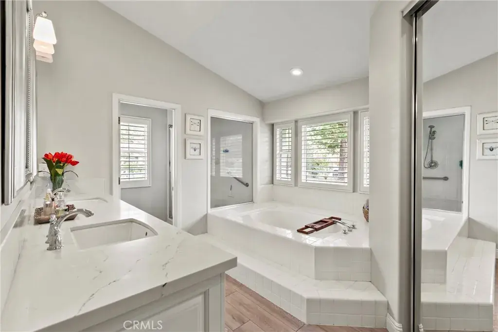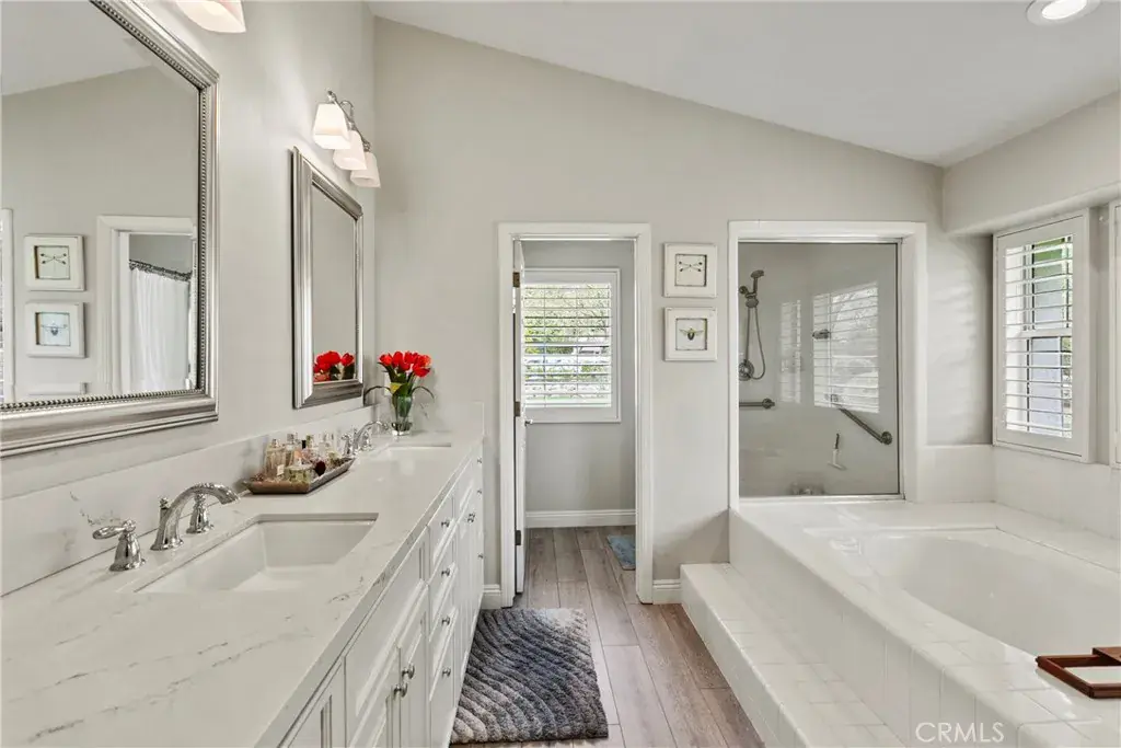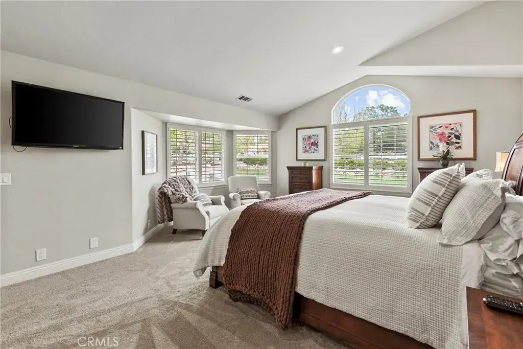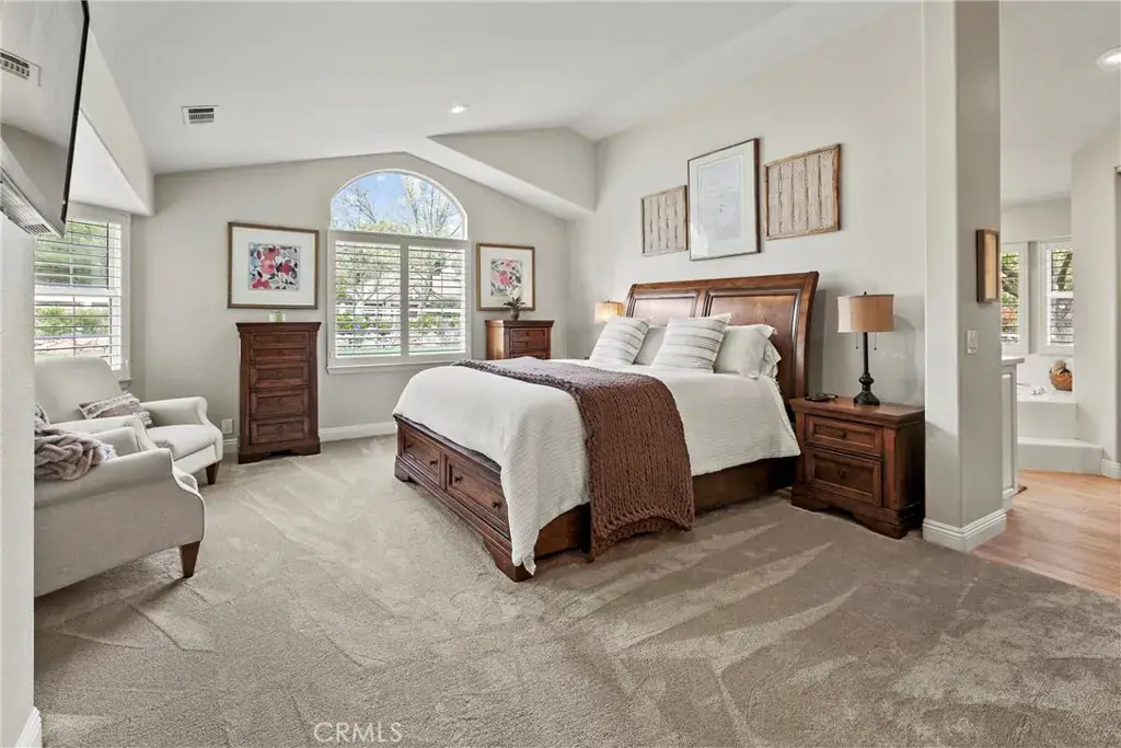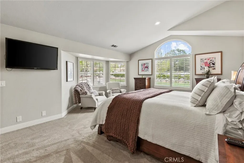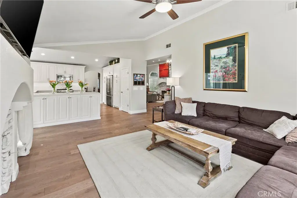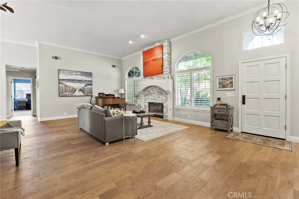 The thoughtfully designed single-level layout features 4 bedrooms and 3 bathrooms with a split-wing design. This home has multiple living areas, vaulted ceilings, crown moldings, & an incredible kitchen. Step inside to find bright, airy living spaces with new luxury hardwood flooring and cozy up around either of the two fireplaces. New premium carpeting brings extra comfort to the bedroom spaces and in the primary suite you will find a spacious bedroom with cozy seating area, a spacious walk-in closet, & renovated bathroom with dual-vanity, soaking bathtub, & walk-in shower.