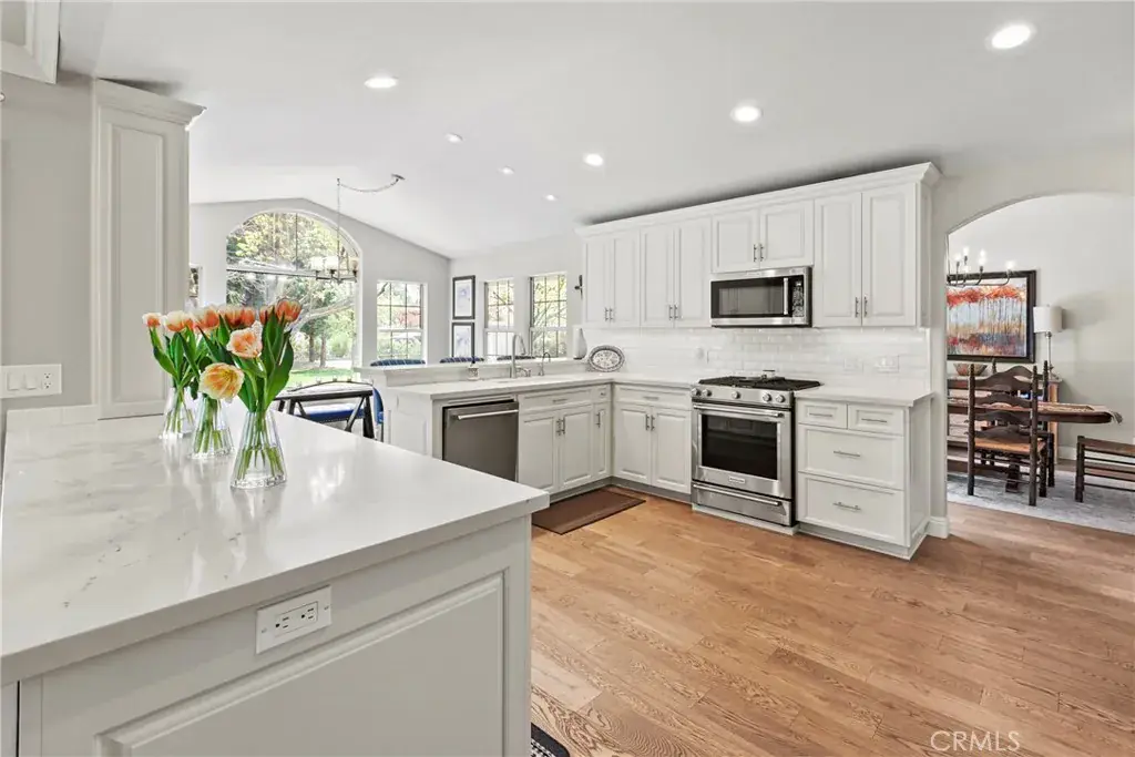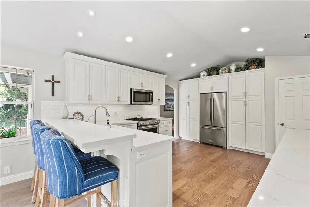 At the heart of the home, the fully remodeled kitchen impresses with custom soft-close cabinetry, stunning quartz countertops, & quality finishes, ready for gourmet cooking or casual gatherings. The kitchen also features upgraded appliances, a large breakfast bar & an inviting sitting area with large windows that let the natural sunlight in.