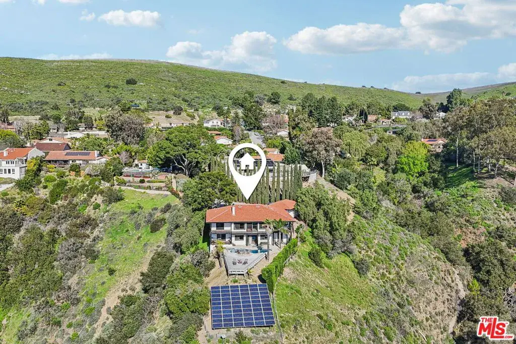 Privately set on an expansive flag lot of over 30,056 sq ft in the exclusive Lynn Ranch of Thousand Oaks, this exceptional view residence offers approximately 4,160 sq ft of living space. A long private driveway leads to a gated courtyard entry, creating a true sense of seclusion and arrival. The home features four bedrooms and four and one-half bathrooms, including three full baths upstairs, a three-quarter bath downstairs, and a separate powder room. Designed to capture breathtaking views from nearly every room, the property showcases three fireplaces, Saltillo terracotta tile flooring, and expansive indoor-outdoor living. A generous balcony spans approximately 65 feet and offers sweeping 270-degree views. The primary suite is ideally positioned on the main living level and includes a spacious bathroom with a dedicated washer and dryer discreetly located behind the closet. An additional washer and dryer hookup is located downstairs. Recent upgrades include a new roof in 2023, new water heater, and newly resurfaced pebble pool in 2023, with pool equipment appearing newer. The property also benefits from leased solar panels installed approximately 15 years ago. A three-car garage complements the property. The downstairs level includes an added kitchen, bathroom, and washer and dryer setup within existing space. An outstanding opportunity for buyers seeking privacy, dramatic views, and a substantial hillside setting.