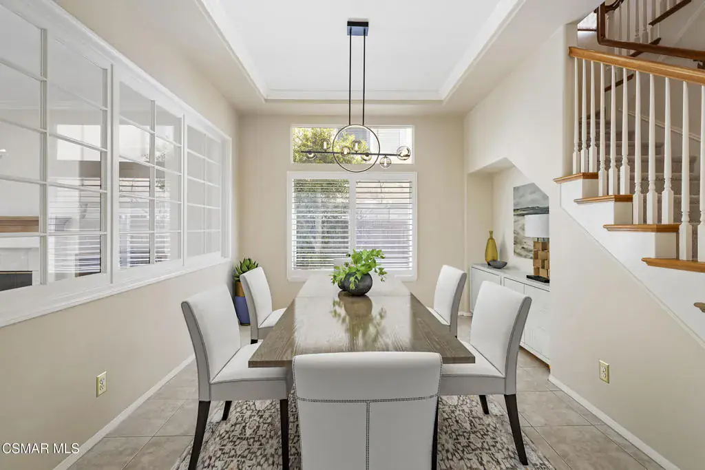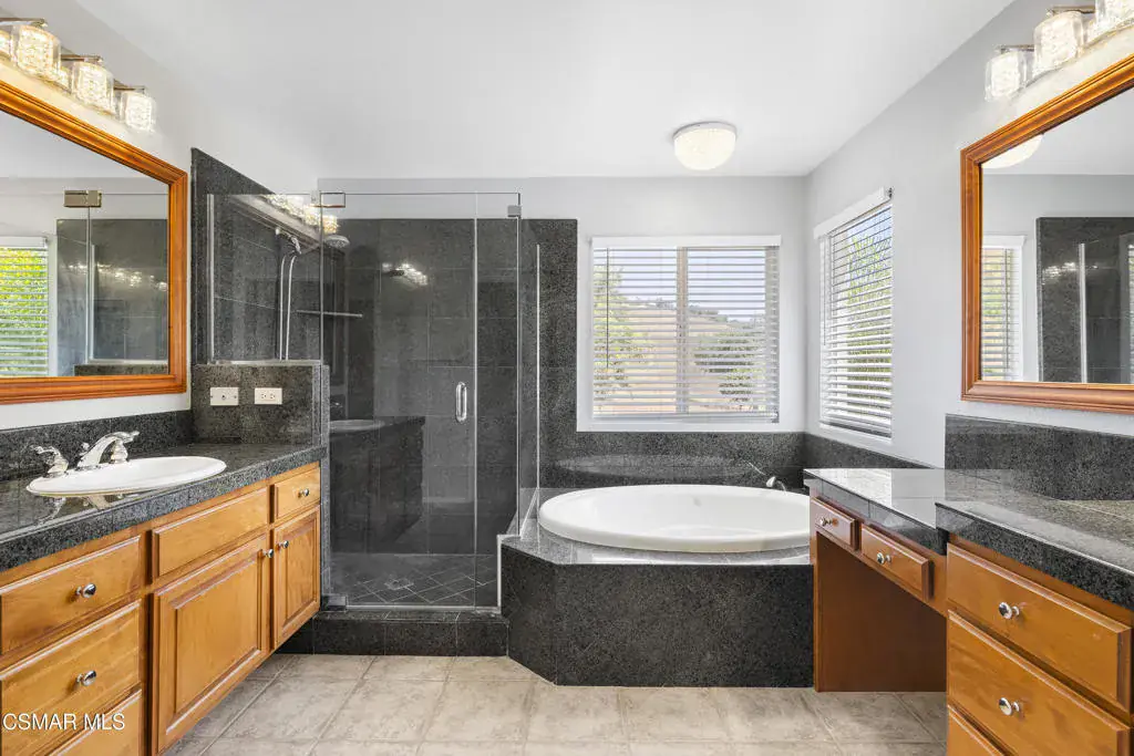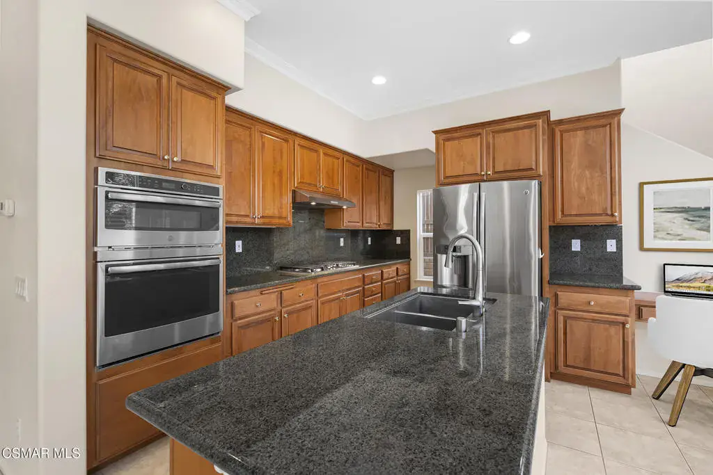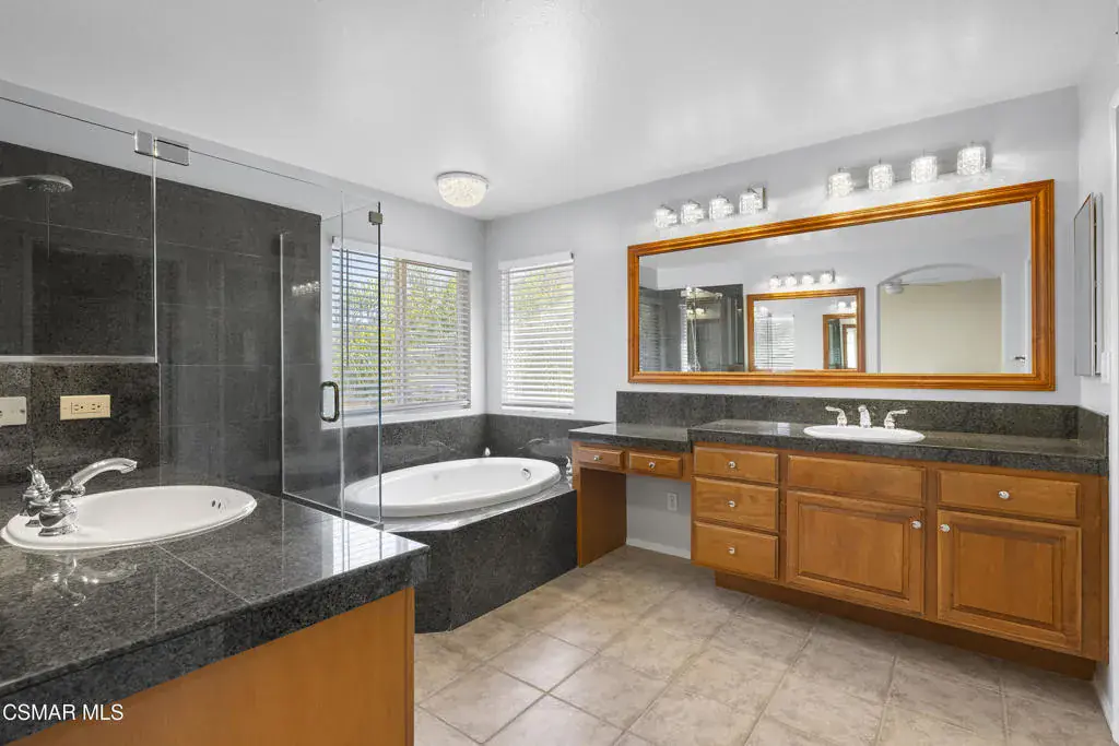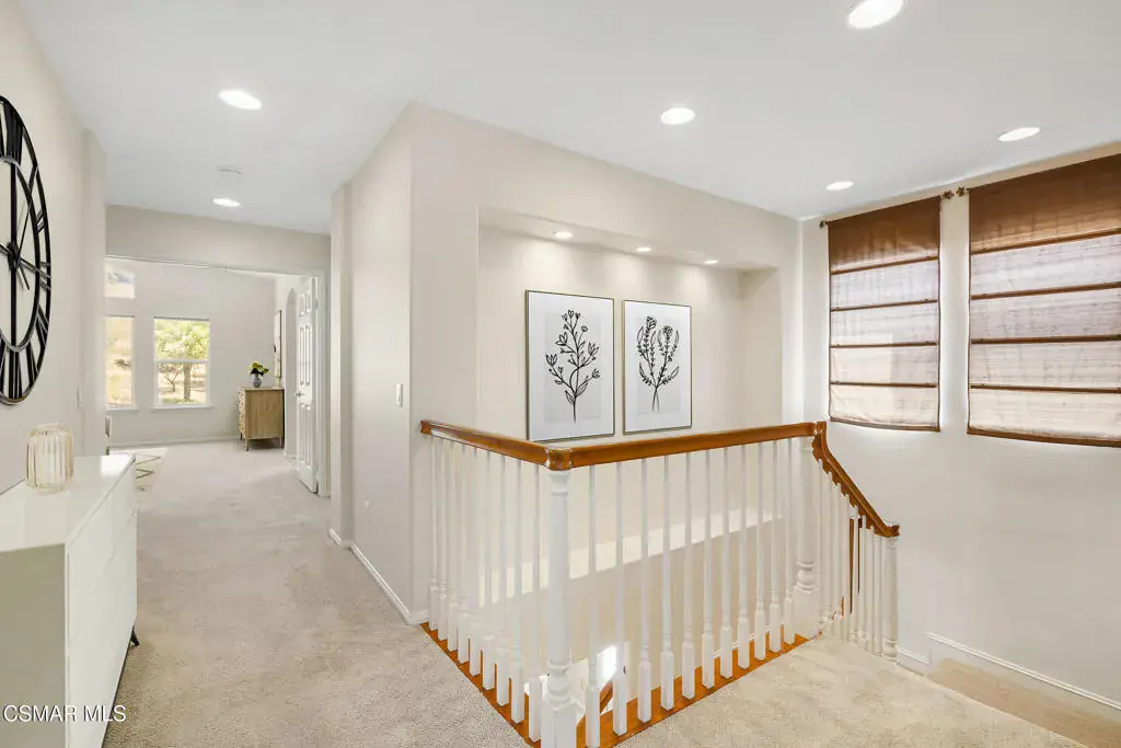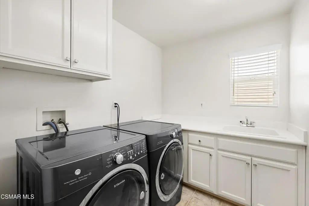 Welcome to this highly desirable Plan 3 Bellagio home, located in the prestigious gated community of Eagle Ridge in Lang Ranch. Situated on a cul-de-sac street with picturesque views of the surrounding hills, this unique floor plan with a dual staircase is also the only model in the community that offers a full 3-car garage. The open layout features spacious living and dining rooms–ideal for entertaining–that flow seamlessly into a bright family room with a fireplace. Beautifully appointed kitchen includes an office nook/landing station, maple cabinetry, granite countertops, a center island, stainless steel appliances (including the refrigerator), a walk-in pantry, and serene views of the private backyard and open space. The optional downstairs (5th) bedroom is currently utilized as a fully equipped home office with custom built-ins. A full bathroom with a shower is also located on the main level. Upstairs are three generously sized secondary bedrooms, each with ample closet space, including one with a walk-in closet. There is a hall bathroom featuring a dual-sink vanity and a tub with shower. The luxurious primary suite boasts sweeping views and a spacious ensuite bathroom with dual vanities topped with granite countertops, a soaking tub, a granite-tiled shower with a frameless glass enclosure, and an expansive walk-in closet with custom built-ins. A dedicated upstairs laundry room includes a sink, washer, and dryer. Additional highlights include community pool, spa, and playground. Enjoy easy access to nearby parks, miles of hiking and biking trails, shopping, and award-winning schools. This is a rare opportunity to own a one-of-a-kind home in one of Lang Ranch’s most coveted neighborhoods!