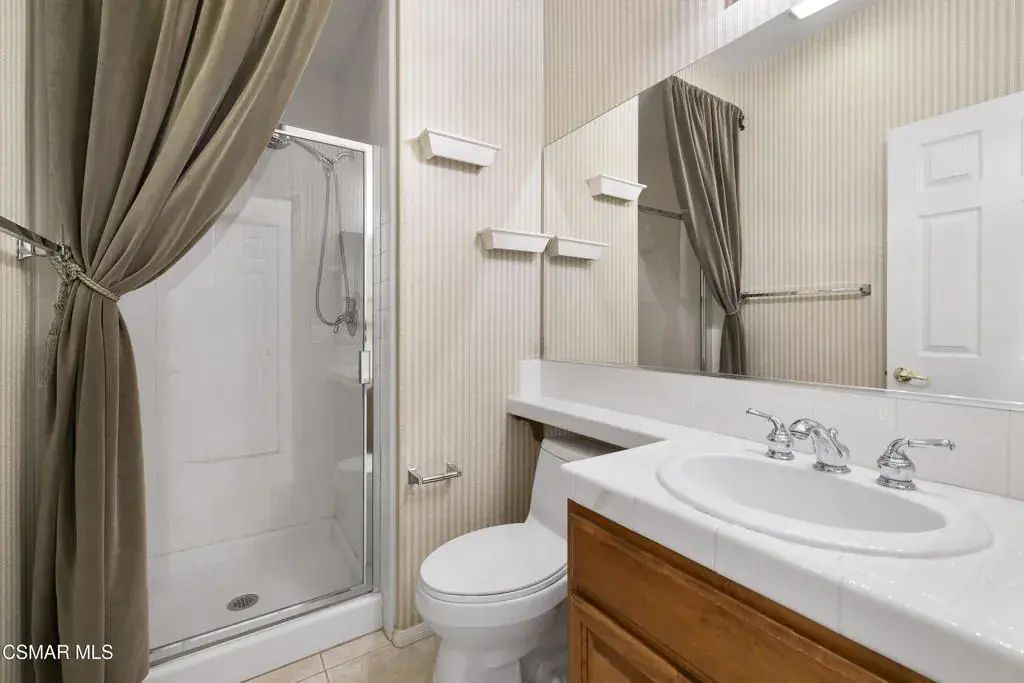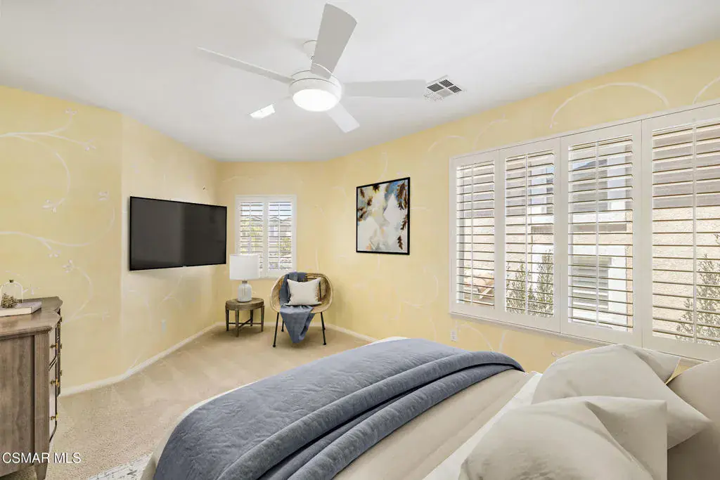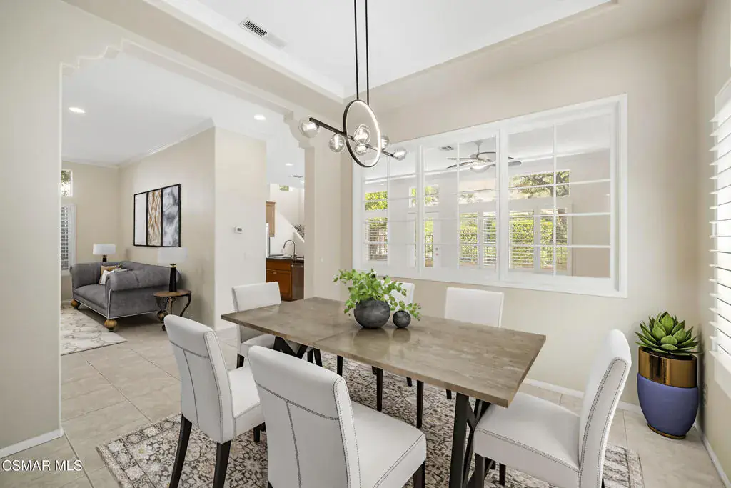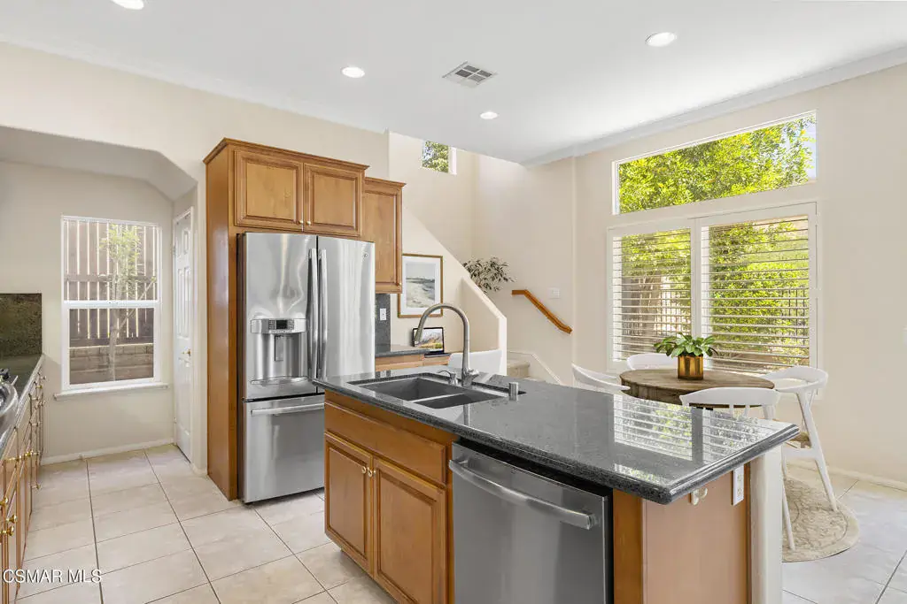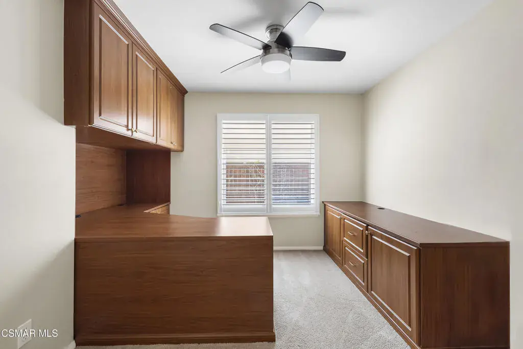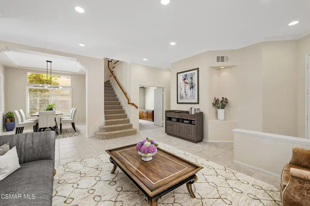 Welcome to this highly desirable Plan 3 Bellagio home, located in the prestigious gated community of Eagle Ridge in Lang Ranch. Situated on a cul-de-sac street with picturesque views of the surrounding hills, this unique floor plan with a dual staircase is also the only model in the community that offers a full 3-car garage. The open layout features spacious living and dining rooms–ideal for entertaining–that flow seamlessly into a bright family room with a fireplace. Beautifully appointed kitchen includes an office nook/landing station, maple cabinetry, granite countertops, a center island, stainless steel appliances (including the refrigerator), a walk-in pantry, and serene views of the private backyard and open space. The optional downstairs (5th) bedroom is currently utilized as a fully equipped home office with custom built-ins. A full bathroom with a shower is also located on the main level. Upstairs are three generously sized secondary bedrooms, each with ample closet space, including one with a walk-in closet. There is a hall bathroom featuring a dual-sink vanity and a tub with shower. The luxurious primary suite boasts sweeping views and a spacious ensuite bathroom with dual vanities topped with granite countertops, a soaking tub, a granite-tiled shower with a frameless glass enclosure, and an expansive walk-in closet with custom built-ins. A dedicated upstairs laundry room includes a sink, washer, and dryer. Additional highlights include community pool, spa, and playground. Enjoy easy access to nearby parks, miles of hiking and biking trails, shopping, and award-winning schools. This is a rare opportunity to own a one-of-a-kind home in one of Lang Ranch’s most coveted neighborhoods!