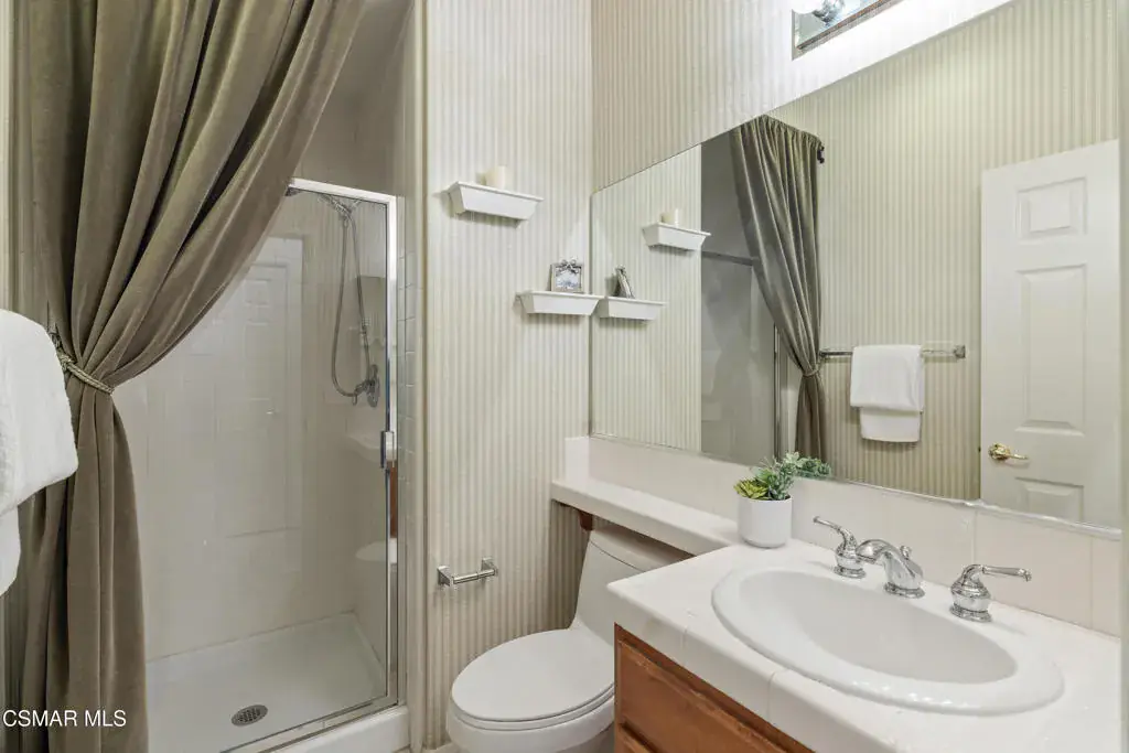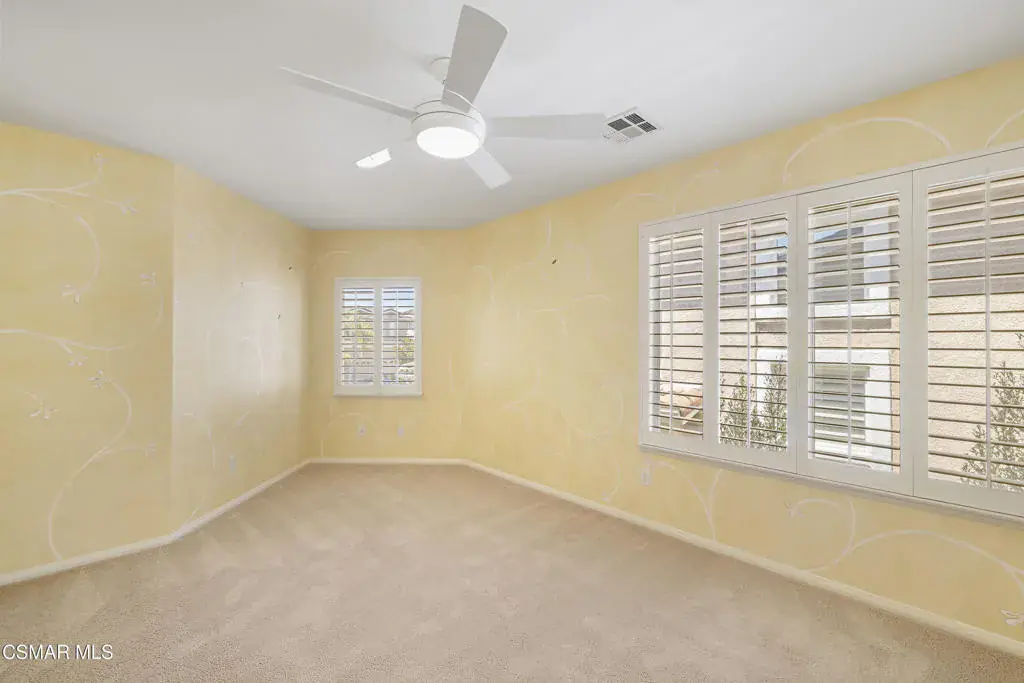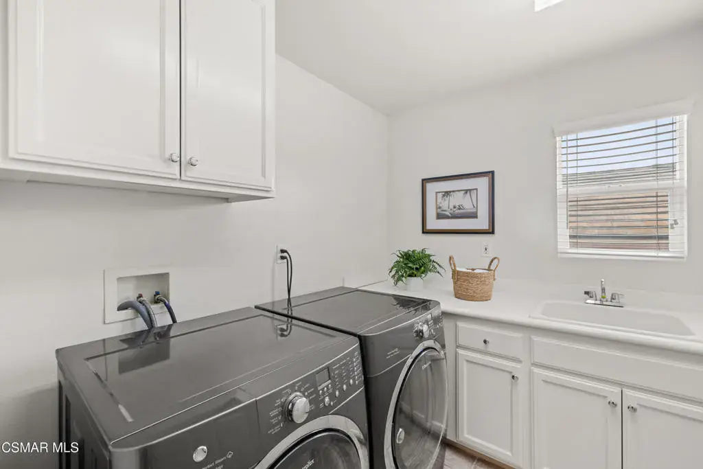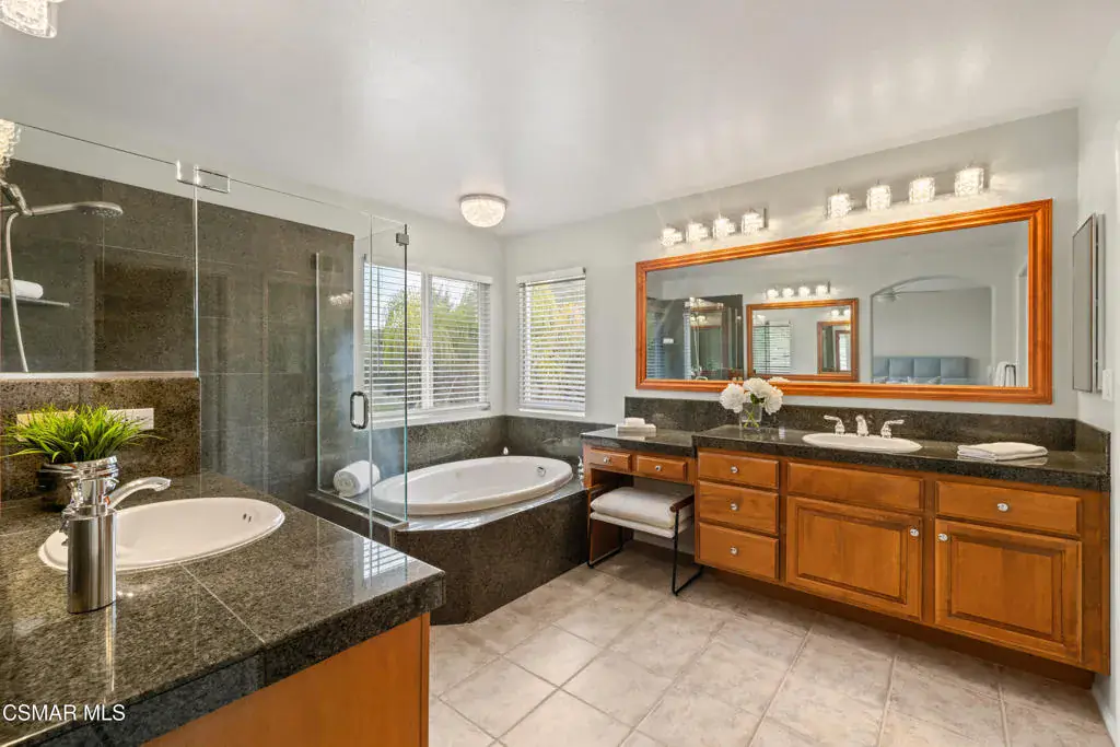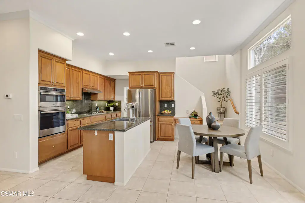 Welcome to this highly desirable Plan 3 Bellagio home, located in the prestigious gated community of Eagle Ridge in Lang Ranch. Situated on a quiet cul-de-sac street with picturesque views of the surrounding hills, this unique residence features a dual staircase, a downstairs 5th bedroom currently utilized as an office, and is the only model in the community that offers a full 3-car garage.The open and inviting floor plan offers spacious living and dining rooms–perfect for entertaining–that flow seamlessly into a bright family room with a cozy fireplace. The beautifully appointed kitchen includes an office nook/landing station, maple cabinetry, granite countertops, a center island, stainless steel appliances, a walk-in pantry, and serene views of the private backyard and open space beyond. A full bathroom with a shower is also conveniently located on the main level.Upstairs, you’ll find the luxurious primary suite, showcasing sweeping views and a spacious ensuite bathroom with dual granite-topped vanities, a soaking tub, a granite-tiled shower with a frameless glass enclosure, and an expansive walk-in closet with custom built-ins. Also upstairs are three generously sized secondary bedrooms with ample closet space, including one with a walk-in closet, along with a hall bathroom featuring a dual-sink vanity and a tub/shower combination. A dedicated upstairs laundry room includes a sink, washer, and dryer.Additional highlights include access to the community pool, spa, and playground, along with easy proximity to nearby parks, miles of hiking and biking trails, shopping, and award-winning schools. This is a rare opportunity to own a one-of-a-kind home in one of Lang Ranch’s most coveted neighborhoods!