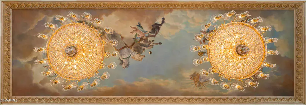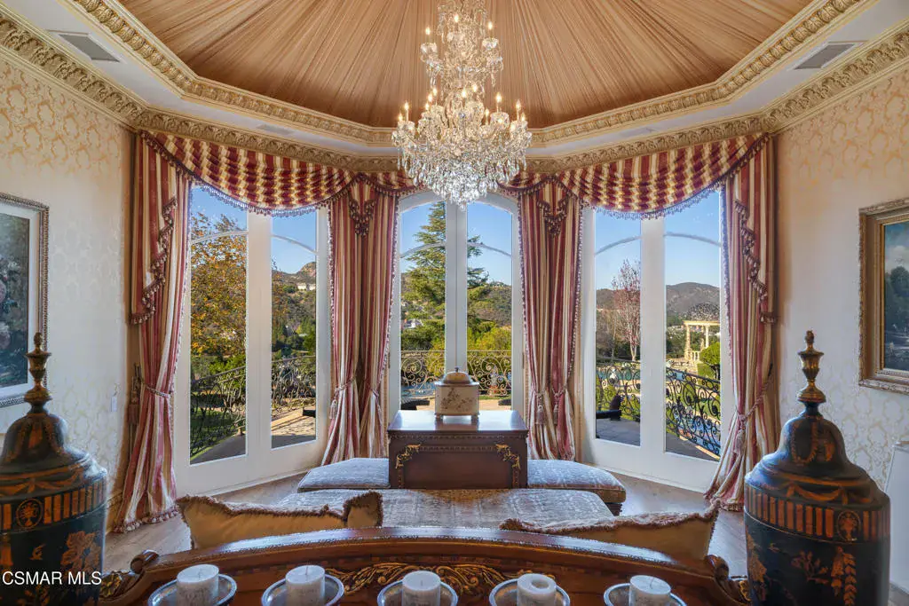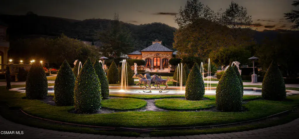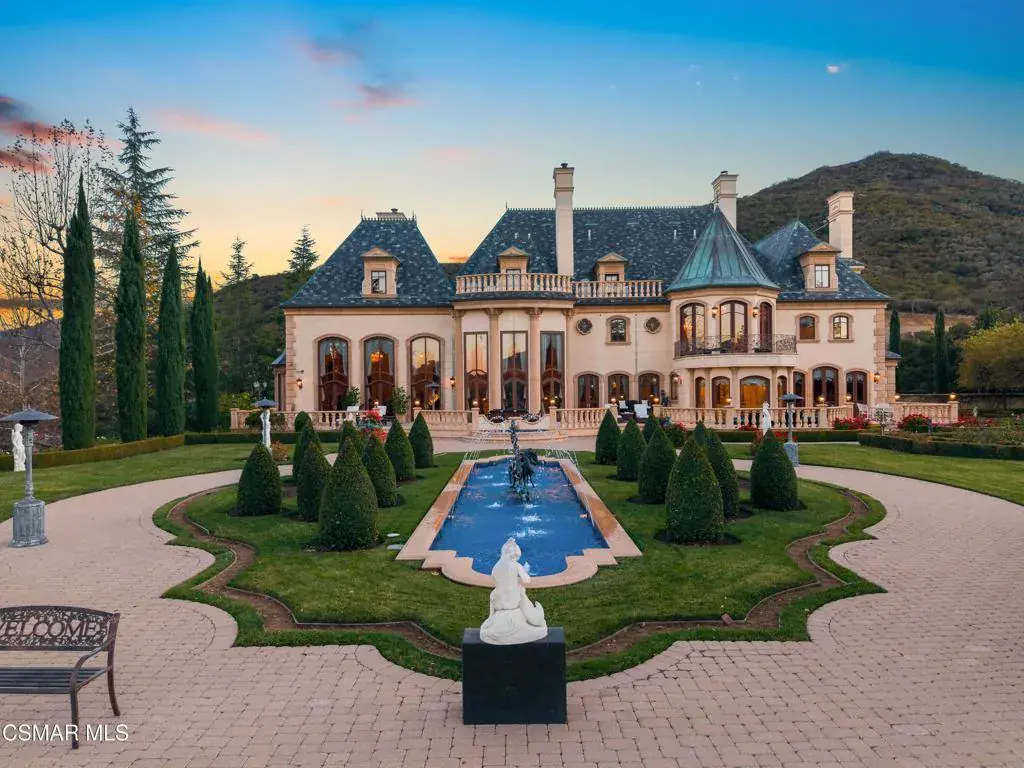 As featured in Robb Report & Los Angeles Times, Chateau Plaisance, a CASTLE nestled within the prestigious 24/7 guard gated Sherwood Country Club, spans nearly 3 private acres across 5 lots, offering breathtaking views of the spectacular Santa Monica Mountains and the renowned Jack Nicklaus Signature Golf Course. Perfected in every detail, this approx. 14,113-square-foot French-inspired masterpiece showcases unparalleled artisanship and timeless elegance.The Castle’s park-like grounds are a true masterpiece, featuring formal box-hedged gardens filled with thousands of roses, lush lawns adorned with life-sized statuary, and cobblestone pathways leading to a striking 52-foot reflection pond where bronze horses appear to gallop through cascading water. A serene large infinity pool and spa with a waterfall, a koi pond, and an ornate iron gazebo overlooking the valley complete this enchanting outdoor retreat.A grand entrance welcomes you into the rotunda, where a dazzling Baccarat chandelier, hand-painted murals, and a sweeping marble staircase with a gold-leafed iron banister set the tone for the opulence within. The 22-foot-high Grand Salon & Ballroom boasts two Spanish brass and crystal chandeliers, a carved fireplace, and towering windows that frame the gardens. An elevated alcove provides the perfect stage for entertainment.The richly paneled library, complete with parquet flooring, a fireplace, and a hidden bar, offers a cozy escape, while the formal dining room, seating 20, is illuminated by two custom Waterford chandeliers. The gourmet kitchen, adorned with antiqued cabinetry, parquet flooring, four subzero refrigerators, and two oversized islands, opens to a warm and inviting family room featuring a grand fireplace, elegant window seating, and a granite-topped bar.The second floor offers a luxurious primary suite with a sitting area, fireplace, a sleek wet bar, and two lavish spa-inspired baths with oversized closets. Additional guest suites, a Carriage House apartment, and a hidden third-floor bonus space provide ample accommodations. The completed third floor features four separate rooms, providing endless possibilities for a home theater, gym, art studio, or private retreat.This Castle also includes a Pool House–a Mini Chateau with a great room, grand fireplace, kitchen, and two bathrooms, perfect for poolside entertaining. Two gated entrances lead to an elegant courtyard with an imported French fountain, while a separate guest parking area and the Grand Plaza can accommodate up to 150 guests.Gated guest parking is conveniently located near the charming greenhouse and the elegant archway leading to the Grand Plaza, designed to accommodate approximately 150 guests with ease. Chateau Plaisance Castle stands as a pinnacle of luxury, privacy, and grandeur–an estate unlike any other to ever grace the market.