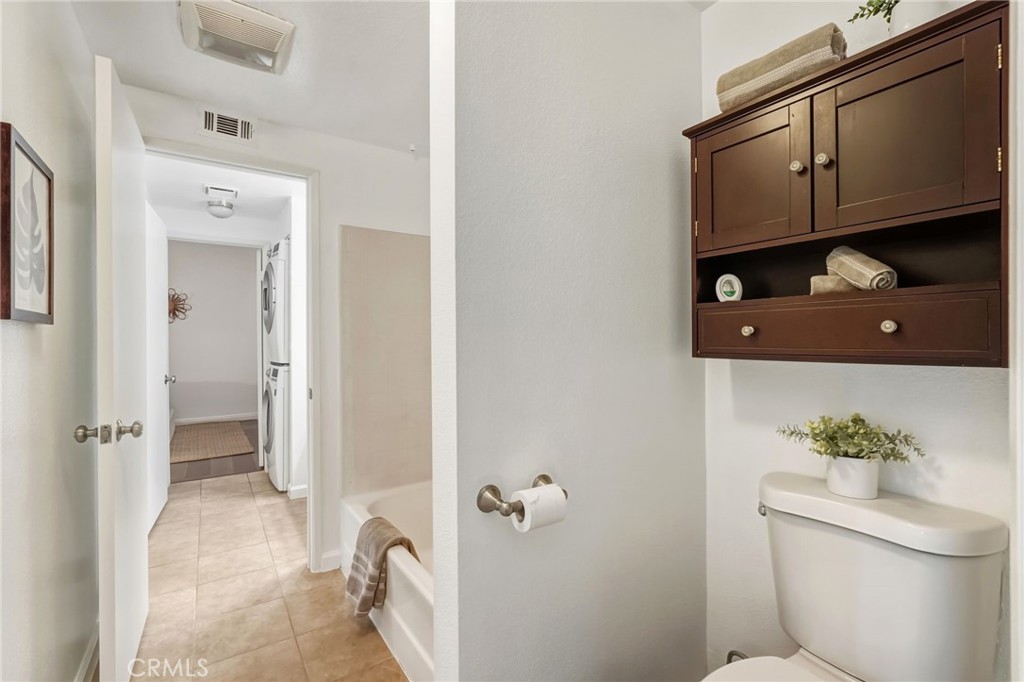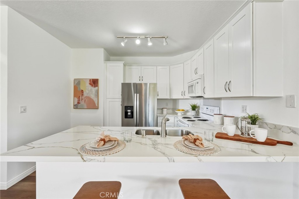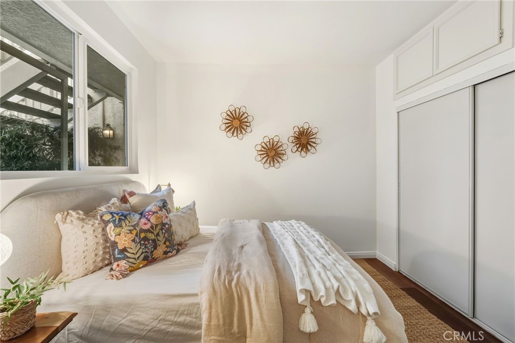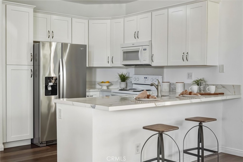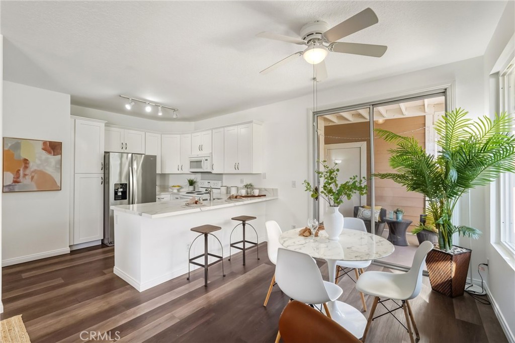 The open kitchen features crisp white cabinetry, quartz countertops, and stainless steel appliances including a refrigerator, dishwasher, microwave, and electric oven. It flows seamlessly into the living and dining areas, creating an inviting and functional layout ideal for both everyday living and entertaining. The spacious primary bedroom includes a generous walk-in closet and sliding doors that open directly to the outdoor patio. A second bedroom provides flexibility for guests, a home office, or additional living space.