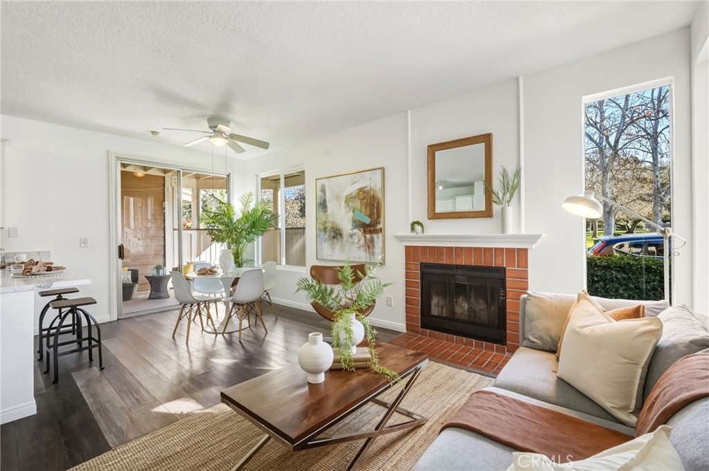 Additional highlights include a well-appointed bathroom, in-unit washer and dryer, a cozy fireplace, and central air conditioning. Step outside to a private wraparound patio overlooking a serene, park-like setting, perfect for enjoying indoor-outdoor living.
