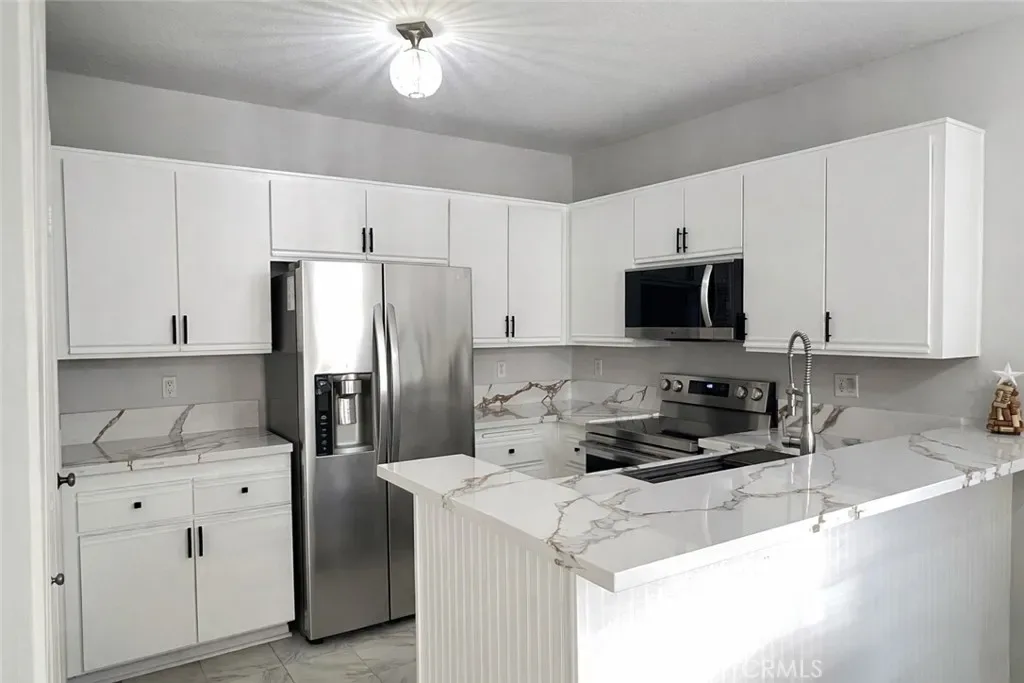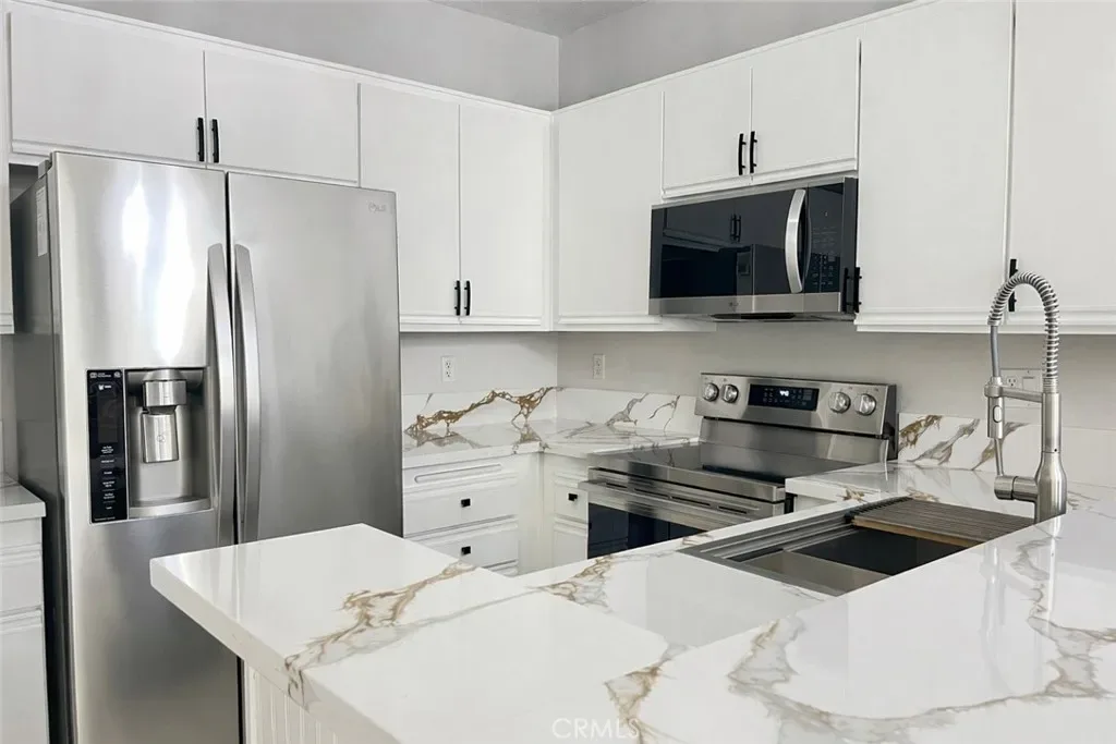 Rare opportunity to own a single story three bedroom first floor condo with over 1,100 sq ft of light-filled living space in the desirable Camelot community of Thousand Oaks. This light and bright home features an open concept layout with abundant natural light, tile flooring, recessed lighting, and a cozy wood burning fireplace with quartz surround and mantle. The updated kitchen offers new quartz countertops, newly painted cabinetry, stainless steel sink and faucet, and new stainless steel appliances. A generous pantry and indoor laundry area with washer and dryer included add everyday convenience. The home offers three spacious bedrooms with ceiling fans and ample closet space. Both bathrooms feature dual sinks and tub shower enclosures, while the primary bedroom includes its own private patio. Enjoy two outdoor patios, one with additional storage, along with central air conditioning and an assigned covered parking space. The Camelot community offers beautifully maintained grounds, pool and spa, and the HOA includes water, trash, and sewer. Conveniently located near shopping, dining, parks, the Civic Arts Plaza, award winning schools, and easy access to the 101 freeway. Turnkey and move-in ready. Come see it before it’s gone.