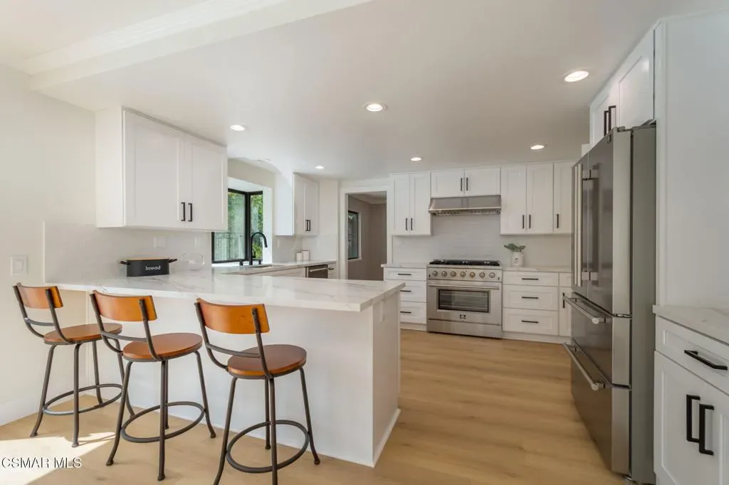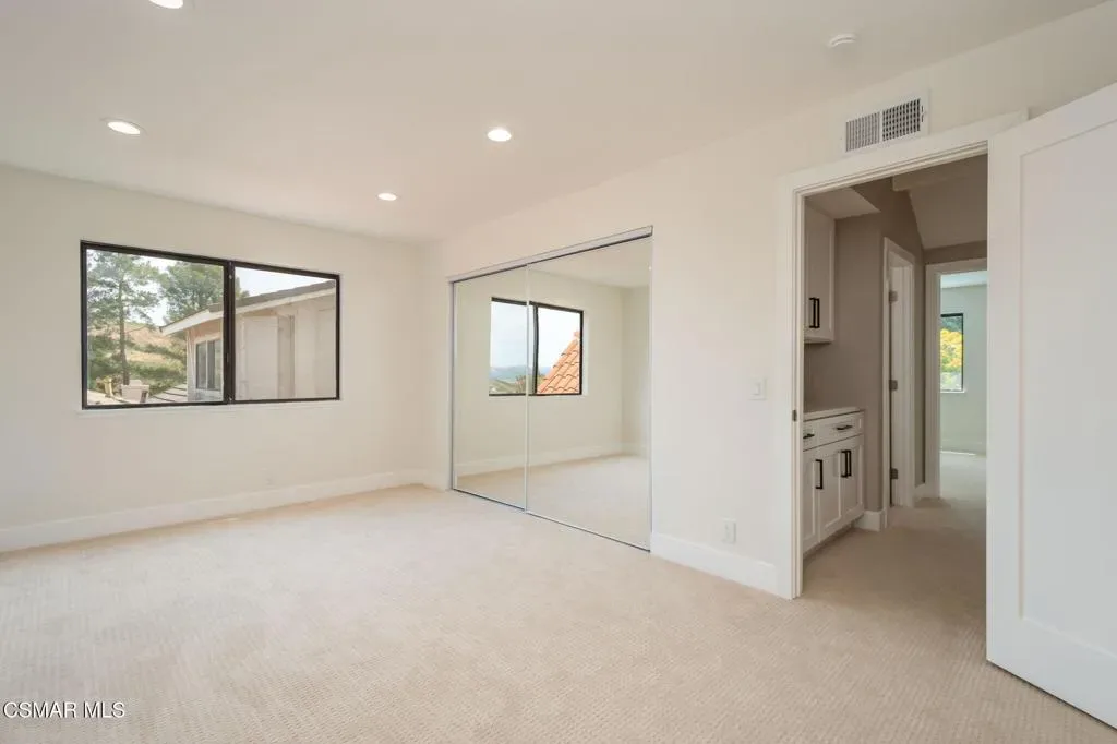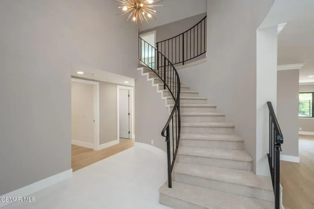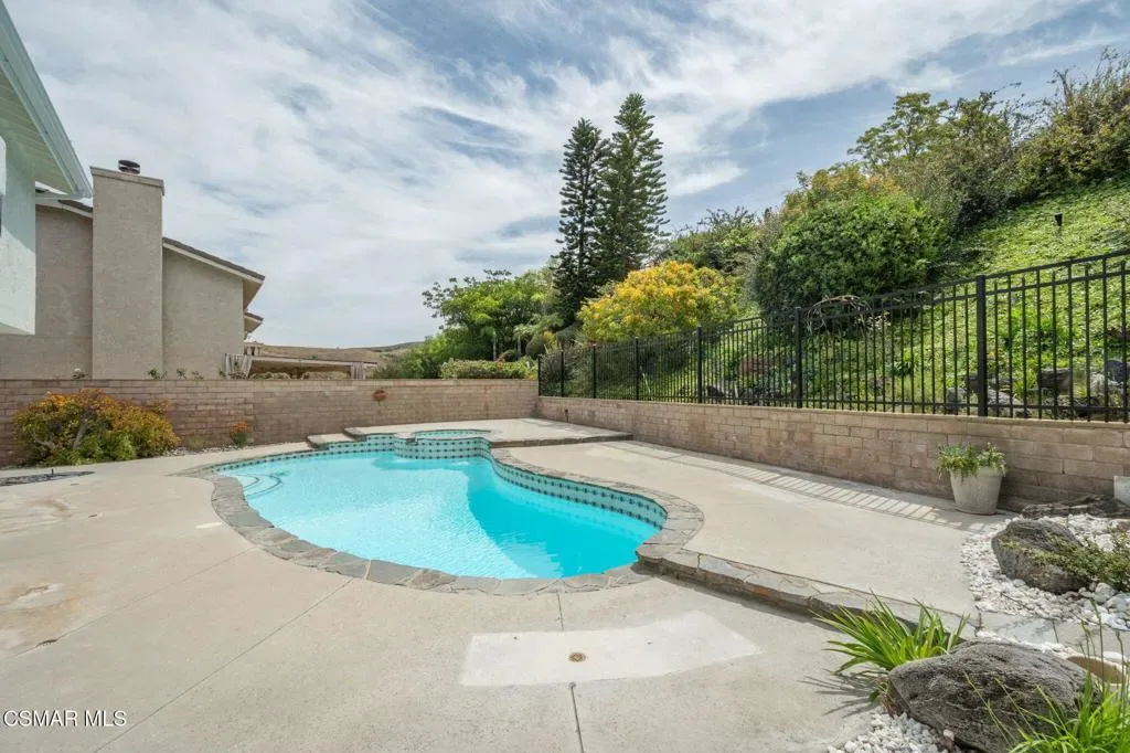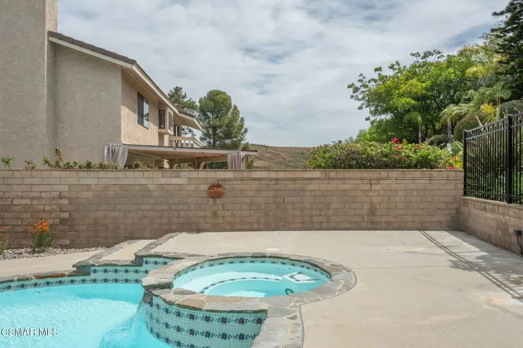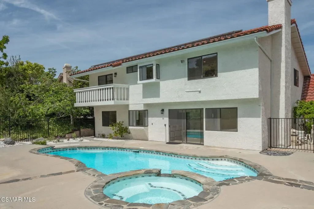 Step into this recently refurbished Thousand Oaks home situated in the highly desirable Fountainwood East neighborhood. Positioned with an excellent location, on a quiet cul-de-sac of only 7 homes. With a private gated courtyard and a well-thought-out floor plan, this home offers a dramatic spiral staircase entry with vaulted ceilings. Large spacious Living room flowing into the dining room. One bedroom downstairs with adjacent bathroom that has been fully upgraded with freestanding vanity, quartz counter-tops, tiled shower surround with glass enclosure. Spacious family room with F/P opens to the newly refurbished kitchen. The chef’s kitchen offers newly installed clean white cabinetry, quartz counter-tops, tile back splash, stainless steel appliances & walk-in pantry. Recent upgrades throughout the house include laminate plank flooring, interior/exterior paint, designer carpet, interior doors, baseboards, casing, interior light fixtures, LED recessed lighting, interior outlets & switches. Three large additional bedrooms upstairs. The luxurious primary suite offers a nice relaxing balcony. The ensuite bathroom is spa-like quality and feel, offering dual vanity, soaker tub, tile shower surround with glass enclosure and fully tiled floor to ceiling walls. A refurbished hall bathroom services the two additional large upstairs bedrooms. The backyard is a entertainers delight with sparkling pool, spa and nice mature landscaping. Three car garage with newly installed garage doors, partially drywalled, newly installed rain gutters and solar panels offering energy efficiency. Low HOA. Great convenient location near parks, top rated schools, hiking trails, restaurants, shopping, golf courses & freeway access. Don’t wait on this one!