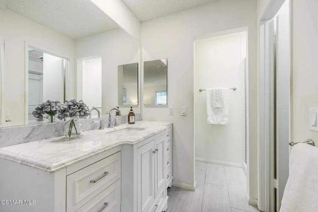 HUGE PRICE REDUCTION! This is the single story home you have been waiting for! No Interior Steps! This home is located in a superior location at the end of a large quiet cul de sac with a huge grassy space out front and a spacious, private, enclosed patio perfect for dining al fresco. Enjoy 3 Spacious Bedrooms and 2 Remodeled Bathrooms featuring newer marble topped white cabinetry and tiled showers with glass doors. Both bathrooms have wonderful skylights making the bathroom areas very light and bright. Special features include high ceilings, dual paned windows throughout, lovely wood-like flooring in the living areas, bedrooms and hallways and porcelain tile floors in both bathrooms. The kitchen has like-new, barely used gas range and dishwasher and is complemented with an adjacent dining room luxuriously fitted with plantation shutters. The living room features a brick hearth and decorative fireplace plus a large sliding door bringing in lots of natural light and easy access to the spacious private patio. The Primary Suite is very spacious with a fantastic walk-in closet and easily accommodates a king size bed. Enjoy central AC and furnace with a digital thermostat. Washer and Dryer are included. There is a private oversize single car garage with overhead shelving plus one reserved parking space and plenty of street parking for guests. Association amenities include a full size tennis court, pool and spa. Easy access to grocery shopping, dining, banking, coffee, yoga, fitness center, pilates, hiking trails, Sapwi Trails Community Park, Conejo Creek Dog Park, Hwy 23 and 101. Zoned for Fabulous Schools: Lang Ranch Elementary, Los Cerritos Middle School and Westlake HS.