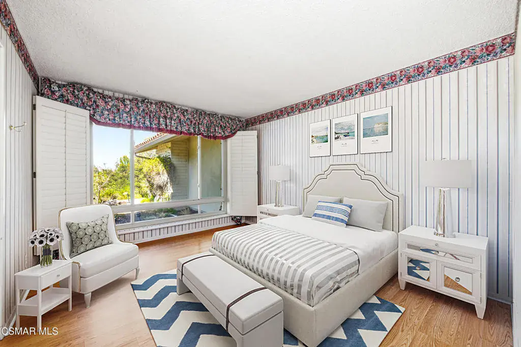 A Rare Opportunity to Create your Dream Estate in one of Thousand Oaks most coveted hidden enclaves! Tucked behind the private gates of Los Robles Hills Estates, this single-story residence (no steps inside) sits on over an acre of land, surrounded by mature trees, sweeping Conejo Valley views, and the kind of quiet luxury that is increasingly hard to find. With only 28 custom homes, this exclusive community offers unmatched privacy, natural beauty, and a lifestyle defined by space and serenity. Step inside and experience the scale of a home designed for both grand entertaining and effortless daily living. 4,544 square feet of open, flowing interiors include soaring vaulted ceilings, expansive gathering spaces, and an impressive great room anchored by a classic wet bar. This expansive room effortlessly adapts to your vision, whether it’s a plush, wraparound sectional for game day gatherings, a sophisticated billiards setup, or multiple intimate lounge areas for relaxed entertaining. Sunlight pours through a wall of windows, creating a warm, inviting glow and a seamless harmony between indoor living and the tranquil beauty of the outdoors. A spacious entertainer’s kitchen anchors the home, connecting to light filled living and dining rooms with beautiful vaulted ceilings and timeless architectural character. Every corner of the residence invites you to envision your own elevated style, whether modern or classic luxury. The floorplan features 4 bedrooms and 3.5 baths, including a private wing with two generous secondary bedrooms and a serene primary suite offering a walk-in closet, sliding glass doors, a vanity area, sunken tub, and separate shower. A large indoor laundry room and flexible bonus room with a cedar-lined walk-in closet provide additional options for an office, staff quarters, fitness room, or creative space. Outside, the possibilities are endless. The expansive view lot offers room to reimagine the grounds with resort worthy outdoor living, pool, gardens, entertaining patios, or anything else your lifestyle inspires.A three-car garage, two-car covered carport, and long private driveway ensure ample parking for residents and guests. The property also features a detached multi-purpose studio shed, an ideal space for hands-on projects, creative pursuits, or simply organizing the essentials of daily living. It’s a flexible extension of the home that adapts effortlessly to your needs. And while the estate feels worlds away, you’re just minutes from Westlake Village, top rated amenities, and beloved hiking and biking trails.This is more than a home, it’s a canvas for your vision. A rare opportunity that doesn’t come around very often in one of the Conejo Valley’s most prestigious neighborhoods. Photos have been virtually staged