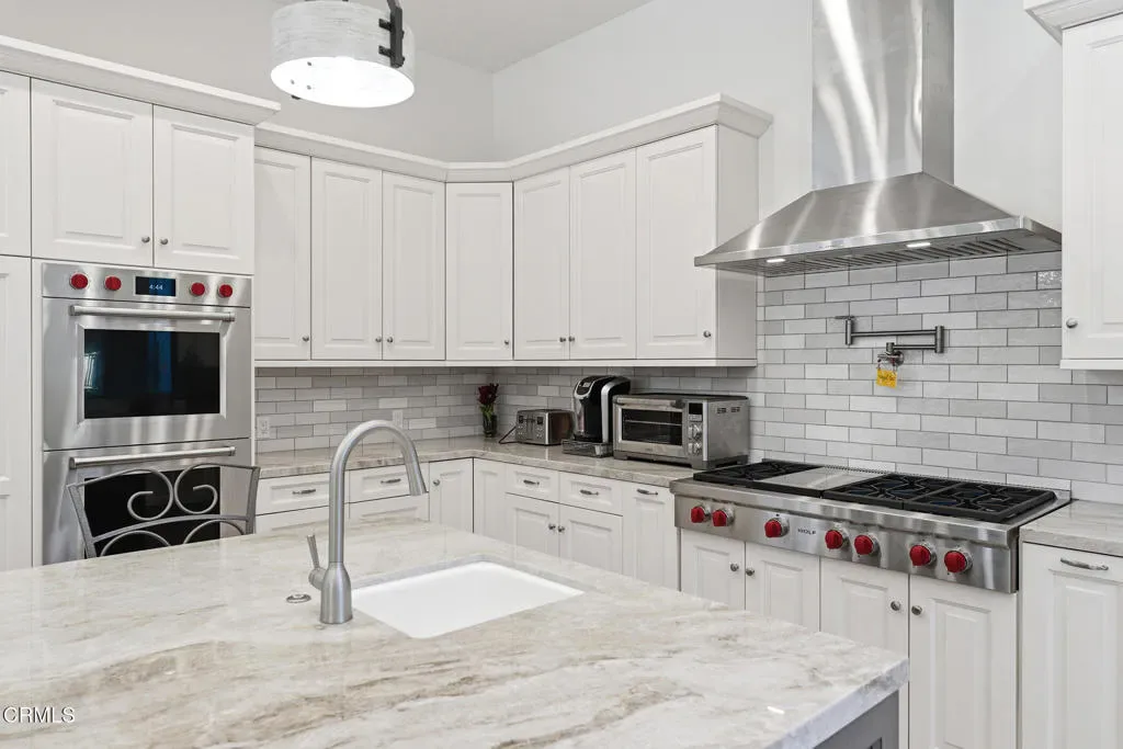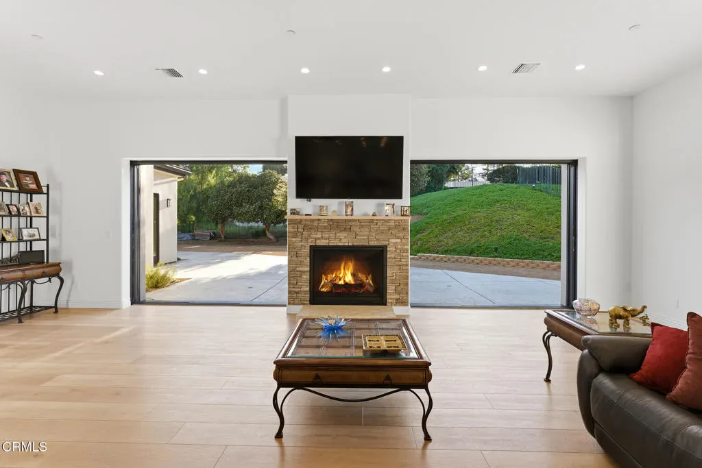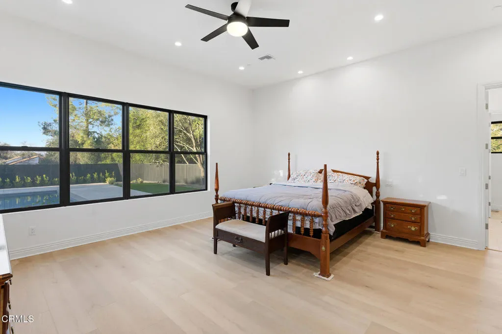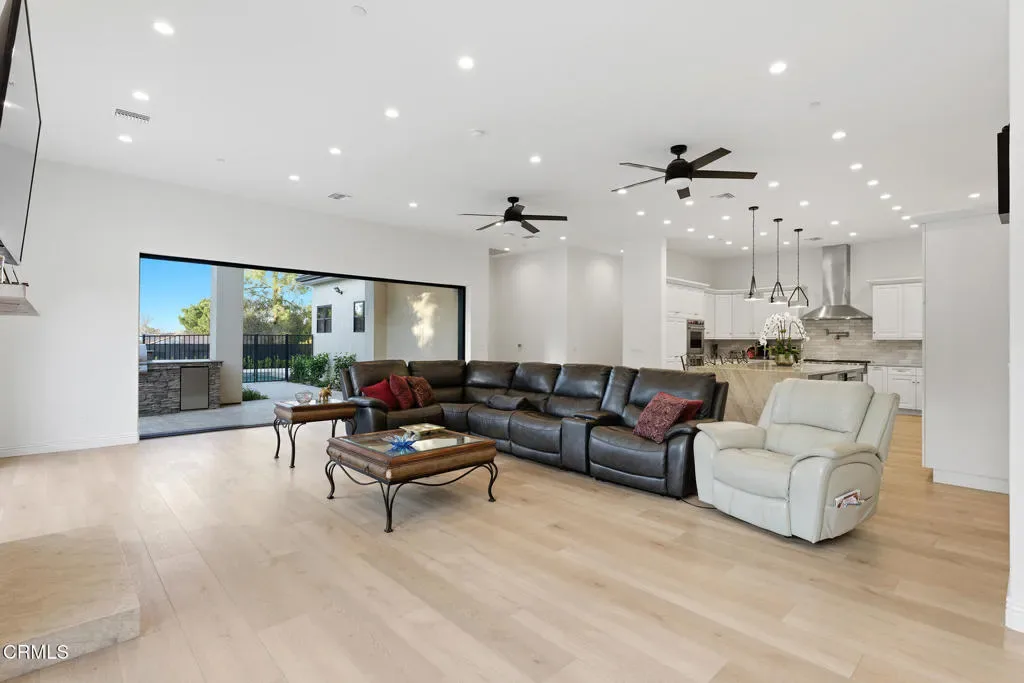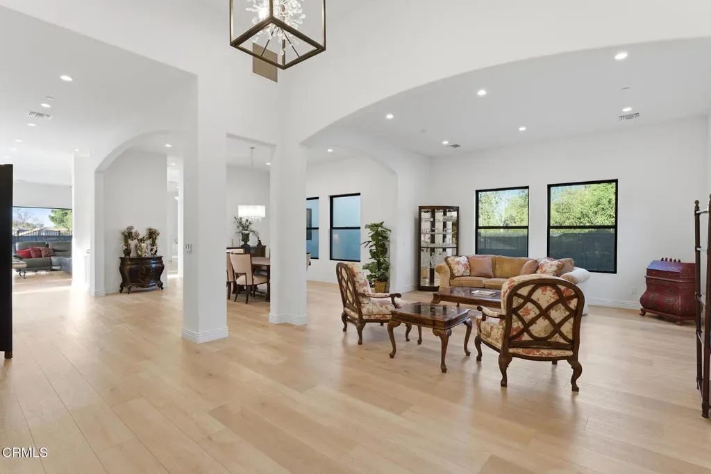 Set on a sweeping 1.33-acre corner lot in the prestigious Los Robles Estates, this one-of-a-kind custom luxury residence spans 3,725 square feet and delivers an extraordinary blend of sophistication, privacy, and resort-style living. A fully enclosed iron perimeter fence and 20-foot electric entry gate make a commanding first impression. Step inside to a grand entry with a soaring 14-foot ceiling, opening to an open-concept floor plan with 11-foot ceilings throughout the home. Wide-plank Archwood flooring flows through the main living areas. The show stopping gourmet kitchen features Sub-Zero refrigerator/freezer, Wolf range and oven, Bosch dishwasher with warming drawer, Taj Mahal quartzite countertops, French white soft-close, raised panel cabinetry, farm sink, prep sink, and reflective subway tile backsplash. A total of six bathrooms; four bathrooms are en-suite. The spa-inspired primary bath offers a Hydrospa Jacuzzi soaking tub, separate shower, Panasonic ceiling heater, and quartz countertops. In addition, an entry bath and to top it off an outdoor pool bath with stall shower for customization and privacy. Smart home features include a 3-zone programmable HVAC system with three independent AC units, two 50-amp EV charging outlets, and custom exterior lighting throughout. A fully paid 9.20kW solar system with battery backup (Sunpower, no lease) slashes utility costs. Step outside to a resort-style pool and spa with Pentair controls and color-changing LED lighting, a built-in BBQ island, firepit, and lush synthetic turf. Two separate garages allow you to park six vehicles and provide ample room for storage and more. Concrete tile roof. HOA $670/quarter. Enjoy a prime location just moments from Los Robles Greens Golf Course and an extensive network of picturesque hiking and biking trails. A statement property designed for those who demand luxury, privacy, and an unparalleled lifestyle in one of Thousand Oaks’ most coveted neighborhoods.
