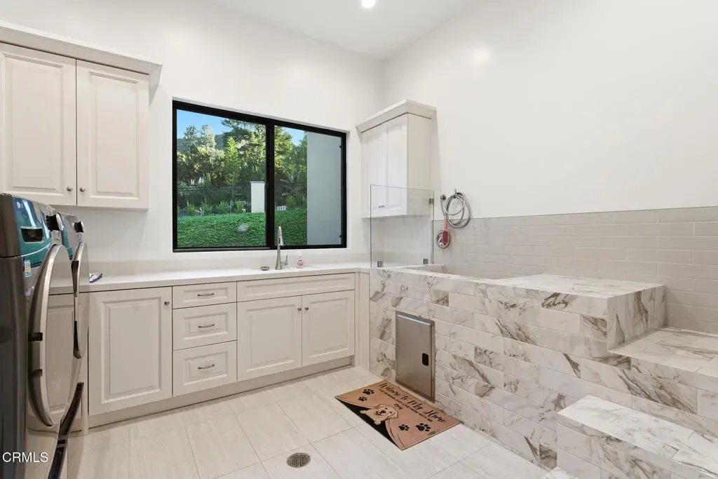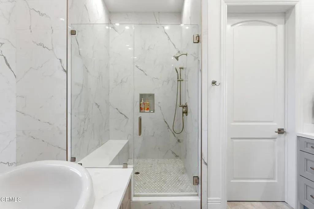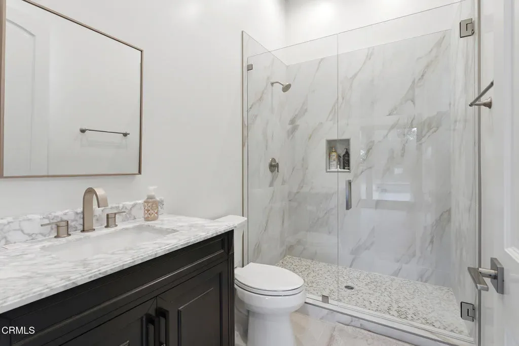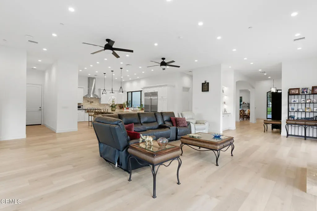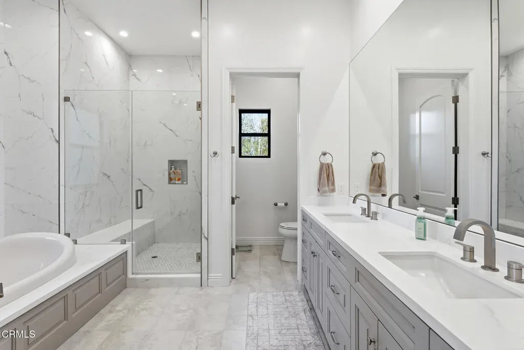 Set on a sweeping 1.33-acre corner lot in the prestigious Los Robles Estates, this one-of-a-kind custom luxury residence spans 3,725 square feet and delivers an extraordinary blend of sophistication, privacy, and resort-style living. A fully enclosed iron perimeter fence and 20-foot electric entry gate make a commanding first impression. Step inside to a grand entry with a soaring 14-foot ceiling, opening to an open-concept floor plan with 11-foot ceilings throughout the home. Wide-plank Archwood flooring flows through the main living areas. The show stopping gourmet kitchen features Sub-Zero refrigerator/freezer, Wolf range and oven, Bosch dishwasher with warming drawer, Taj Mahal quartzite countertops, French white soft-close, raised panel cabinetry, farm sink, prep sink, and reflective subway tile backsplash. A total of six bathrooms; four bathrooms are en-suite. The spa-inspired primary bath offers a Hydrospa Jacuzzi soaking tub, separate shower, Panasonic ceiling heater, and quartz countertops. In addition, an entry bath and to top it off an outdoor pool bath with stall shower for customization and privacy. Smart home features include a 3-zone programmable HVAC system with three independent AC units, two 50-amp EV charging outlets, and custom exterior lighting throughout. A fully paid 9.20kW solar system with battery backup (Sunpower, no lease) slashes utility costs. Step outside to a resort-style pool and spa with Pentair controls and color-changing LED lighting, a built-in BBQ island, firepit, and lush synthetic turf. Two separate garages allow you to park six vehicles and provide ample room for storage and more. Concrete tile roof. HOA $670/quarter. Enjoy a prime location just moments from Los Robles Greens Golf Course and an extensive network of picturesque hiking and biking trails. A statement property designed for those who demand luxury, privacy, and an unparalleled lifestyle in one of Thousand Oaks’ most coveted neighborhoods.