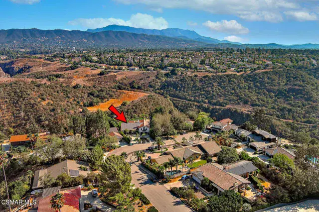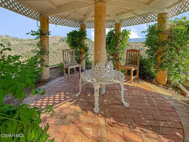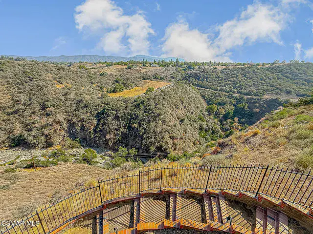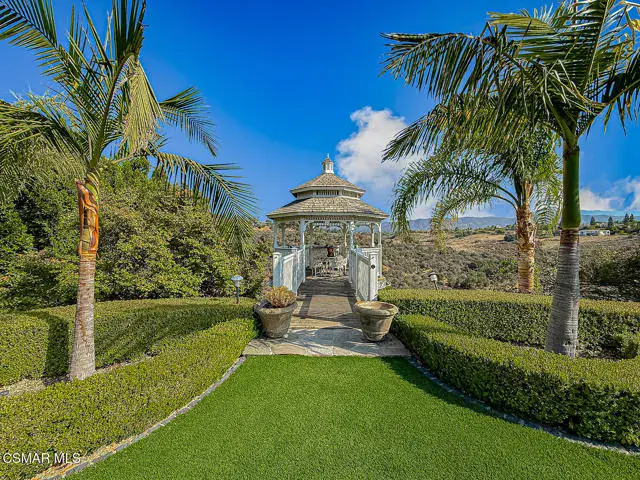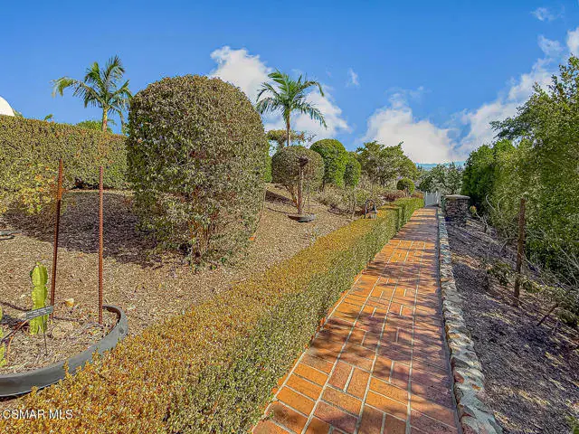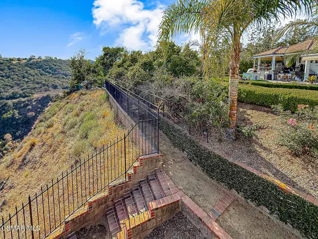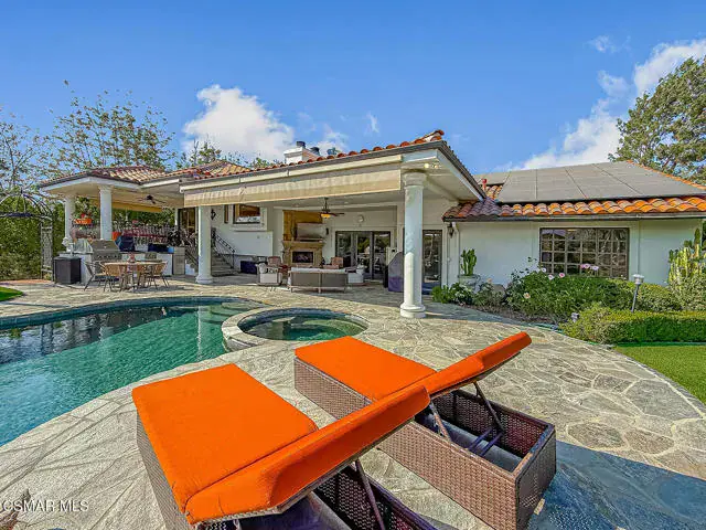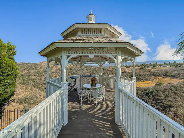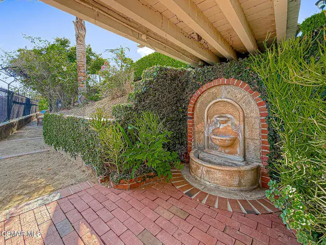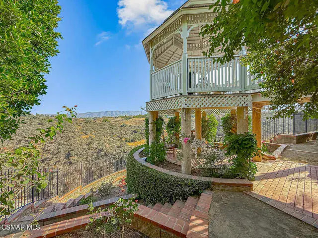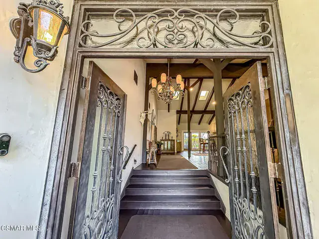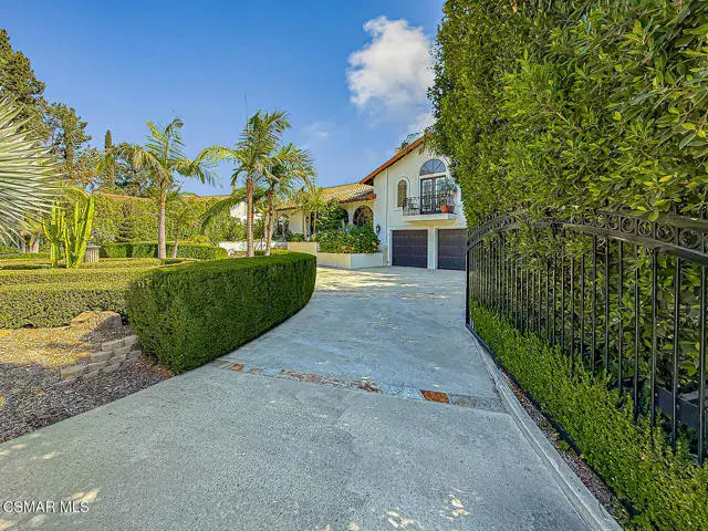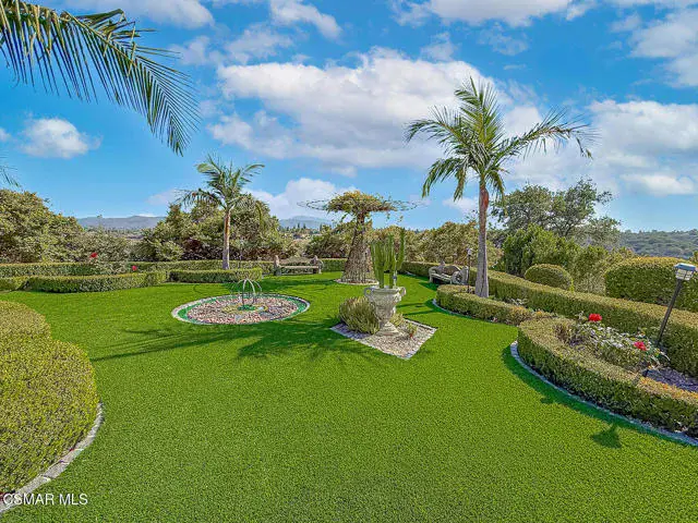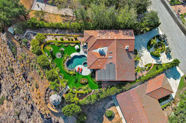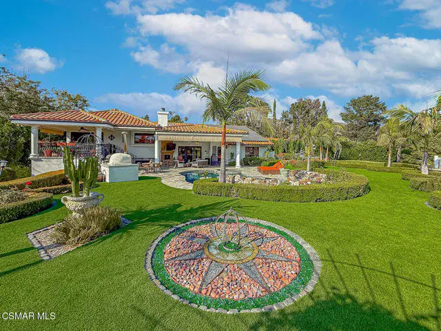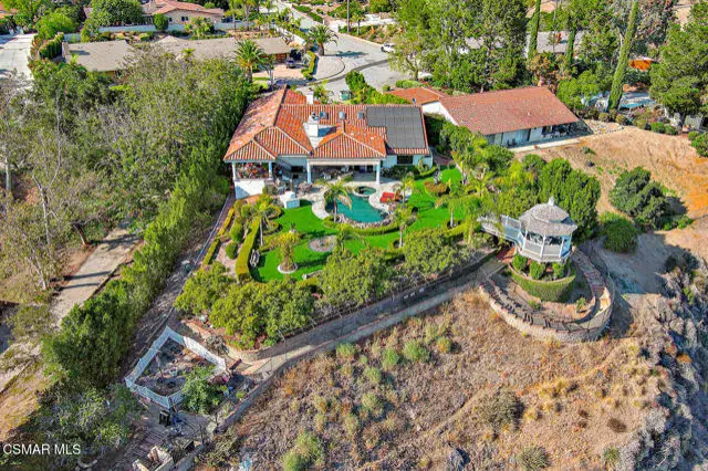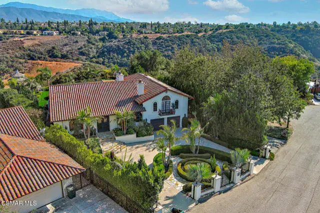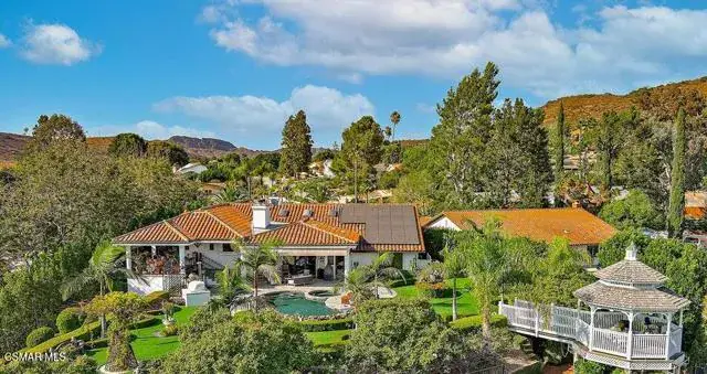 Rustic elegance, spaciousness, remodeled, stunning, breathtaking views ~~these are only a few words to describe this estate. ~~You really must see it and picture yourself here entertaining or enjoying an early morning cup of coffee in this stunning yard on the upper terrace. ~~Nestled in the exclusive neighborhood of Lynn Ranch, this home offers the tranquility of a cul-de-sac location in addition to the dramatic surroundings of serene canyon views and a running stream. Located on an approx. 25,000 sq. ft. lot and a house which is about 3,800 sq. ft. ~It is set back from the street accessed by an automatic dual gate and circular driveway. Not only is there a deep 2 car garage, there is enough parking for 5+ cars. This property combines rustic elegance with wood beams and stone fireplaces with luxurious amenities: secret wine cellar, saltwater pool/spa and a gourmet kitchen.Once you enter through the massive iron doors you look up at a beautiful 2 story vaulted ceiling. The gourmet kitchen with panoramic views ~ is well equipped with high end appliances (Sub-Zero, 2 ovens, glass front cabinets, an island and a deep custom sink). This home also includes modern green-features: a SOLAR SYSTEM owned by the seller (no lease) with a battery backup system-4 batteries included- All 3 baths have been remodeled~ the ensuite bath to the primary bedroom is exquisite! (Much like your own spa). The tile throughout in all 3 baths is gorgeous. Outdoor entertaining is absolutely a standout for you and any parties. There is a saltwater pool/spa, an upper terrace for dining and a lower patio complete with stainless steel built ins. To complete the dining experience there is a pizza oven! This lot is beautifully landscaped featuring lush gardens, walkways, a greenhouse, fabulous gazebo and views out to the canyon and enchanting stream below. The property backs onto the Arroyo Canyon Natural Area. The views are expansive and the sunsets dramatic! When you combine the large view lot, high end finishes, and the solar system you have a truly distinctive upscale property in Thousand Oaks– and one you should come and preview! You will never want to leave!