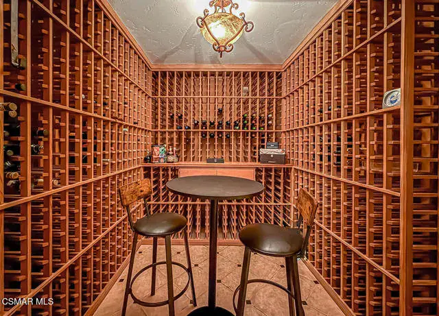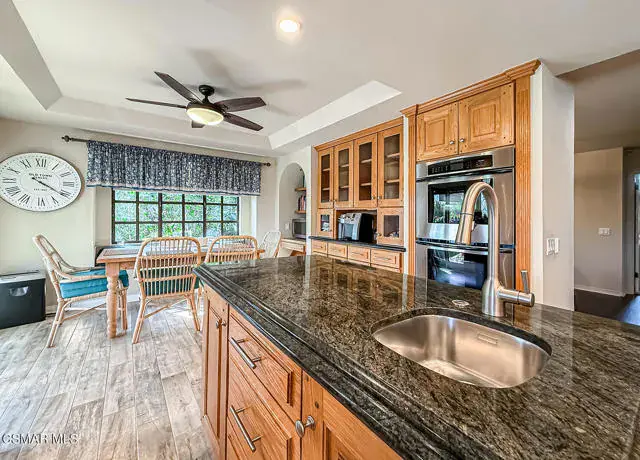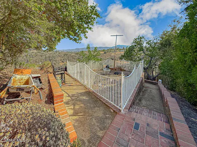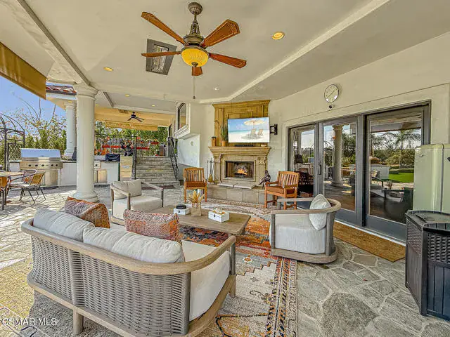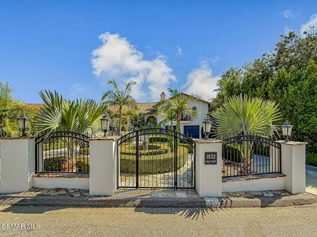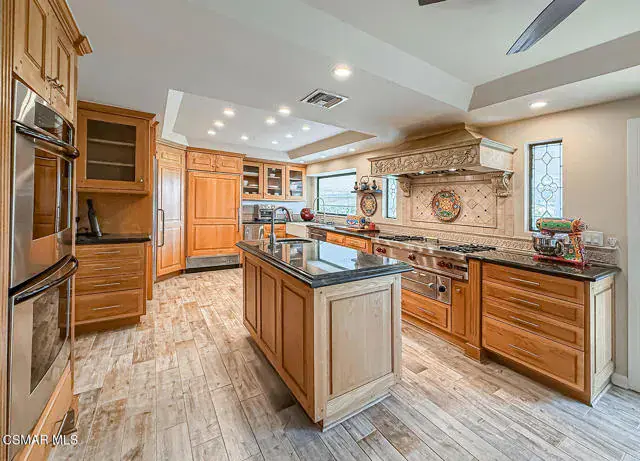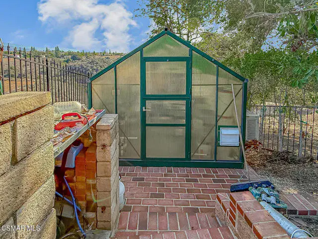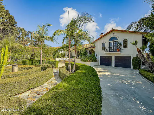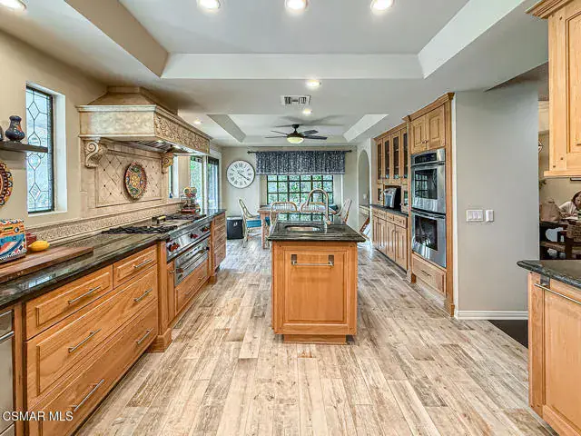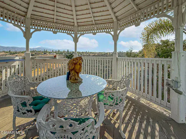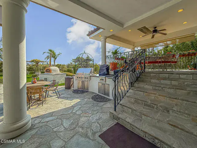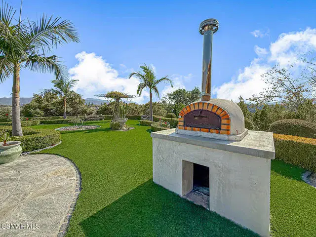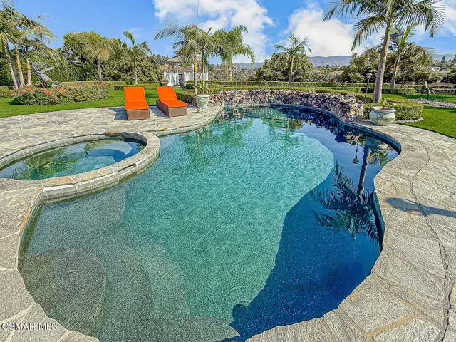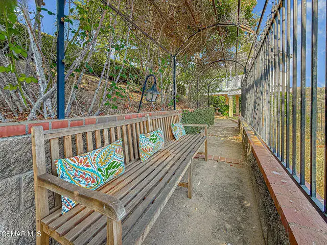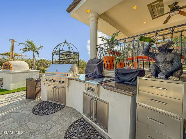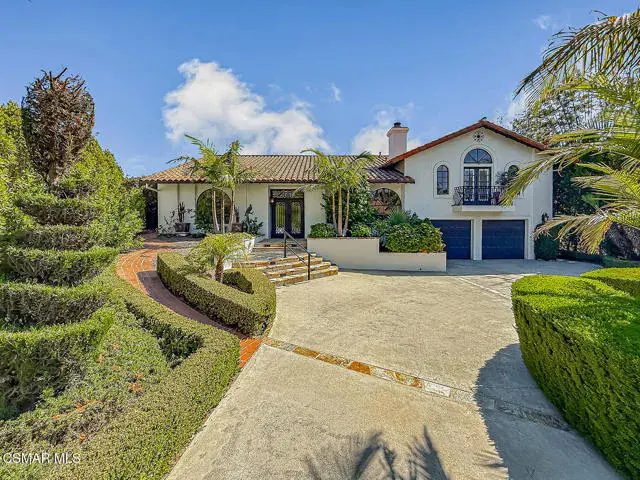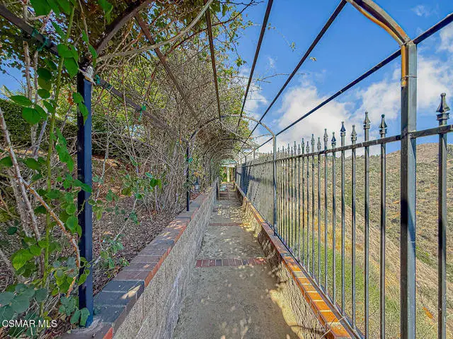 Rustic elegance, spaciousness, remodeled, stunning, breathtaking views ~~these are only a few words to describe this estate. ~~You really must see it and picture yourself here entertaining or enjoying an early morning cup of coffee in this stunning yard on the upper terrace. ~~Nestled in the exclusive neighborhood of Lynn Ranch, this home offers the tranquility of a cul-de-sac location in addition to the dramatic surroundings of serene canyon views and a running stream. Located on an approx. 25,000 sq. ft. lot and a house which is about 3,800 sq. ft. ~It is set back from the street accessed by an automatic dual gate and circular driveway. Not only is there a deep 2 car garage, there is enough parking for 5+ cars. This property combines rustic elegance with wood beams and stone fireplaces with luxurious amenities: secret wine cellar, saltwater pool/spa and a gourmet kitchen.Once you enter through the massive iron doors you look up at a beautiful 2 story vaulted ceiling. The gourmet kitchen with panoramic views ~ is well equipped with high end appliances (Sub-Zero, 2 ovens, glass front cabinets, an island and a deep custom sink). This home also includes modern green-features: a SOLAR SYSTEM owned by the seller (no lease) with a battery backup system-4 batteries included- All 3 baths have been remodeled~ the ensuite bath to the primary bedroom is exquisite! (Much like your own spa). The tile throughout in all 3 baths is gorgeous. Outdoor entertaining is absolutely a standout for you and any parties. There is a saltwater pool/spa, an upper terrace for dining and a lower patio complete with stainless steel built ins. To complete the dining experience there is a pizza oven! This lot is beautifully landscaped featuring lush gardens, walkways, a greenhouse, fabulous gazebo and views out to the canyon and enchanting stream below. The property backs onto the Arroyo Canyon Natural Area. The views are expansive and the sunsets dramatic! When you combine the large view lot, high end finishes, and the solar system you have a truly distinctive upscale property in Thousand Oaks– and one you should come and preview! You will never want to leave!