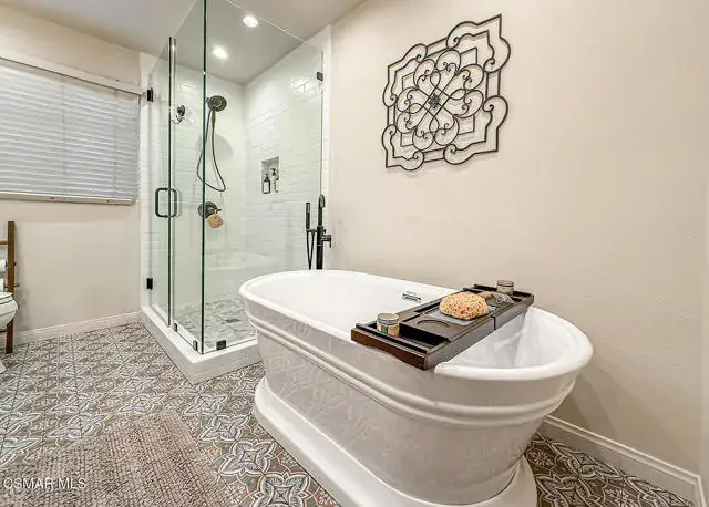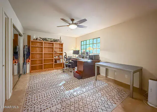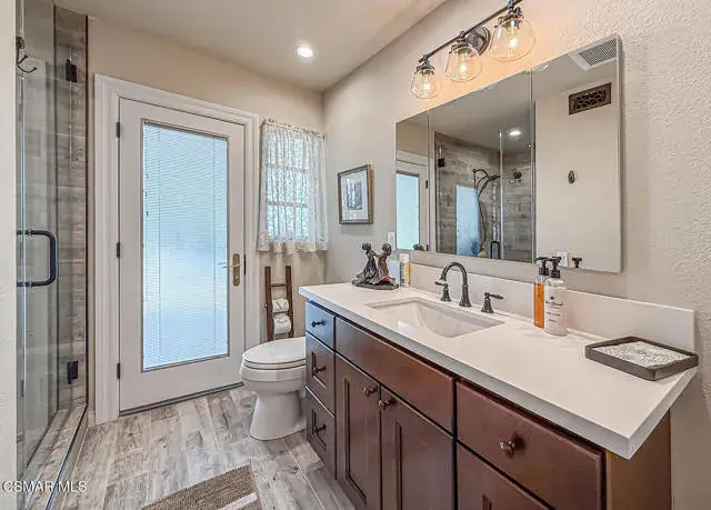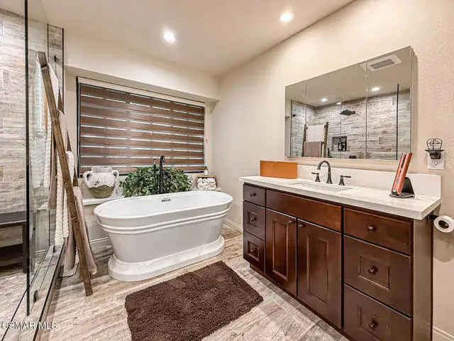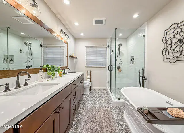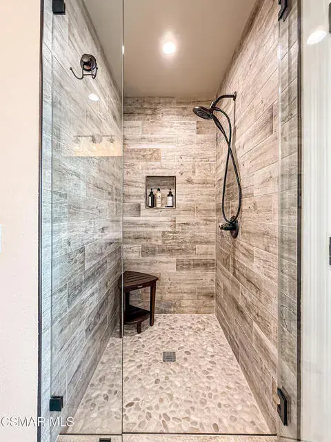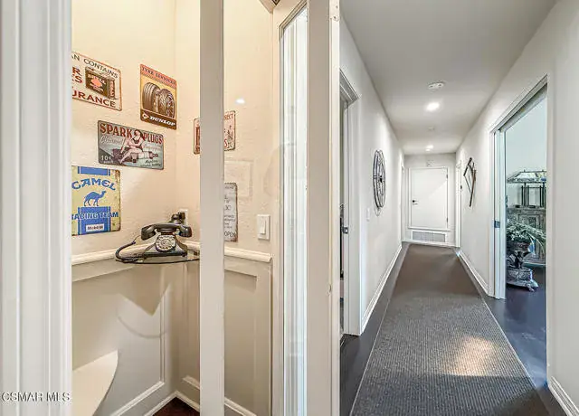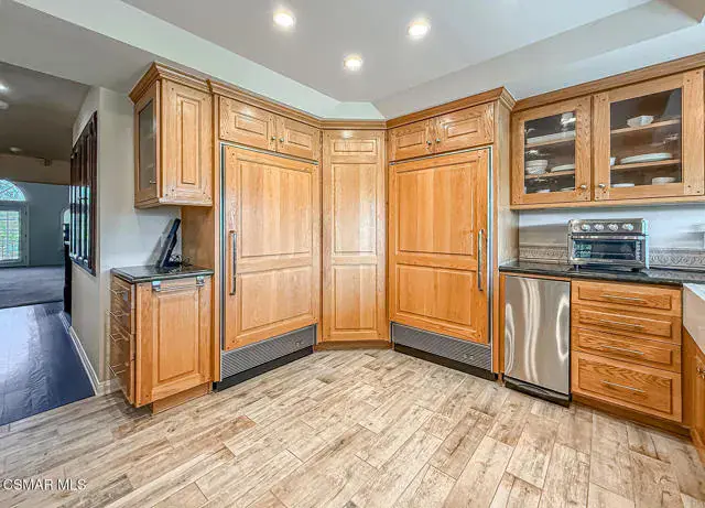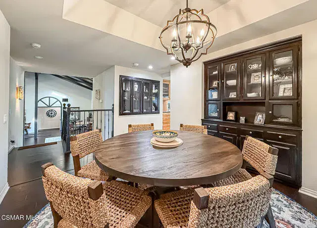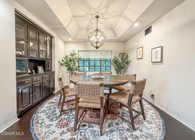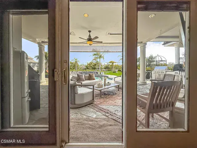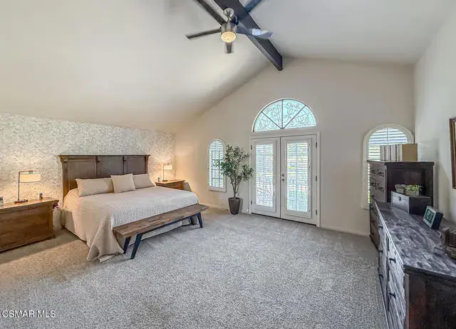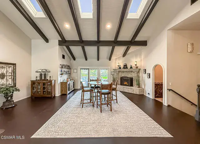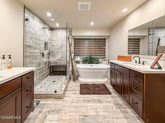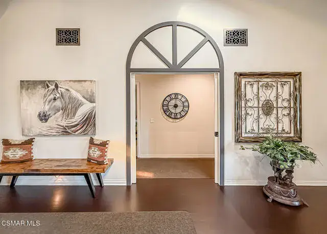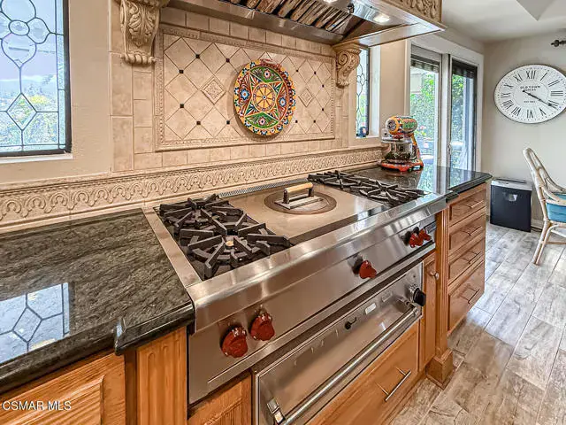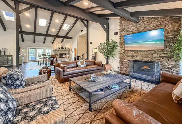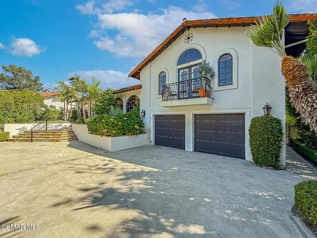 Rustic elegance, spaciousness, remodeled, stunning, breathtaking views ~~these are only a few words to describe this estate. ~~You really must see it and picture yourself here entertaining or enjoying an early morning cup of coffee in this stunning yard on the upper terrace. ~~Nestled in the exclusive neighborhood of Lynn Ranch, this home offers the tranquility of a cul-de-sac location in addition to the dramatic surroundings of serene canyon views and a running stream. Located on an approx. 25,000 sq. ft. lot and a house which is about 3,800 sq. ft. ~It is set back from the street accessed by an automatic dual gate and circular driveway. Not only is there a deep 2 car garage, there is enough parking for 5+ cars. This property combines rustic elegance with wood beams and stone fireplaces with luxurious amenities: secret wine cellar, saltwater pool/spa and a gourmet kitchen.Once you enter through the massive iron doors you look up at a beautiful 2 story vaulted ceiling. The gourmet kitchen with panoramic views ~ is well equipped with high end appliances (Sub-Zero, 2 ovens, glass front cabinets, an island and a deep custom sink). This home also includes modern green-features: a SOLAR SYSTEM owned by the seller (no lease) with a battery backup system-4 batteries included- All 3 baths have been remodeled~ the ensuite bath to the primary bedroom is exquisite! (Much like your own spa). The tile throughout in all 3 baths is gorgeous. Outdoor entertaining is absolutely a standout for you and any parties. There is a saltwater pool/spa, an upper terrace for dining and a lower patio complete with stainless steel built ins. To complete the dining experience there is a pizza oven! This lot is beautifully landscaped featuring lush gardens, walkways, a greenhouse, fabulous gazebo and views out to the canyon and enchanting stream below. The property backs onto the Arroyo Canyon Natural Area. The views are expansive and the sunsets dramatic! When you combine the large view lot, high end finishes, and the solar system you have a truly distinctive upscale property in Thousand Oaks– and one you should come and preview! You will never want to leave!