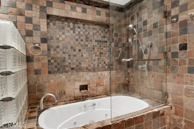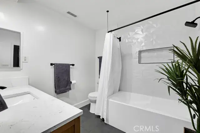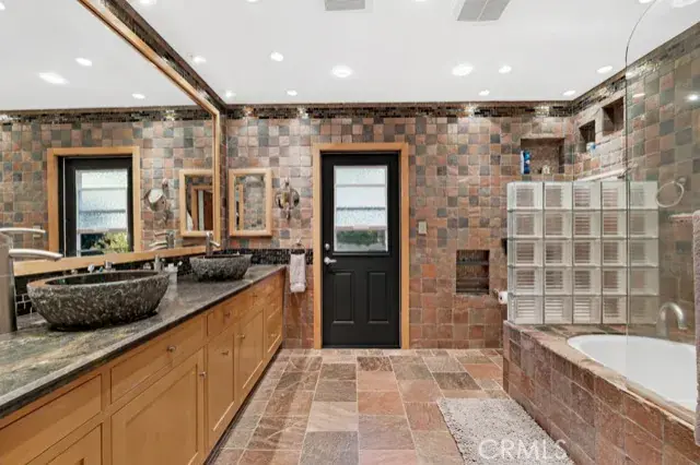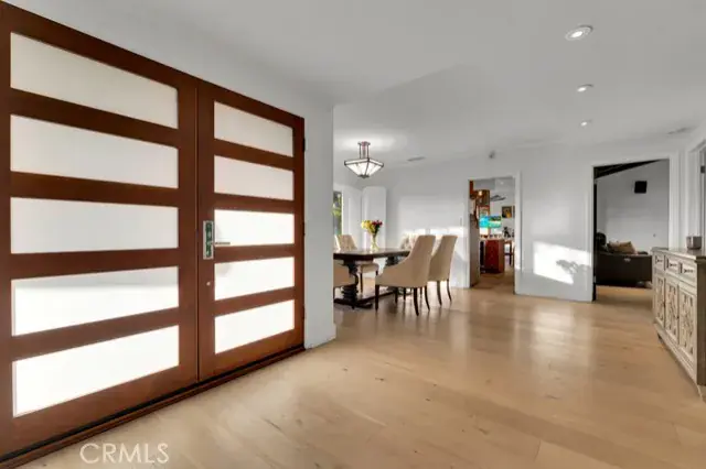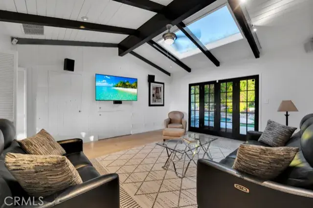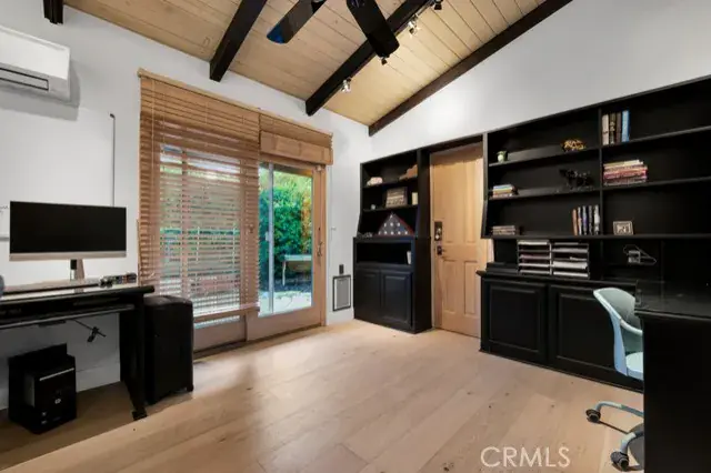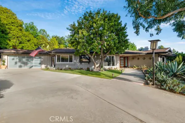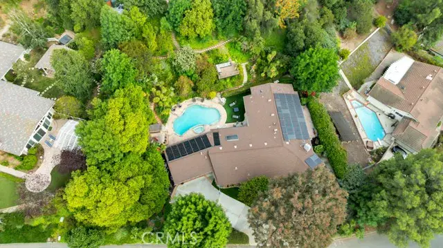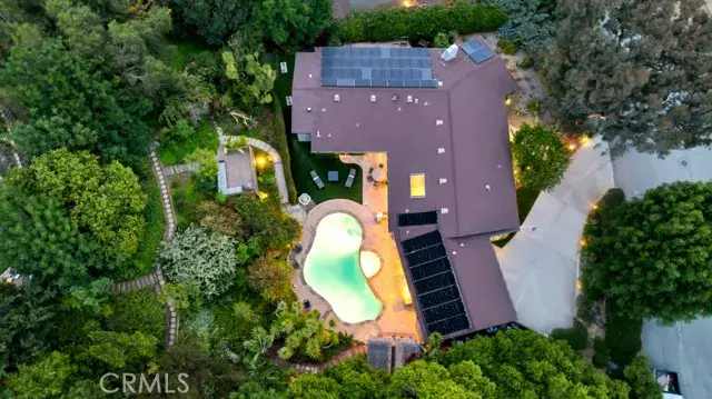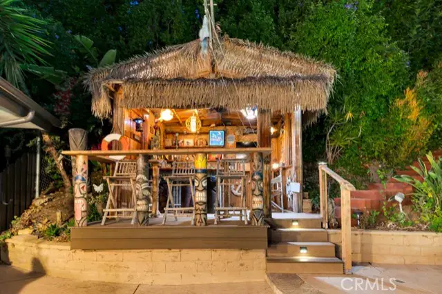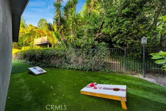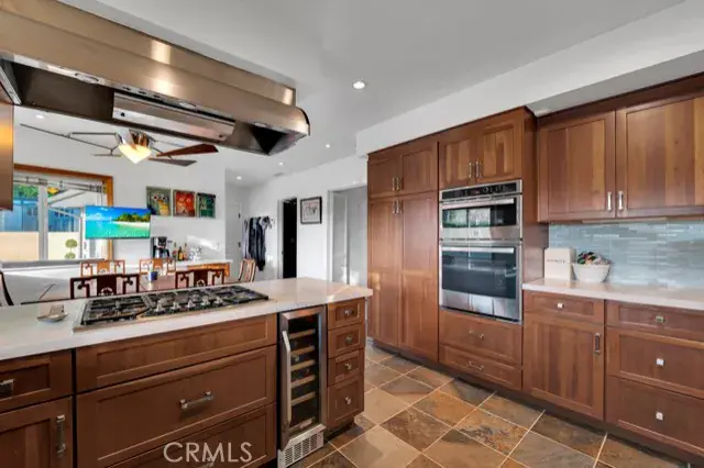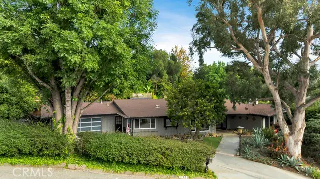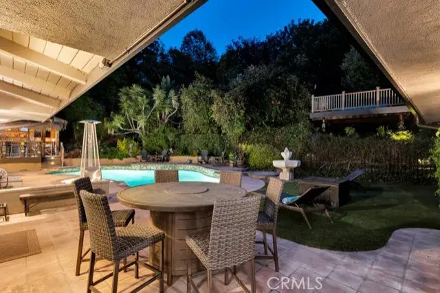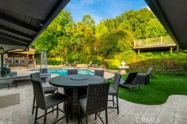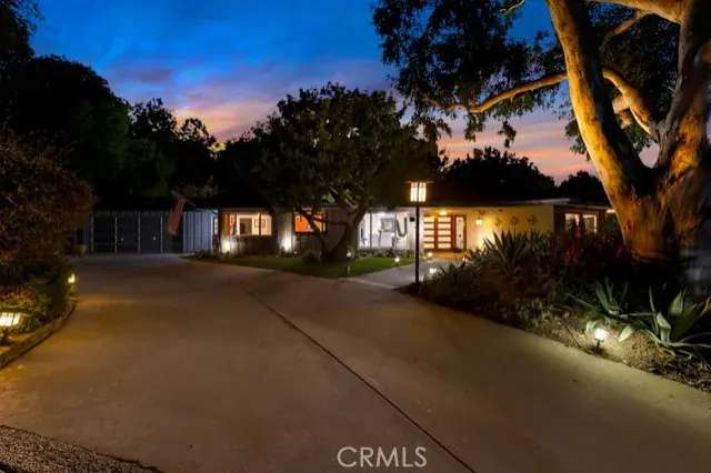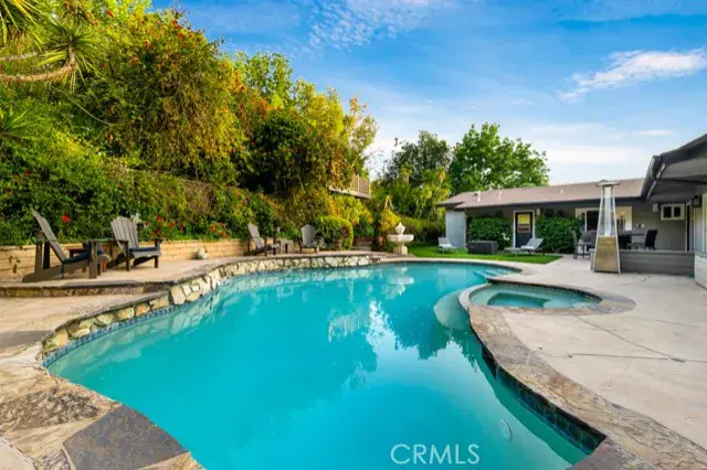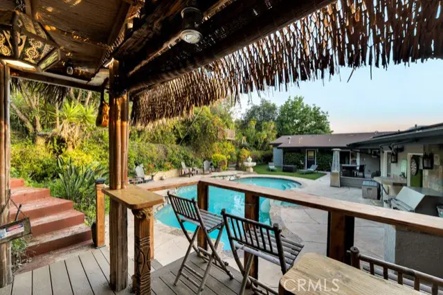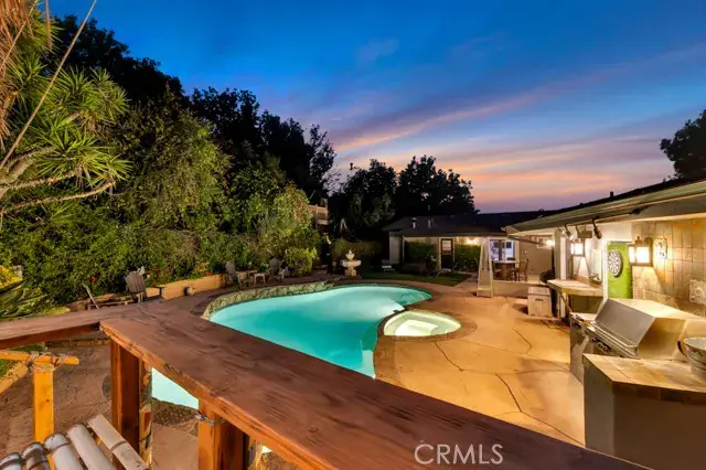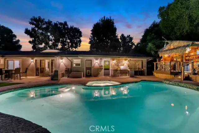 Prepare to fall in love with this incredible home! The large concrete driveway accommodates 6+ cars, providing ample parking. Upon entering through the modern double doors, you’ll be greeted by gorgeous hardwood floors, recessed lighting, and designer touches throughout. The spacious living room boasts a beautiful fireplace adorned with a striking ebony Roman clay finish. This home is designed for seamless indoor/outdoor living, with all bedrooms, the living room, and the family room offering direct access to the backyard. The kitchen features slate tile floors, cherry cabinets, quartz countertops, and high-end stainless steel appliances, including Thermador and Bosch, as well as a wine fridge. Adjacent to the kitchen is the family room, which showcases vaulted ceilings, a skylight, and French doors leading to a tropical paradise in the backyard. The expansive master suite includes a large bathroom with a dual-sink custom vanity, slate tile, a massive spa tub, and direct access to the pool area. The master bedroom features an impressive 8’x28′ closet, ensuring ample space for even the largest shoe collection, along with crown moldings and a stylish accent wall. One of the bedrooms has been converted into a home office equipped with built-in desks and bookshelves, while the other two bedrooms are spacious and share a newly remodeled Jack and Jill bathroom. All bedrooms come with ceiling fans for added comfort. The backyard is an entertainer’s paradise, boasting a tiki theme that will make every day feel like a vacation. Enjoy the sparkling pool and spa, a built-in Viking BBQ, a generous patio area, lush vegetation, and a tiki bar overlooking the pool. Take in the stunning sunsets from the larger of two maintenance-free synthetic wood decks, or escape to the smaller deck hidden among the trees. Additional highlights include a convenient 3/4 bath off the pool, a large laundry room (with newer washer and dryer included), landscape lighting in both the front and back, a 2-car attached garage with a frosted glass door, and an EV charger. All of this in the incredibly desirable neighborhood of Lynn Ranch with only a $200/year VOLUNTARY HOA.