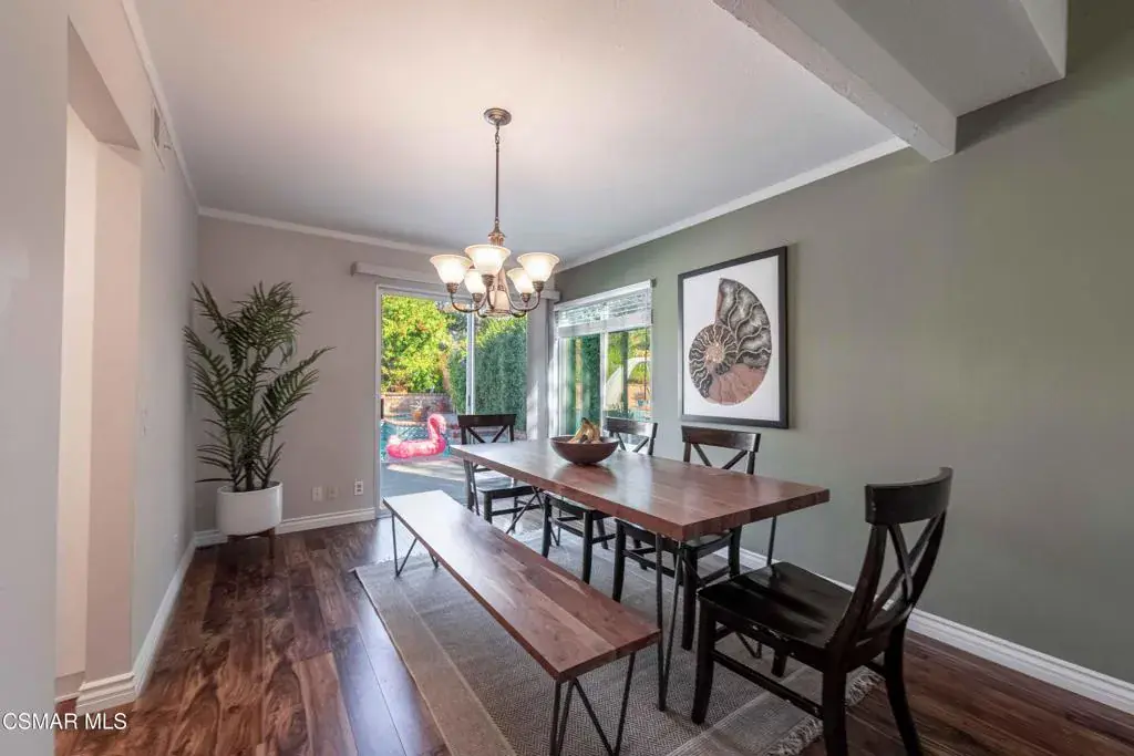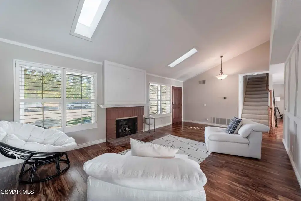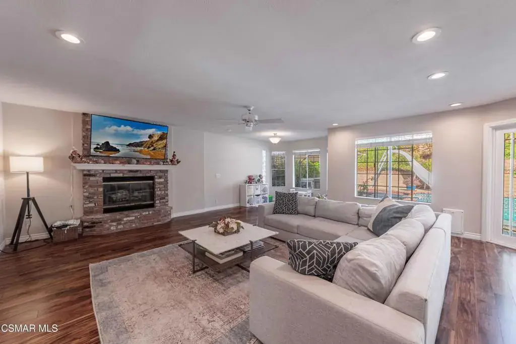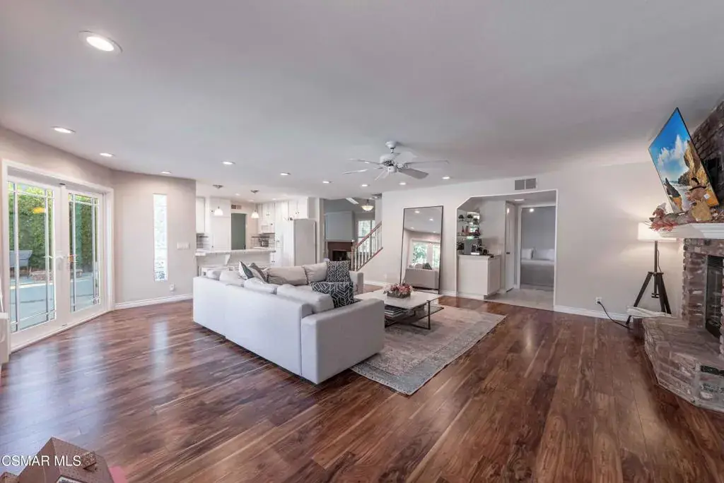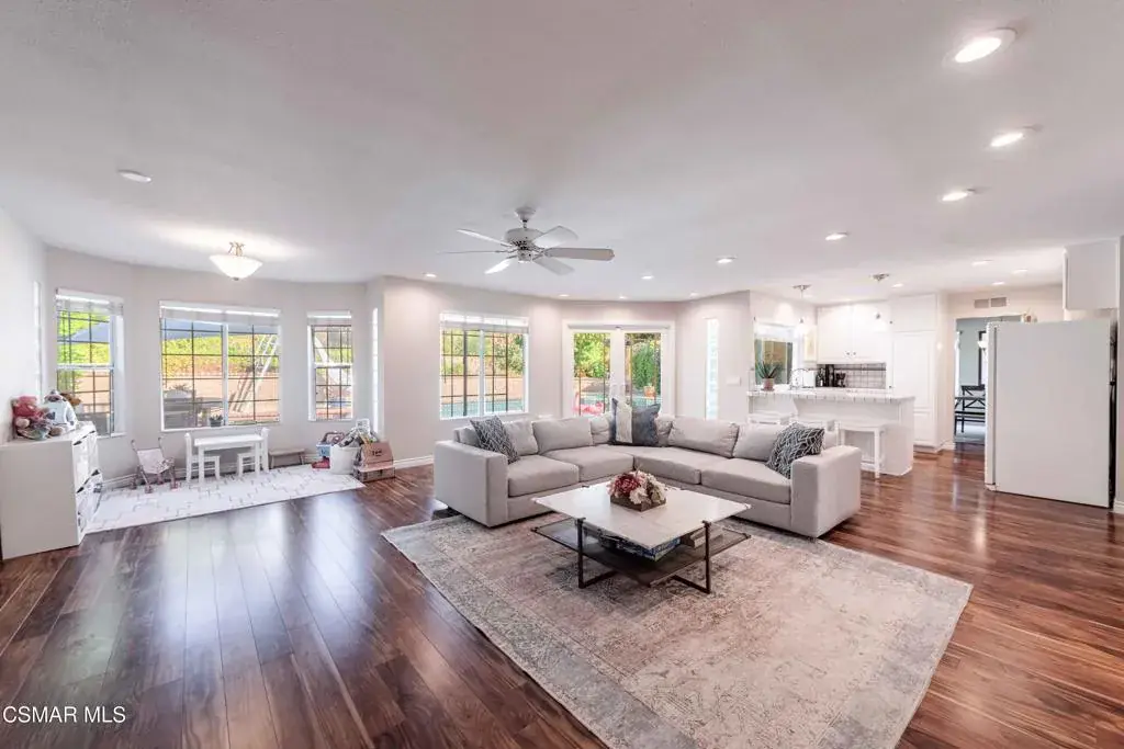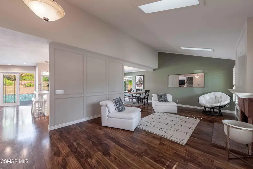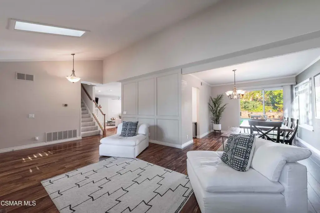 Move right into this beautiful home superbly located on a quiet culdesac in a wonderful area of Thousand Oaks. Situated at the edge of the beautiful Sapwi Trails Community Park, hiking and biking are just steps away. This home does not disappoint with it’s well-thought out floorplan and cheerful ambiance that includes vaulted living room ceiling with skylights; french doors, and plantation shutters. As the largest floorplan in the tract, this home boasts an additional added 220 sq ft of living area in the family room, where you need it the most! Kitchen adjoins with white cabinetry and a view out to the scenic backyard. There’s a breakfast bar featuring pendent lighting for casual meals, as well as a formal dining room with slider for moving the party outside for some al fresco dining. Rounding out the downstairs is a coffee or wet bar for enhanced entertaining and convenient powder room. There’s also direct access to the former garage, turned into flex space, makes a great guest/office space. Features laundry area, plus separate storage, it could easily be turned back into a two car garage or possible ADU. As you head upstairs you will find 4 comfortably sized bedrooms. The three secondary bedrooms share the hall bath outfitted with white subway tile while the spacious primary bedroom features delightful mountain views and is equipped with a large well organized wardrobe closet and upgraded bath. Once outside, the backyard beckons you to stay and play. Vacation at home in large sparkling pool and soothing spa, Dine under the stars or enjoy the lush landscaping, where butterflies and hummingbirds come to visit. The perfect balance of indoor comfort and outdoor enjoyment. Welcome home to SoCal living at its best!