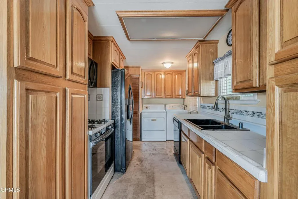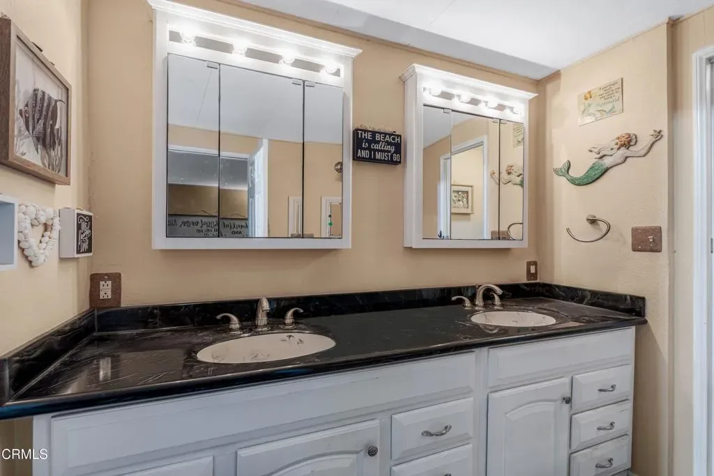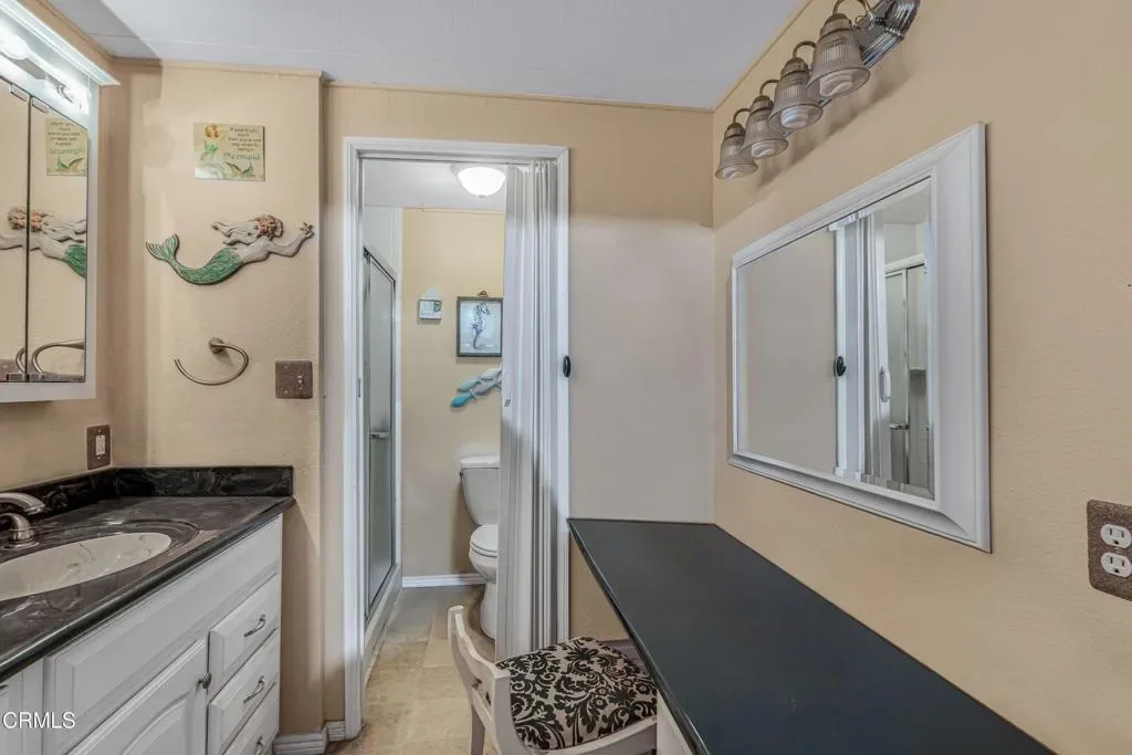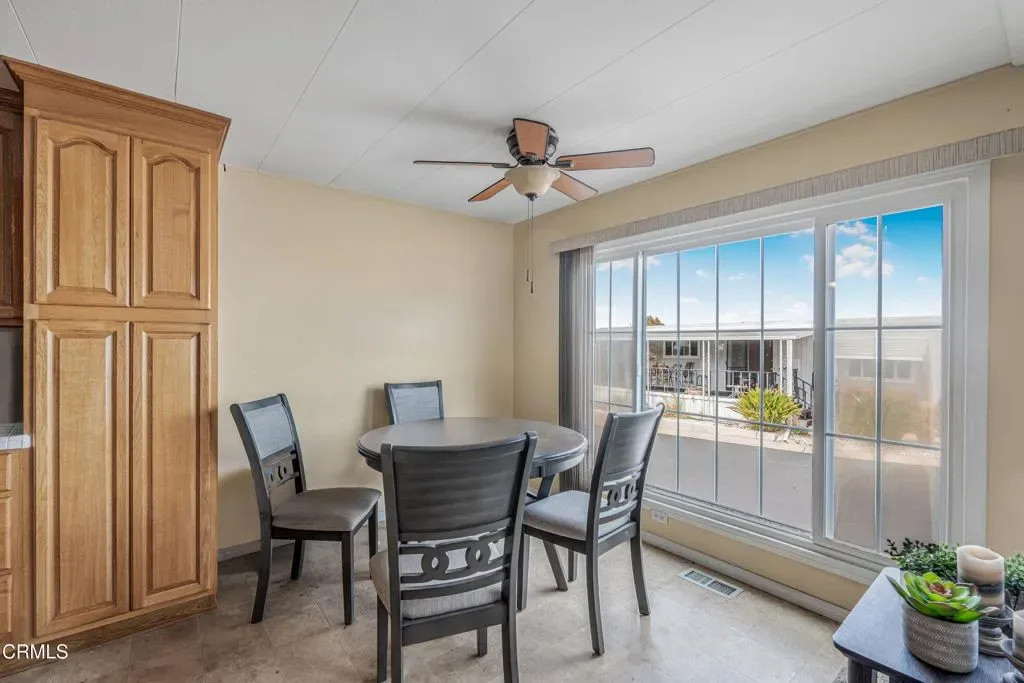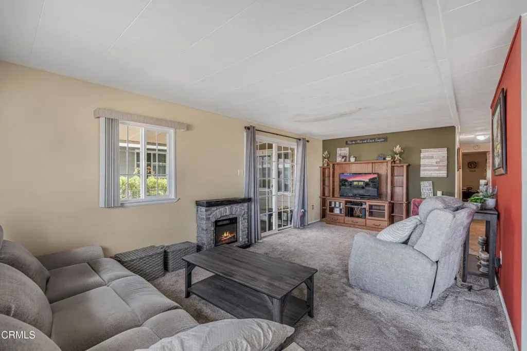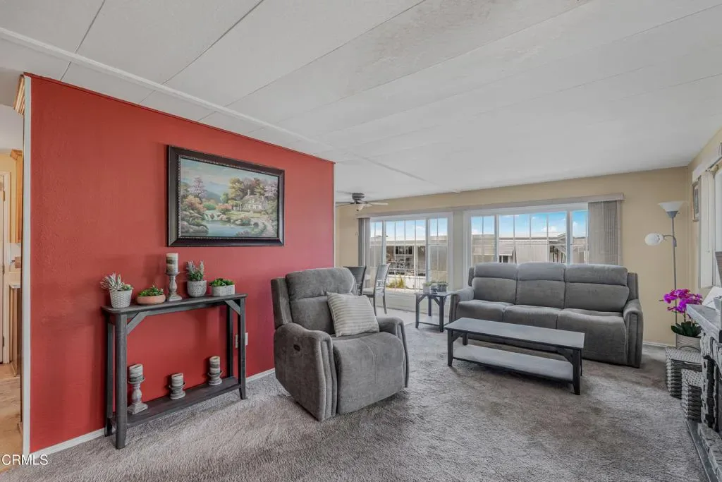 Welcome to this beautifully 2 bedroom, 2 bath home in the desirable Ventu Estates 55+ mobile home community. The spacious primary suite offers an oversized bedroom, a walk-in closet, and a tastefully remodeled bath featuring dual sinks, lighted cabinets, and a large mirrored vanity with built-in lighting.A generous attached sunroom, which can be used as a reading retreat, exercise space, and additional storage, adds even more versatility beyond the listed square footage. It is accessible from both the primary suite and the front porch.The extended width carport provides parking for up to three vehicles. Major improvements completed within the last 10 years include the roof, siding, kitchen, double pane windows, door, and a water heater.Ideally located just minutes from the freeway, shopping, and the Stagecoach Museum, this home offers comfort, convenience, and thoughtful upgrades throughout.