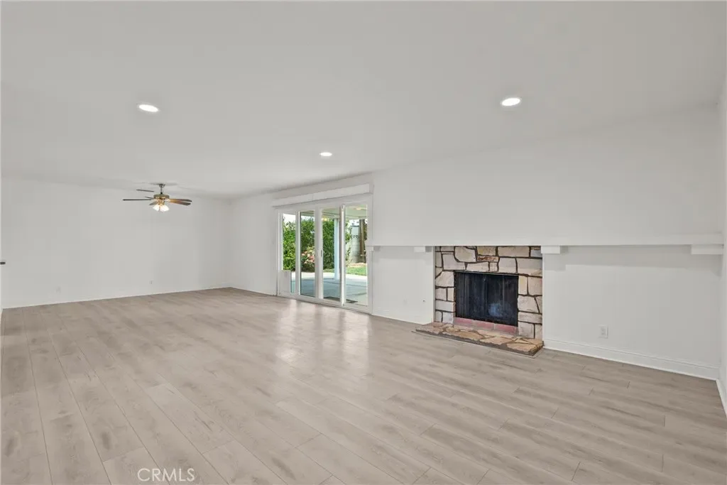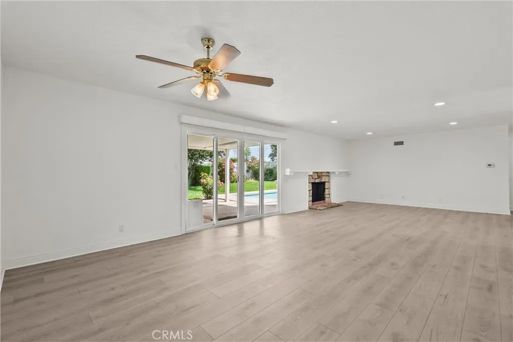 The interior offers a bright, functional layout with granite kitchen countertops, recessed lighting, dual-pane windows with accompanying dual pane sliding doors, and a fireplace in the main living area. Recent updates include fresh interior paint, newer carpet in the bedrooms, and new laminate flooring throughout the main living areas. New GFCI outlets have also been installed throughout the home.