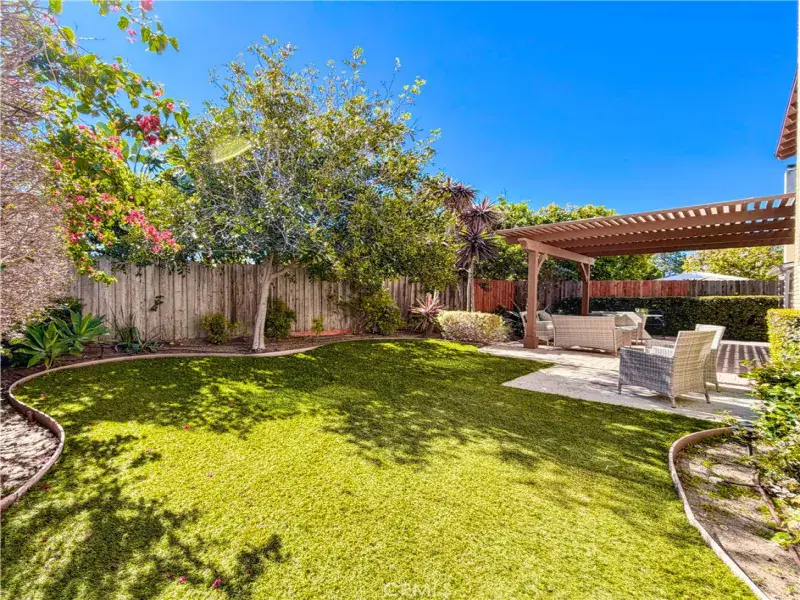 A three-car garage with a dedicated workshop area provides flexibility for storage, hobbies, or projects. The private backyard is thoughtfully designed with mature landscaping and premium synthetic turf for year-round greenery with minimal maintenance.