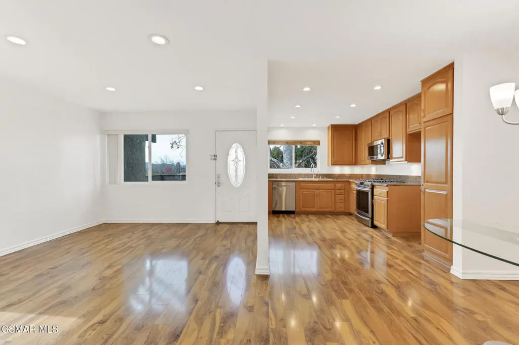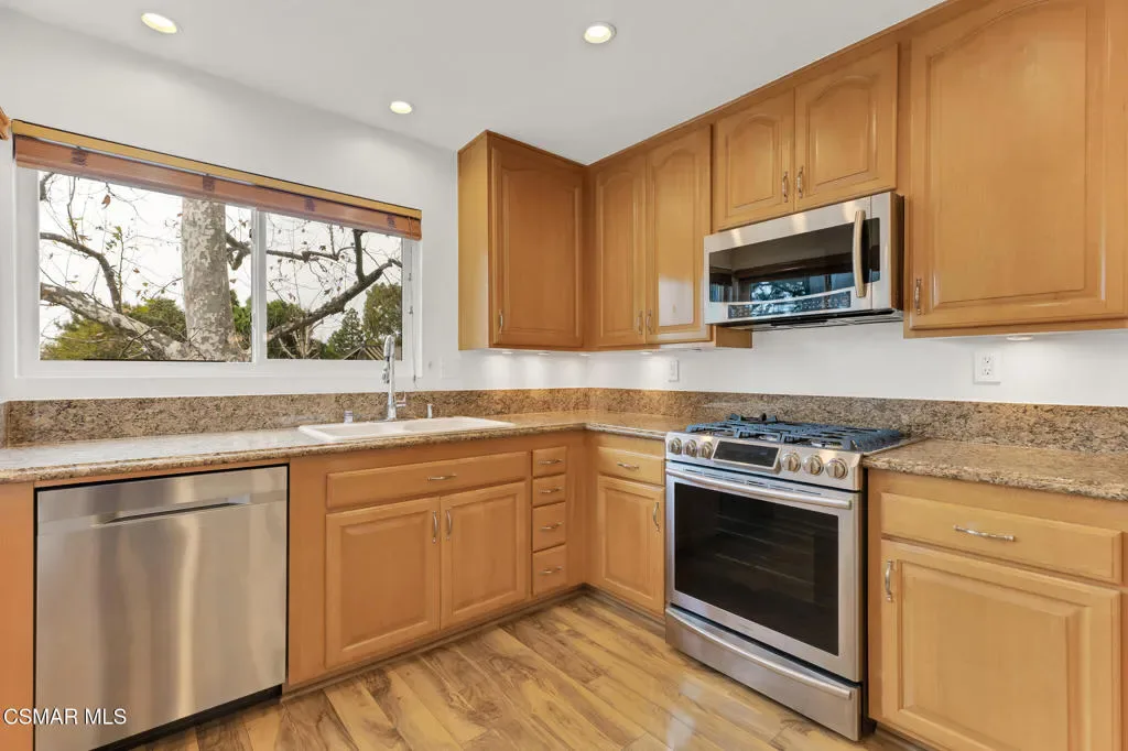 Sunset Views & Serene Wildwood Living AwaitWelcome home to this charming 2nd floor 2-bedroom, 1-bath condo, in an ideal central Thousand Oaks location. Step onto the large, tranquil front porch and take in sweeping vistas of rolling hills and breathtaking sunsets. Inside, thoughtful upgrades shine throughout. The family room is light and bright and feathures a gas fireplace. The kitchen has been remodeled with refaced cabinetry, rich granite countertops, and stainless steel appliances, blending style and functionality. Laminate flooring, smooth ceilings, crisp, fresh interior and exterior paint create a light, modern feel. Every detail has been carefully considered, from the remodeled bathroom with walk-in shower, upgraded front and interior doors, dual-paned vinyl windows, and Hunter Douglas blinds. Enjoy year-round comfort with an updated HVAC system and ducting, ensuring efficiency and peace of mind. Living in Wildwood comes with nearby access to beautiful parks, open space, hiking and biking trails, top-rated schools, and a variety of shopping options. HOA includes paid trash, community pool and clubhouse, and 2 reserved parking spots (one in the carport), making this home an exceptional value.