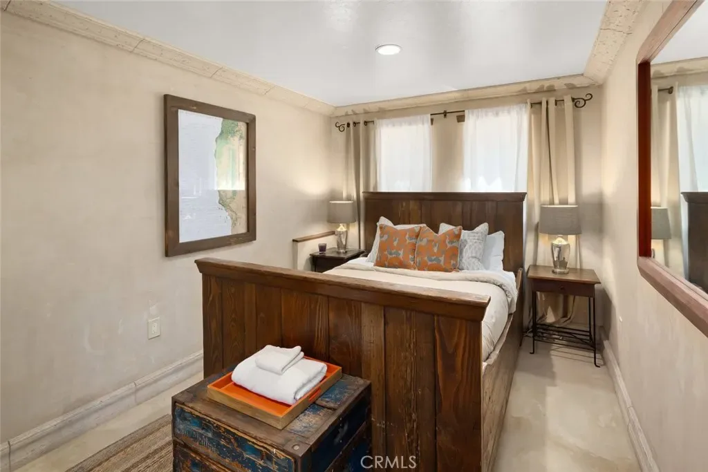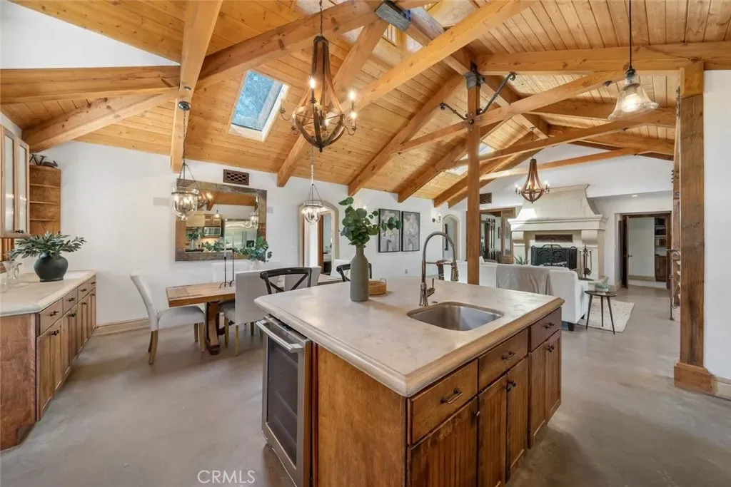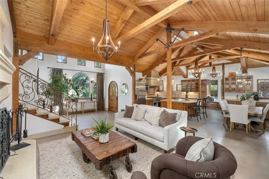 Inside, the home is airy and inviting, highlighted by soaring beamed ceilings, decorative windows, and custom wood-and-metal chandeliers. Concrete floors provide natural cooling, while a dramatic floor-to-ceiling stone fireplace anchors the main living area. Just off the living room, a private office and half bath.