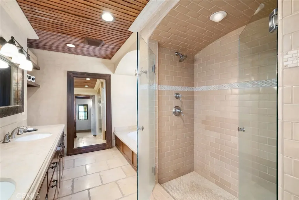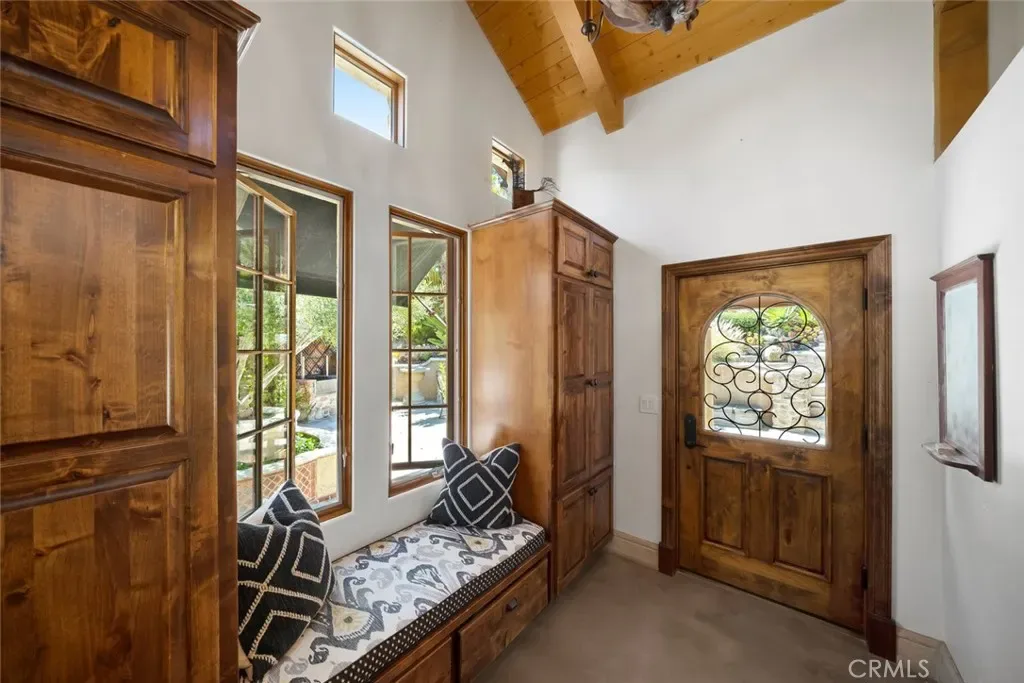 The chef’s kitchen features a gas range with custom hood, oversized Viking refrigerator, expansive center island with prep sink and seating, walk-in pantry, beverage center, and an open dining area . A charming walk-through mudroom with built-in storage and courtyard views connects seamlessly to the outdoor living spaces.