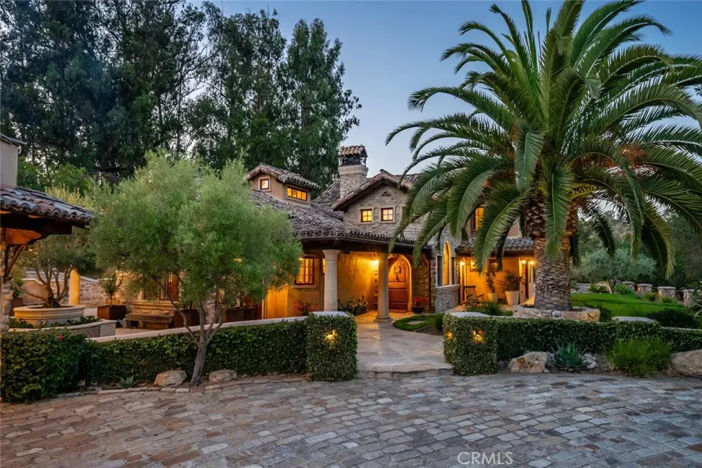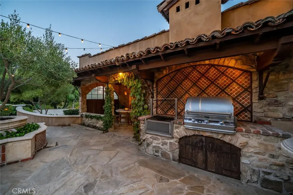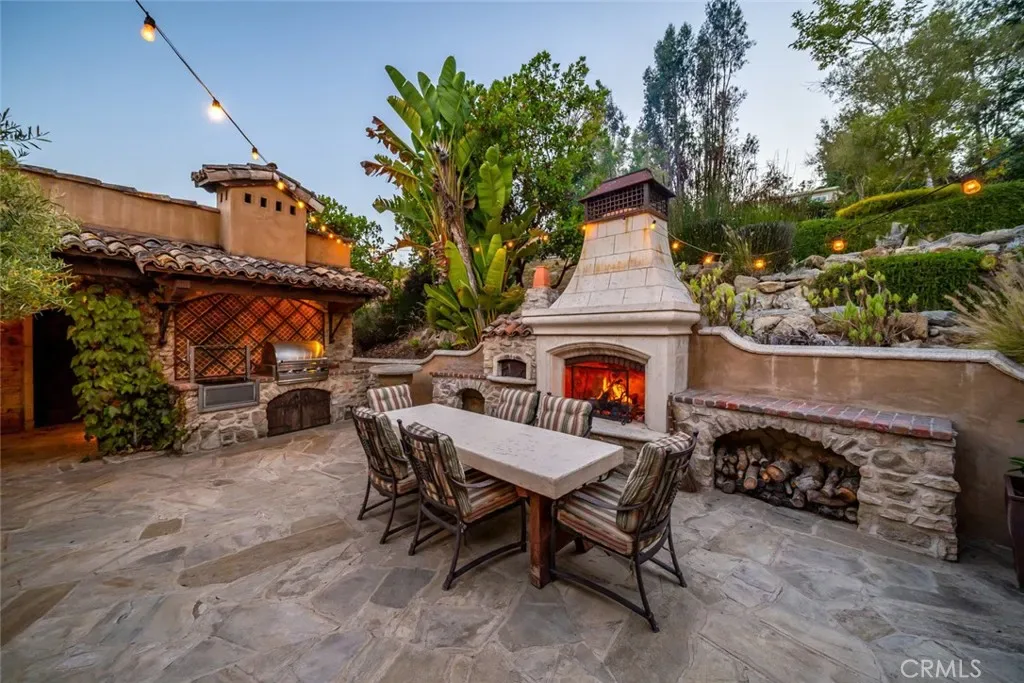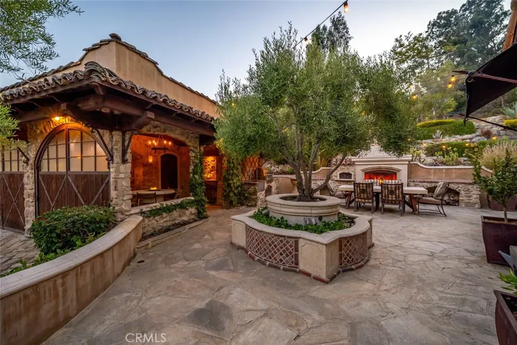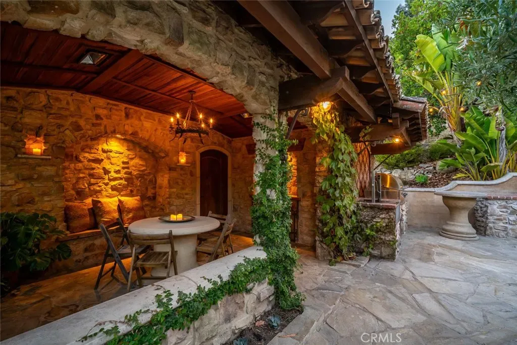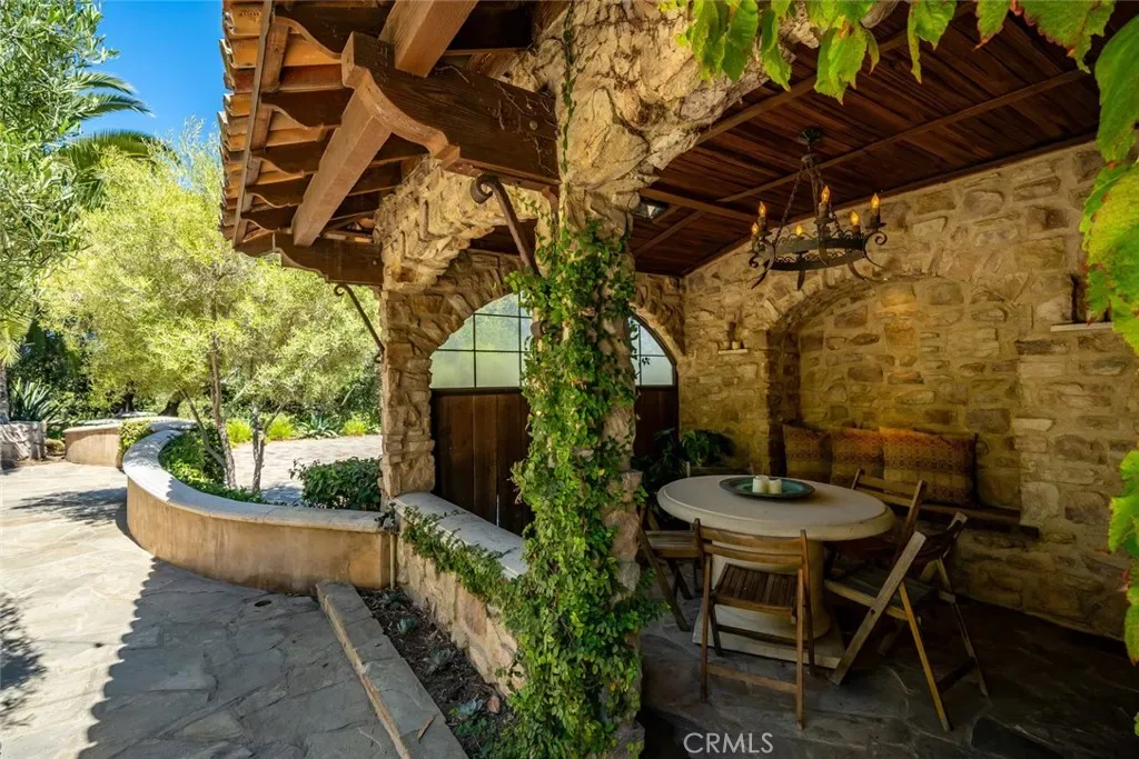 A stone-lined driveway welcomes you to a spacious motor court featuring a detached five-car garage and covered carport—perfect for RVs, trailers, or additional equipment. Low stone walls and manicured hedges guide you toward the main residence, while just beyond the garage a covered patio and workshop overlook a stunning central courtyard. Here you’ll find an outdoor kitchen, wood-fired pizza oven, built-in firewood storage, and a dramatic stone fireplace that creates a warm and inviting gathering space.
